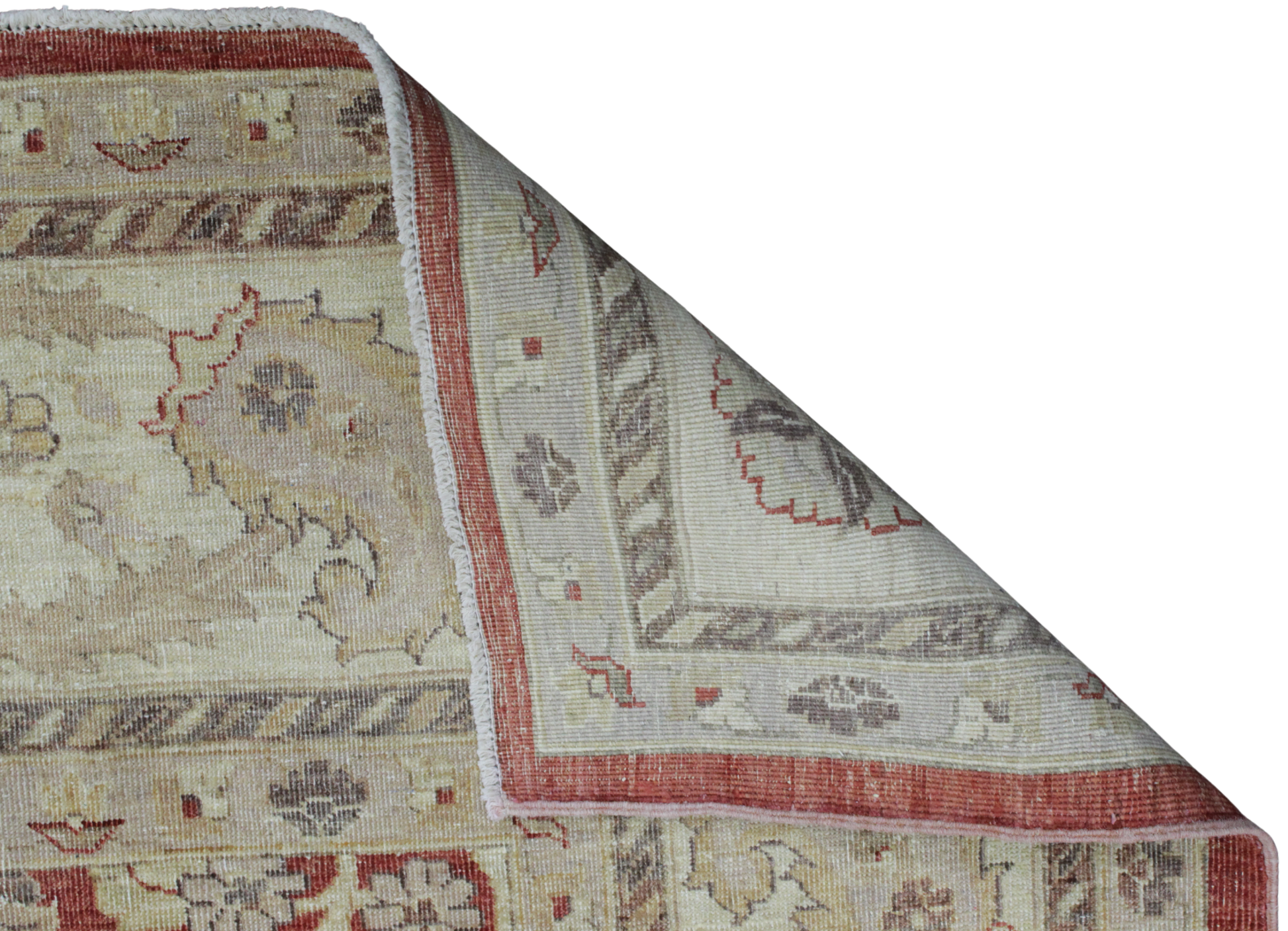 Rich, regal, and timeless — this hand-knotted Oushak rug from Pakistan (9.1 × 11.8 ft) is a bold expression of classic taste. The deep red field is adorned with an elegant array of floral medallions and curving vine motifs, all rendered in a refined palette of ivory, taupe, and muted gold. Its wide border creates a graceful frame with soft contrasts and rhythmic detailing.