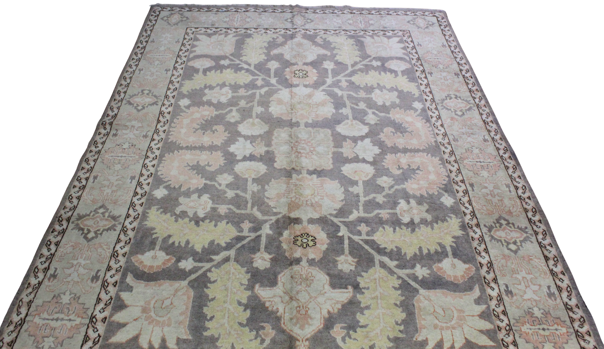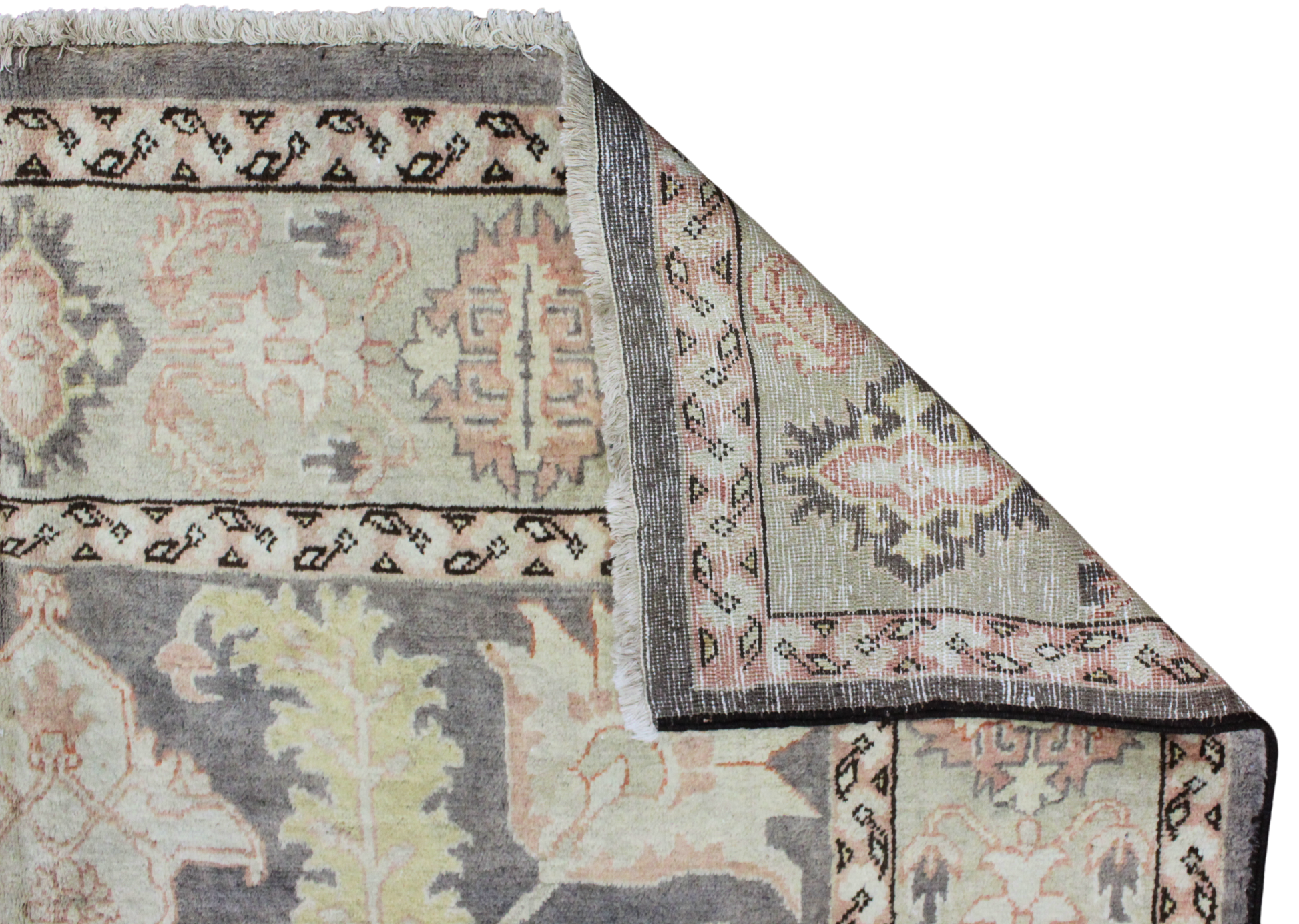 With its broad floral motifs and earthy elegance, this antique Persian Mahal runner (4.2 × 8 ft) evokes the sun-faded beauty of a desert garden in full bloom. The design features stylized palmettes and sweeping floral sprays, rendered in a soft, sandy beige and faded terracotta against a muted olive-gray field. The light-toned border, intricately adorned with angular rosettes, frames the composition with balance and subtle refinement.