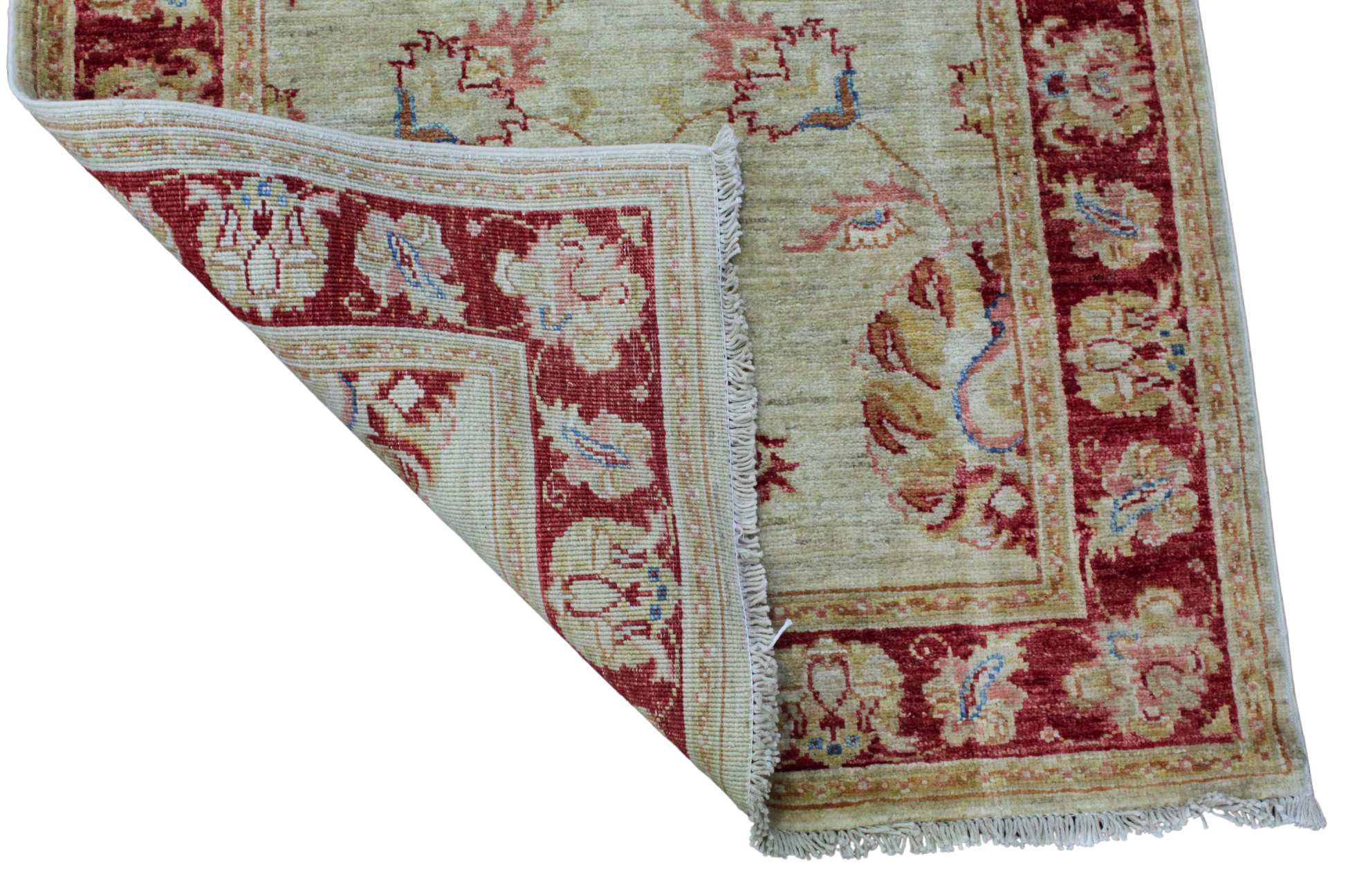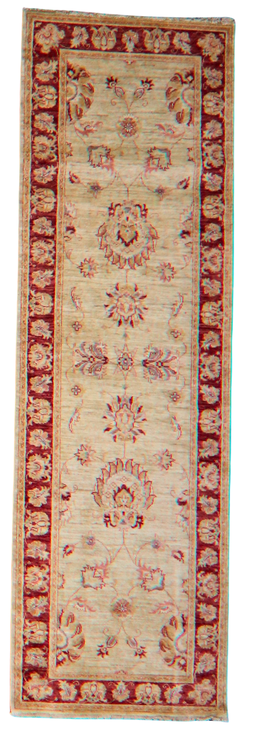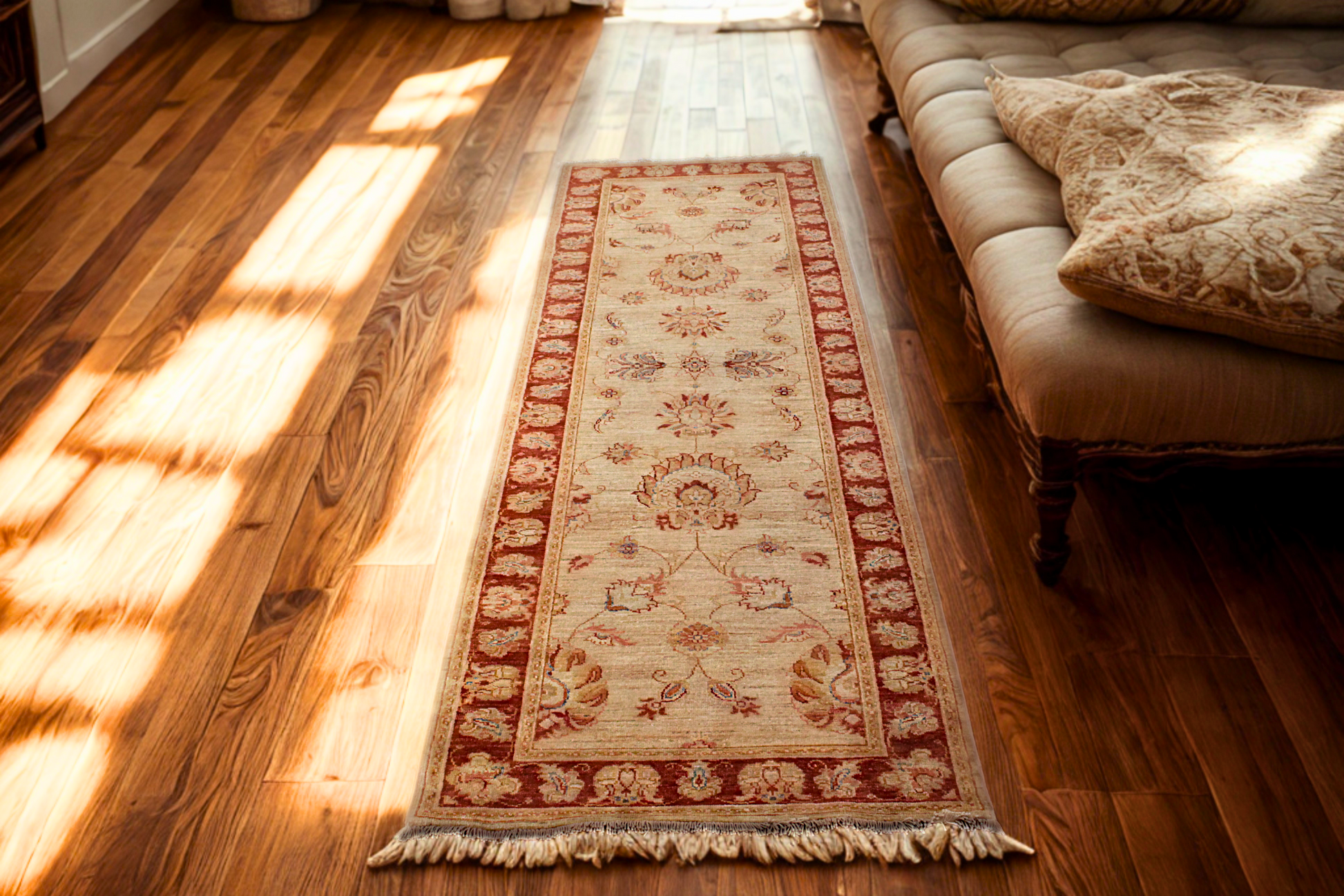This Afghan Oushak runner exudes warmth and traditional elegance with its creamy beige field and striking crimson border. Large-scale floral motifs unfurl in soft rusts, browns, and hints of slate blue, arranged in a rhythmic vertical pattern that leads the eye with grace down the length of the rug. The red border, packed with classic botanical elements, grounds the design while adding a regal accent.