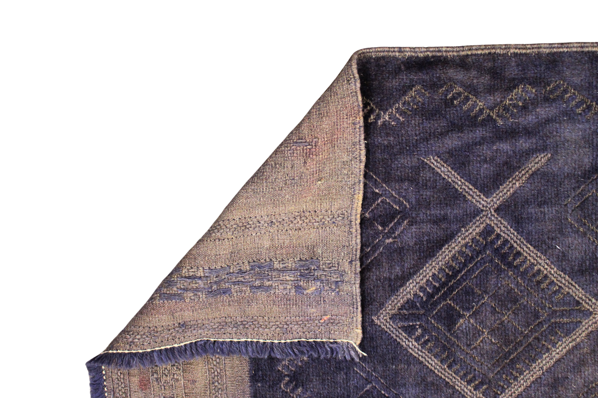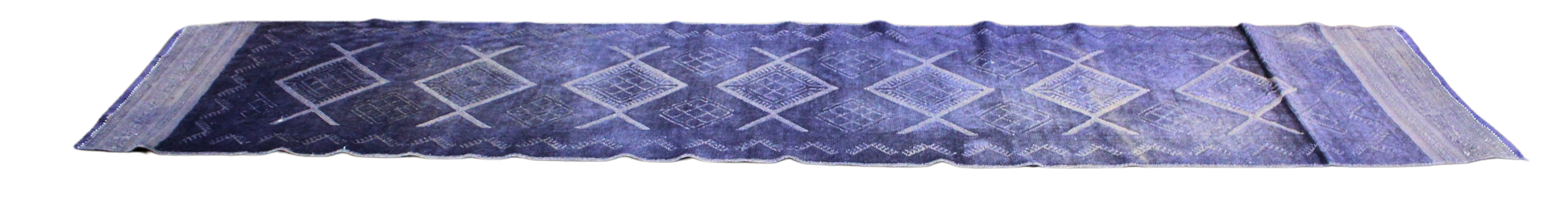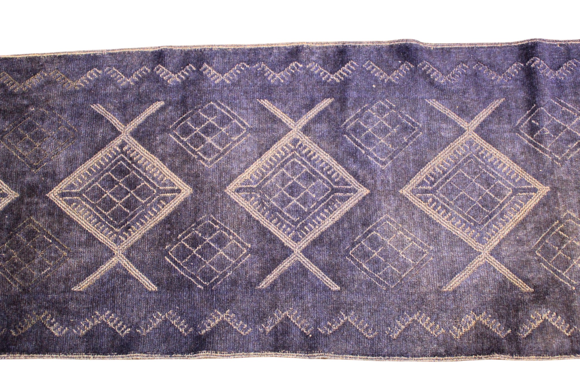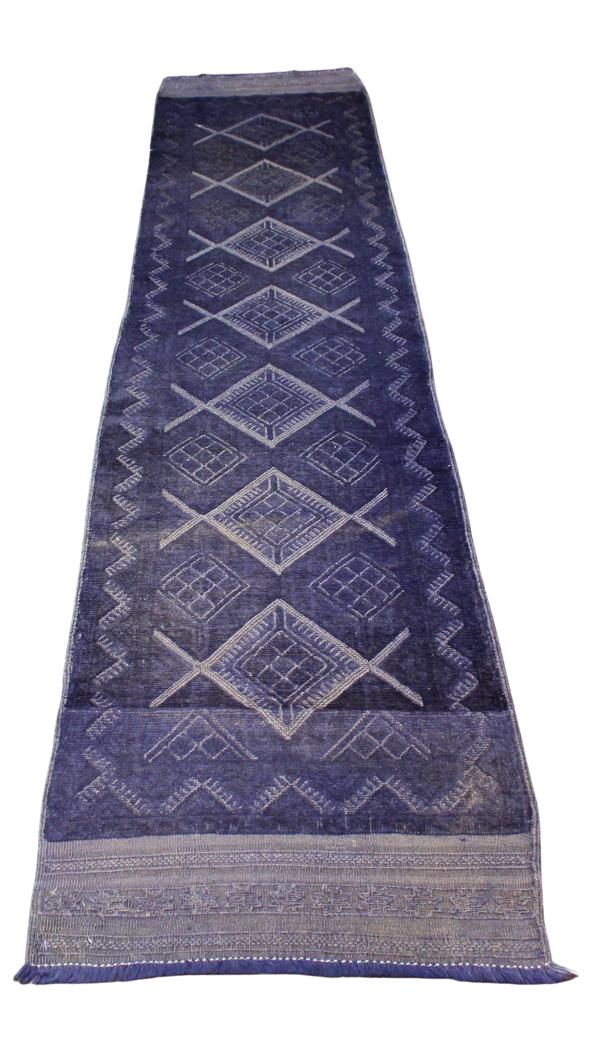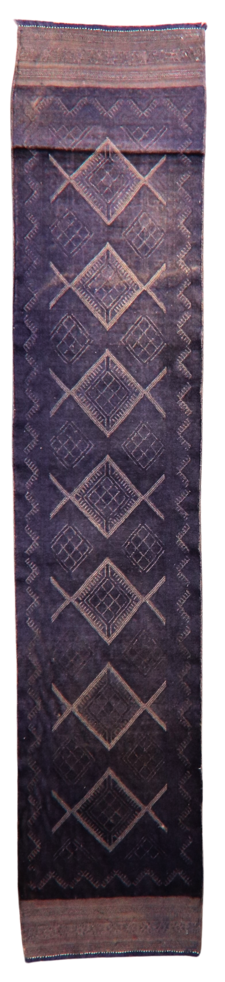 Dark, moody, and quietly commanding — this 2.3 x 10.10 ft Afghan Shaal Kilim runner captivates with its rich indigo tone and minimal diamond geometry. The handwoven wool flatweave features a linear chain of large and small diamonds running down the center, flanked by stepped zigzag borders. The pattern is understated, revealed through the texture and sheen of the weave rather than contrasting color, making it a sophisticated choice for modern and earthy interiors alike.