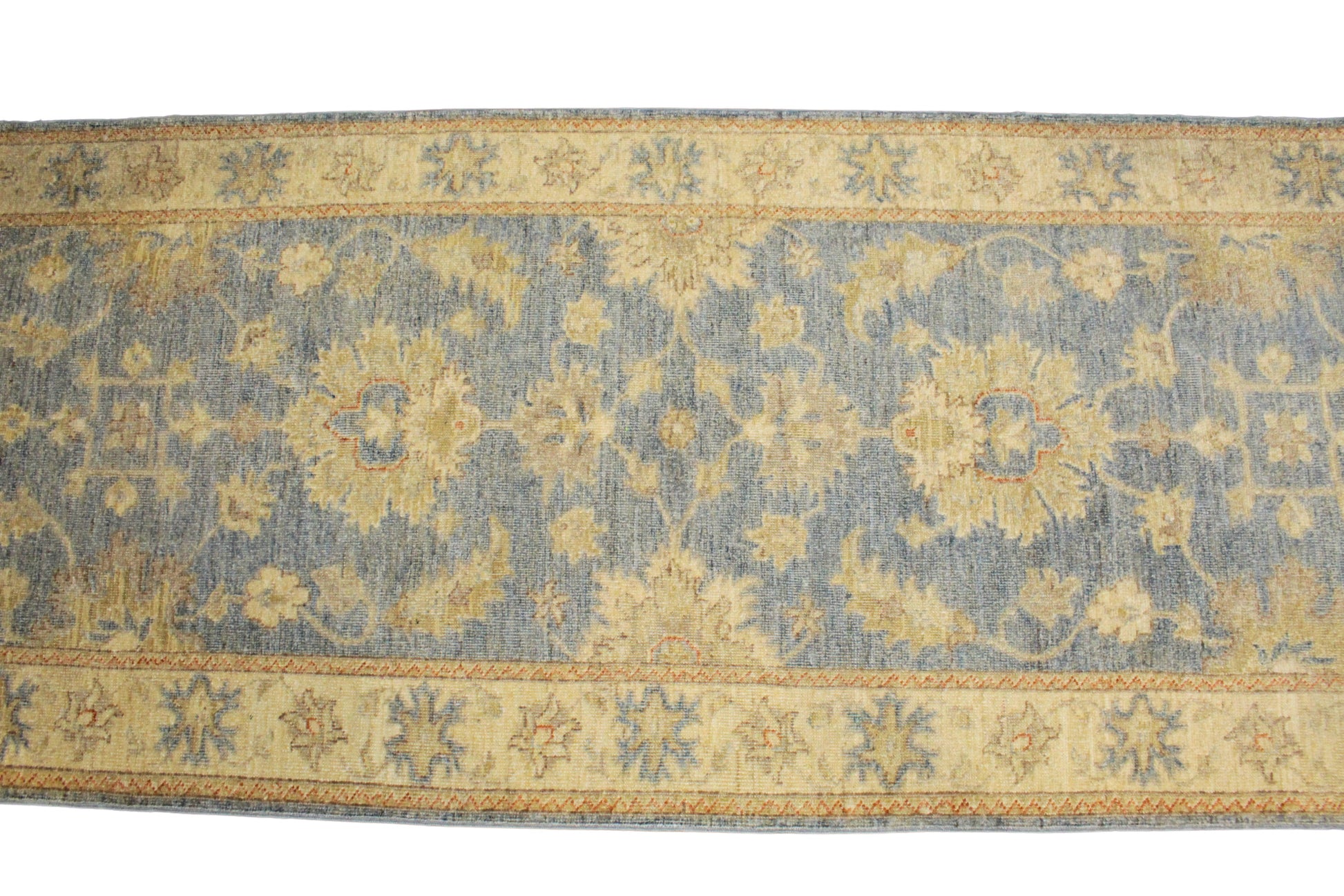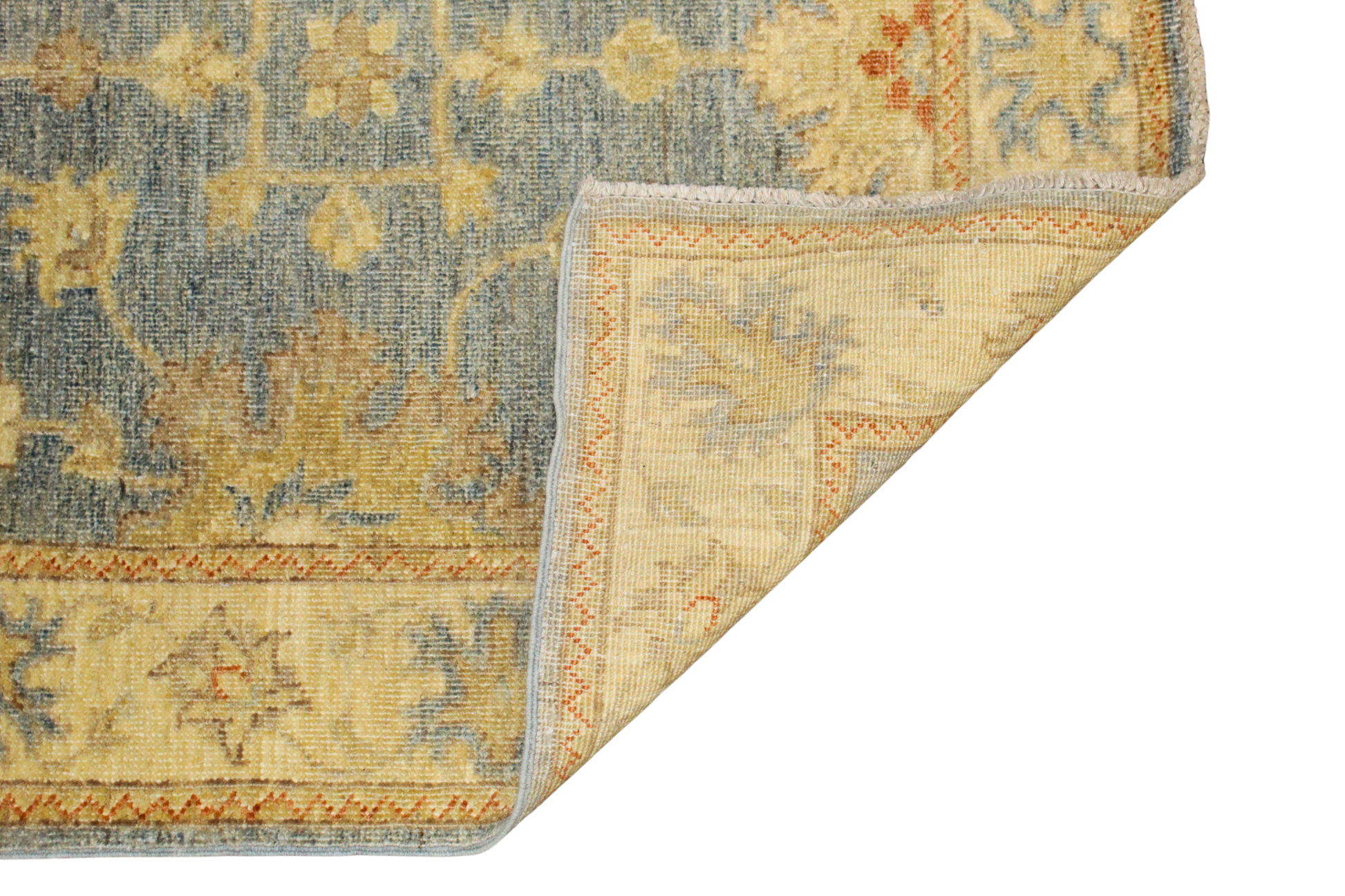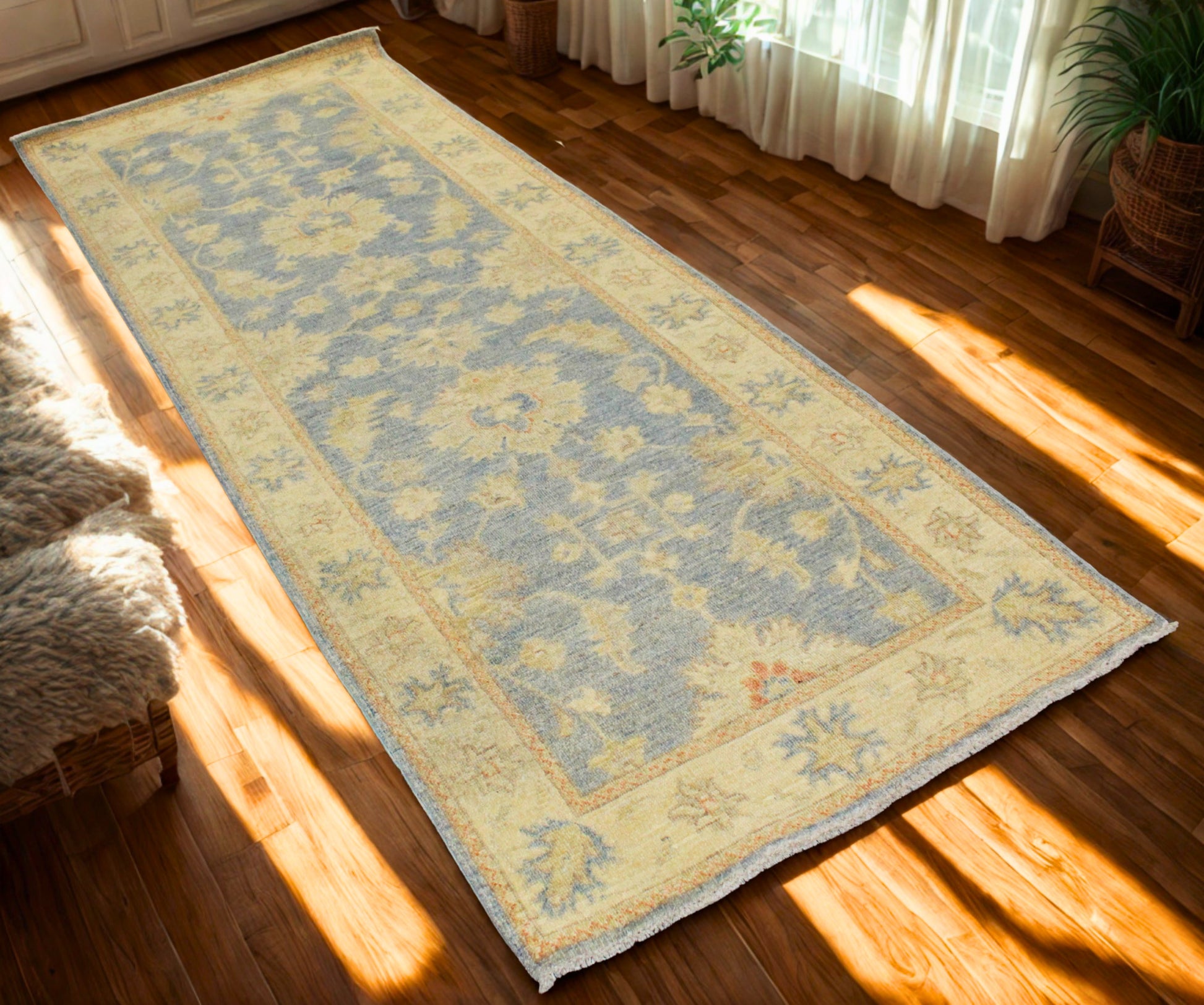 Soft as a breath of morning air, this Oushak runner from Pakistan exudes calm elegance with its muted slate blue field and delicate floral motifs in pale ivory, faded terracotta, and soft wheat. The classic border design frames the rug with a quiet formality, while the wool pile lends a gentle texture underfoot.