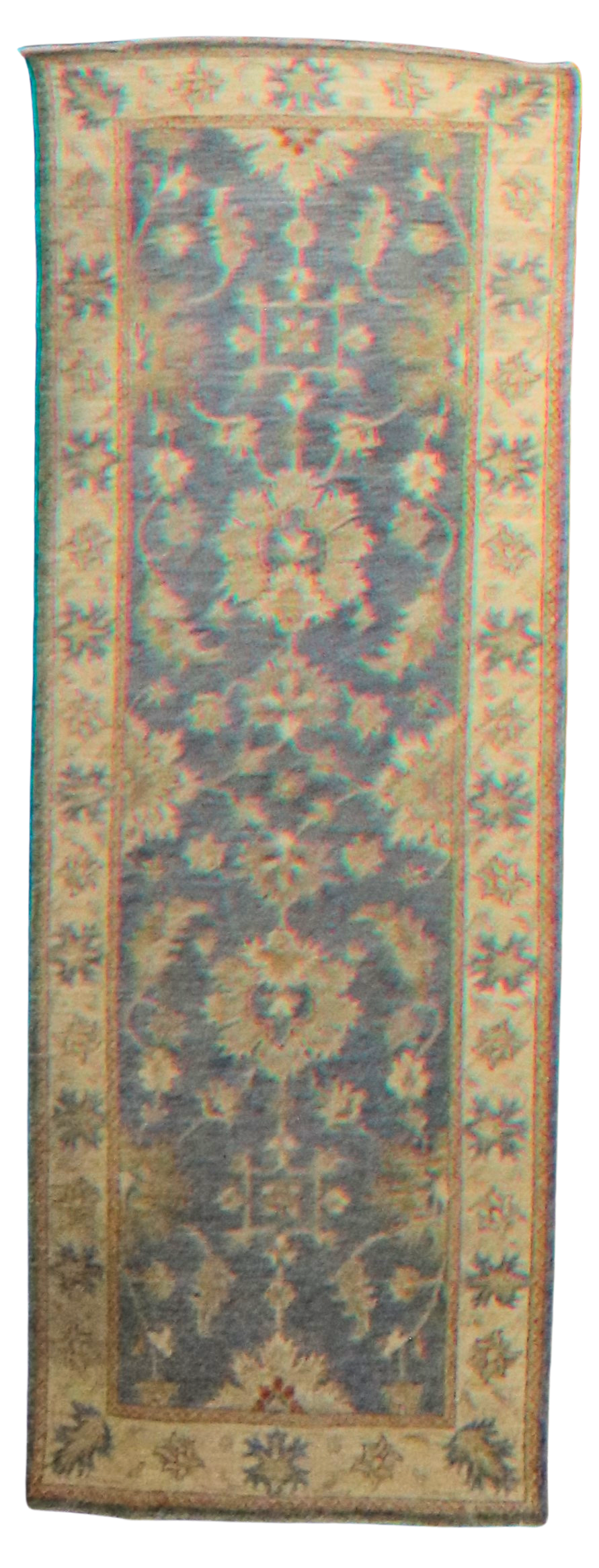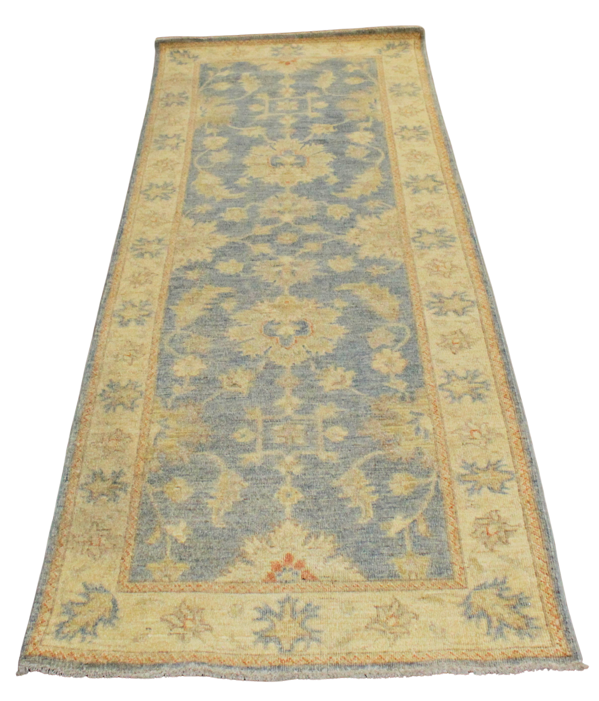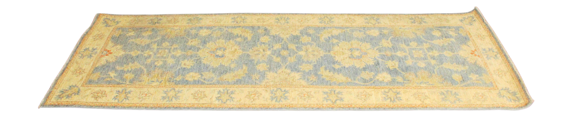 Soft as a breath of morning air, this Oushak runner from Pakistan exudes calm elegance with its muted slate blue field and delicate floral motifs in pale ivory, faded terracotta, and soft wheat. The classic border design frames the rug with a quiet formality, while the wool pile lends a gentle texture underfoot.