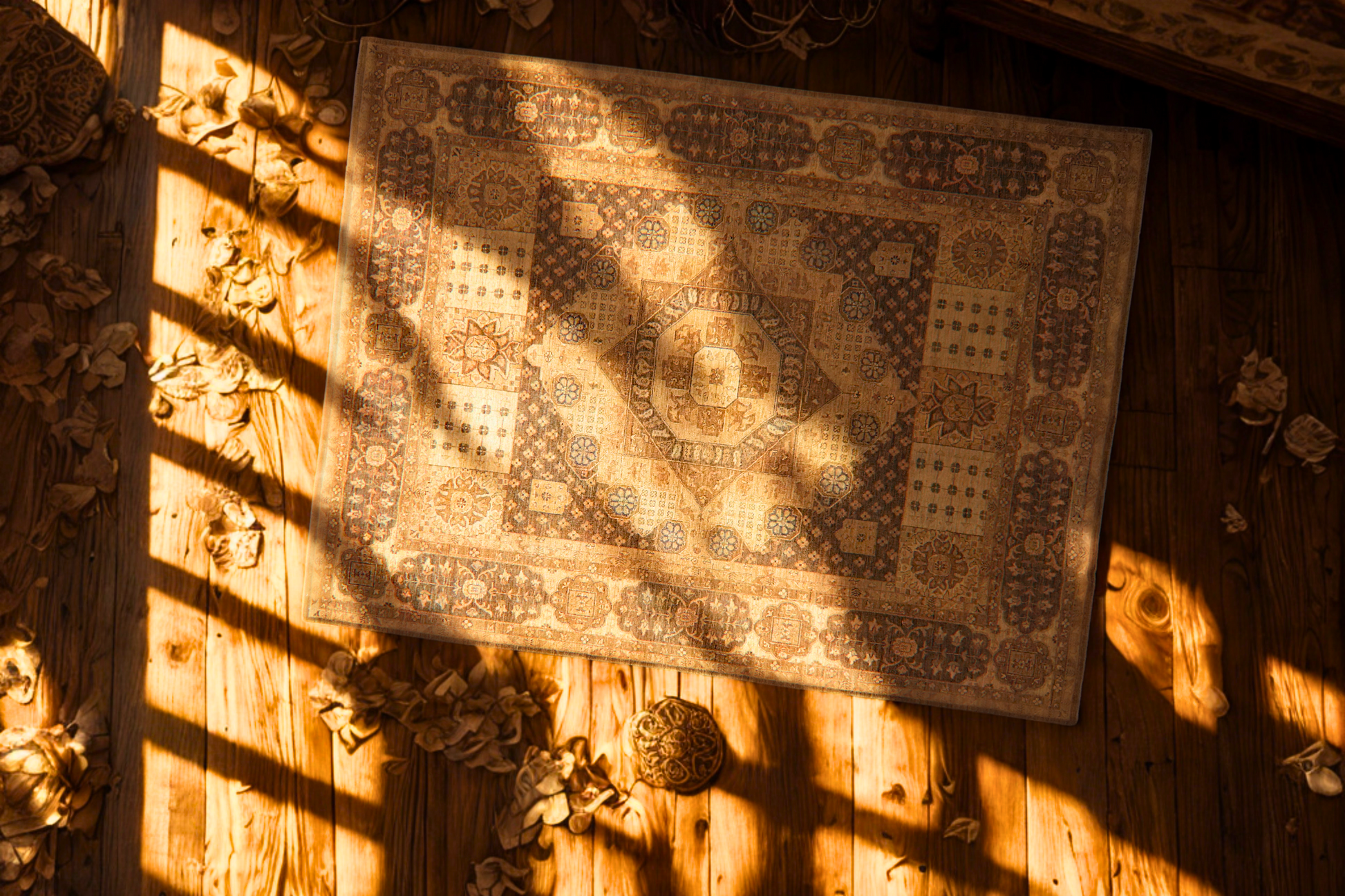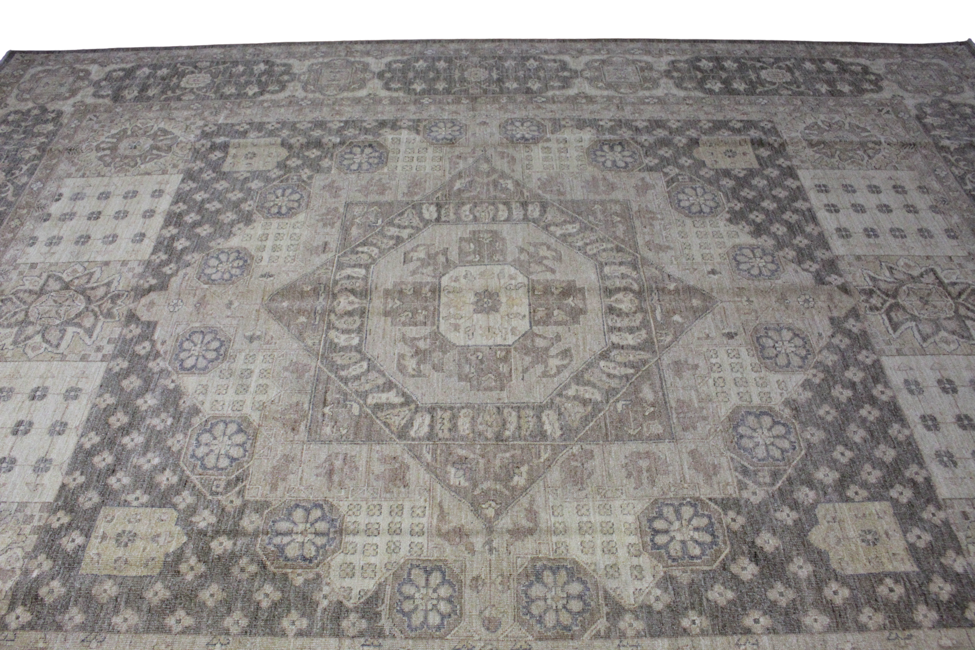 This Oushak rug from Pakistan (8.10 × 11.8 ft) breaks away from tradition with a rare geometric medallion layout and tribal block motifs, arranged in a repeating tapestry-like formation. Rendered in aged tons of sandstone, dusty olive, and faded clay, it blends structure with subtle movement. The stepped diamond centerpiece is framed by botanical medallions and dotted gridwork, giving the piece an almost architectural presence.