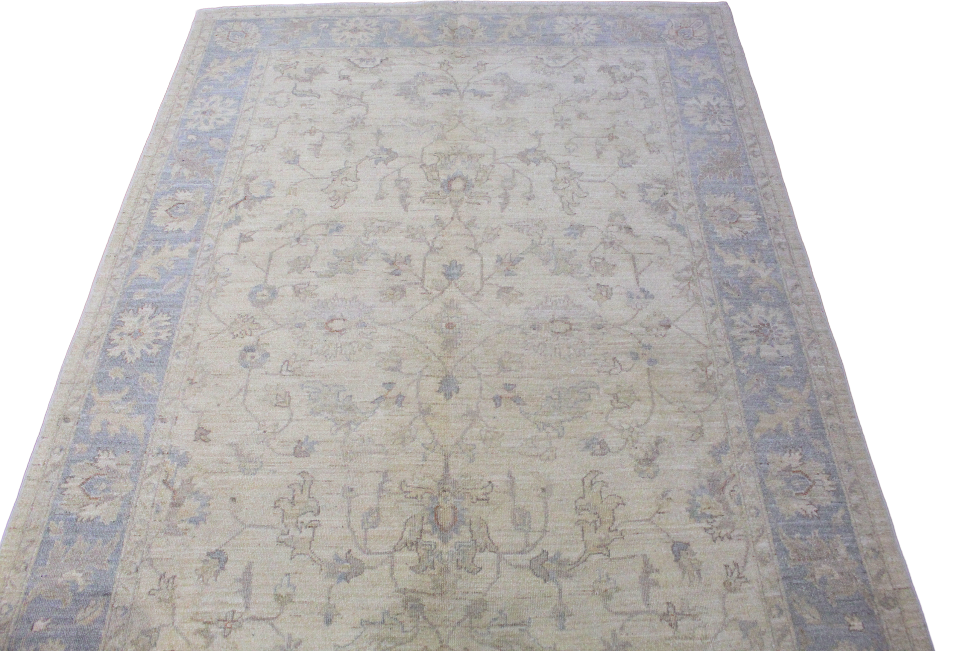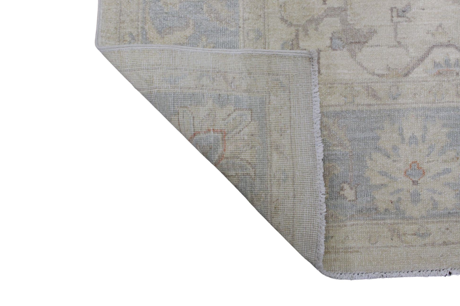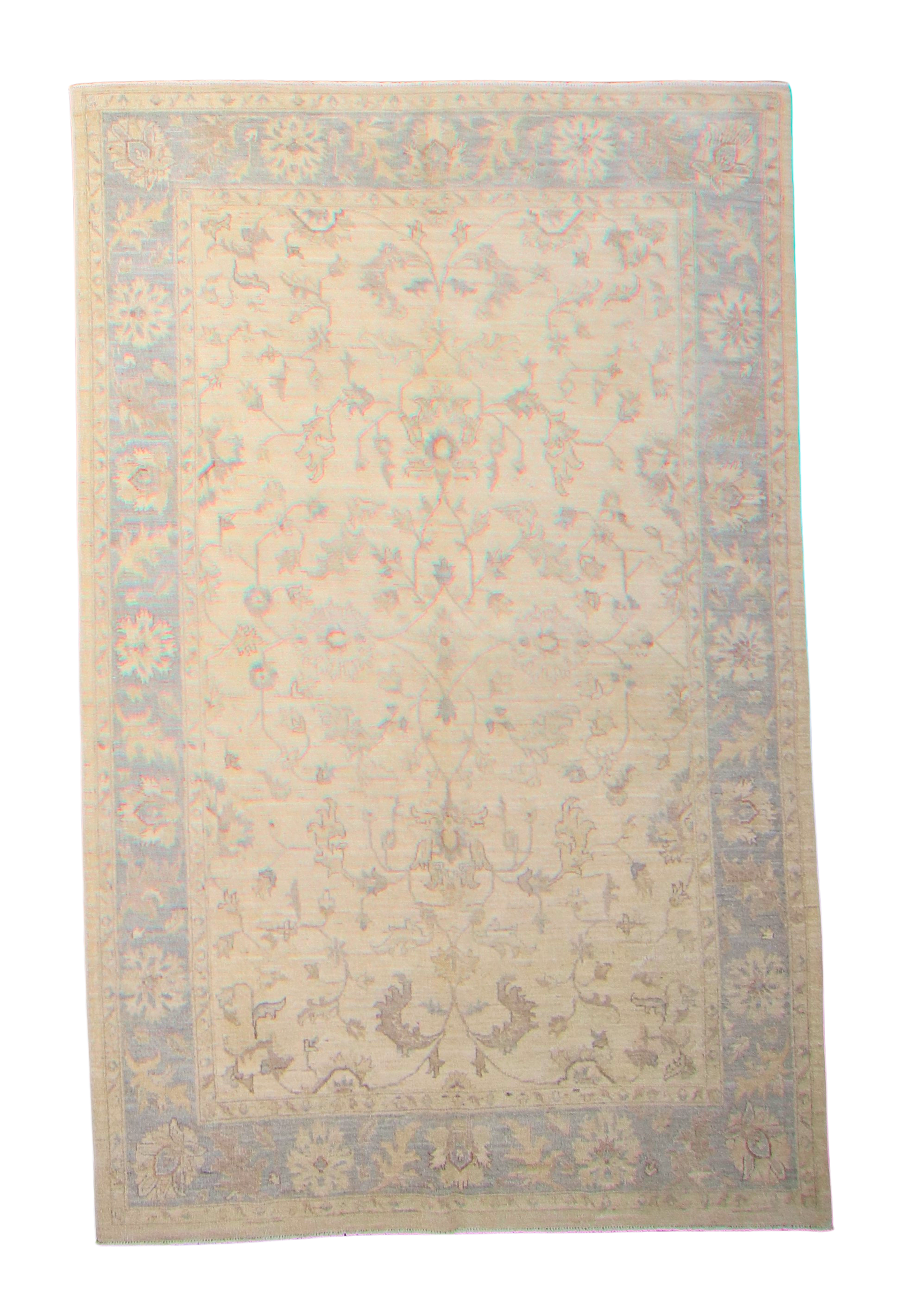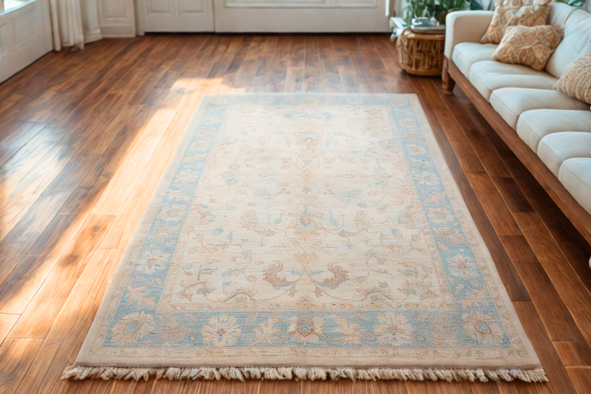 This light and ethereal Oushak rug from Afghanistan captures the essence of subtle elegance. Its soft ivory field is delicately overlaid with faded floral vines and palmettes, unfolding in a symmetrical, classical arrangement. The cool blue-gray border, adorned with oversized rosettes and stylized lotus motifs, adds just the right amount of contrast, creating a quiet frame that gently grounds the piece.