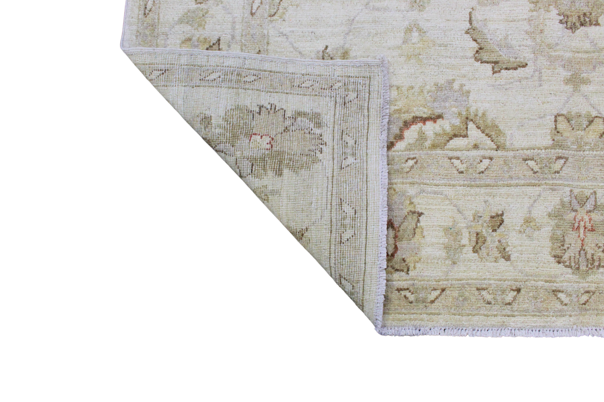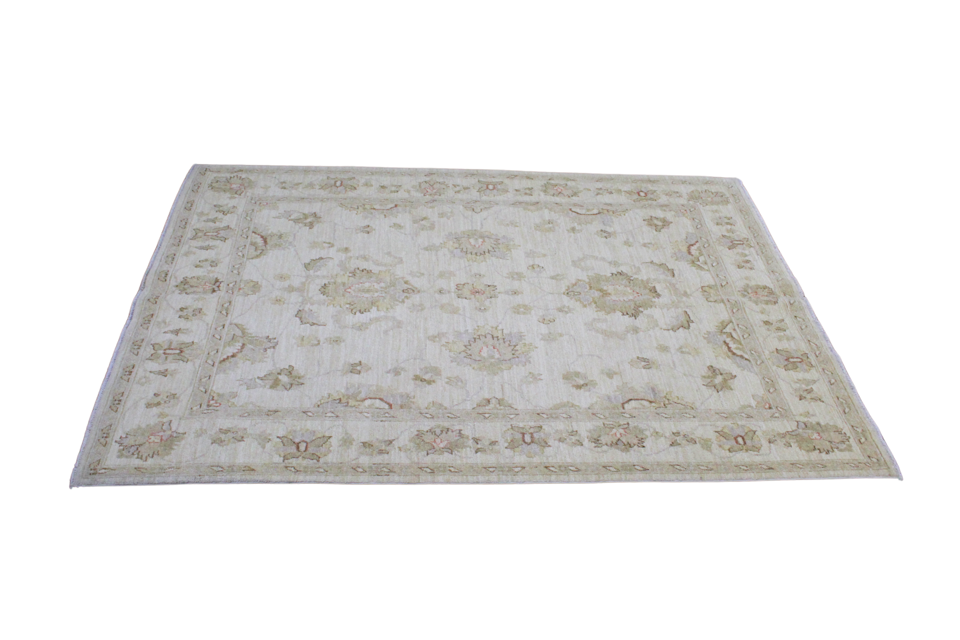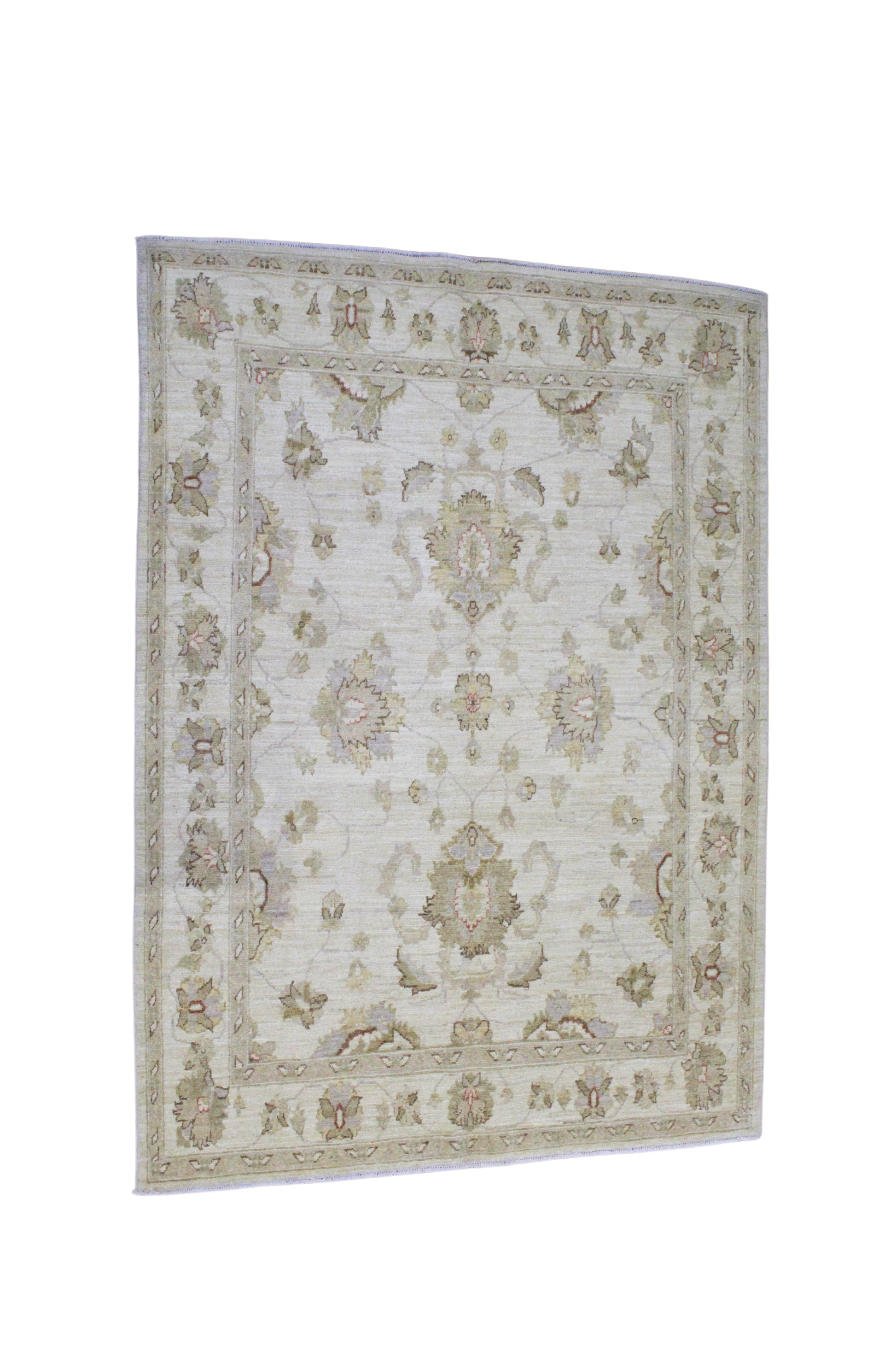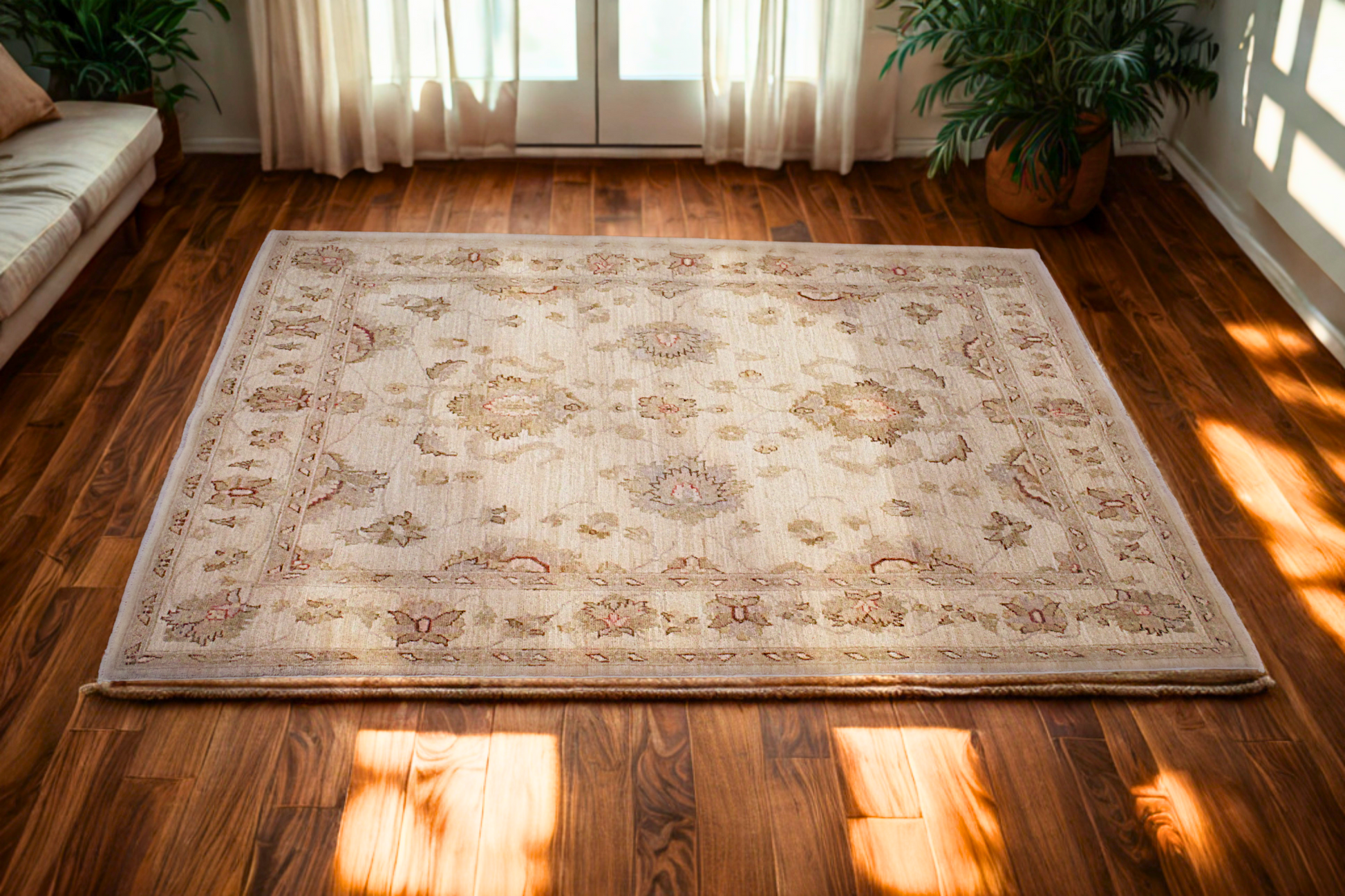 Rug 2278 is a 4.11 x 6.11 hand-knotted Oushak rug from Pakistan, offering an elegant composition of soft neutrals and refined design. Its ivory-beige field is gently adorned with classic Oushak floral and medallion motifs in muted taupe, sage, and sandstone tones. The wide border features a repeating botanical pattern that frames the piece with subtle structure, while the gently distressed finish enhances its antique-inspired character.