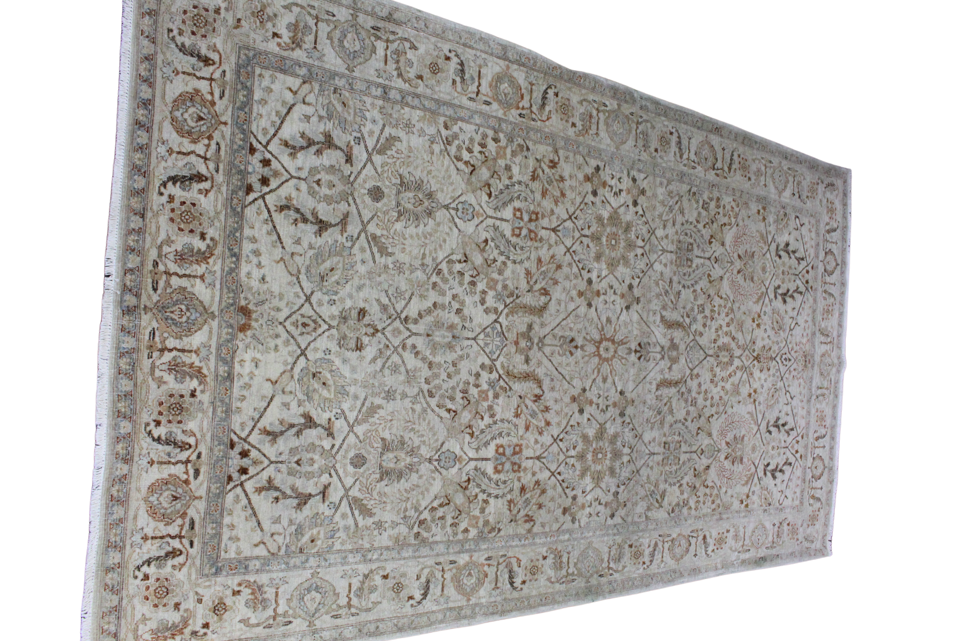 Showcasing the elegance of traditional craftsmanship, this 4.9 × 8.5 ft Farahan rug from Pakistan is a masterpiece of quiet sophistication. The rug features an intricately rendered lattice of floral medallions and stylized palmettes, anchored by a finely detailed border. A moody palette of charcoal, olive-gray, and muted beige offers a rich yet understated aesthetic, perfect for transitional or classical interiors.