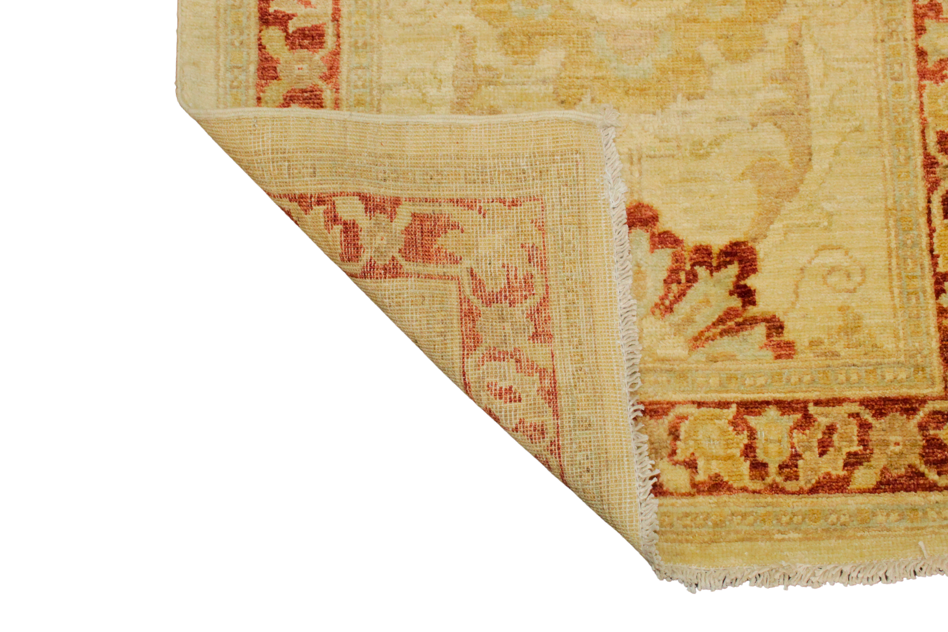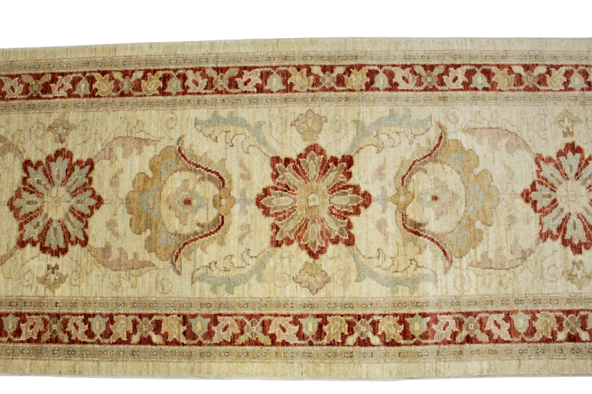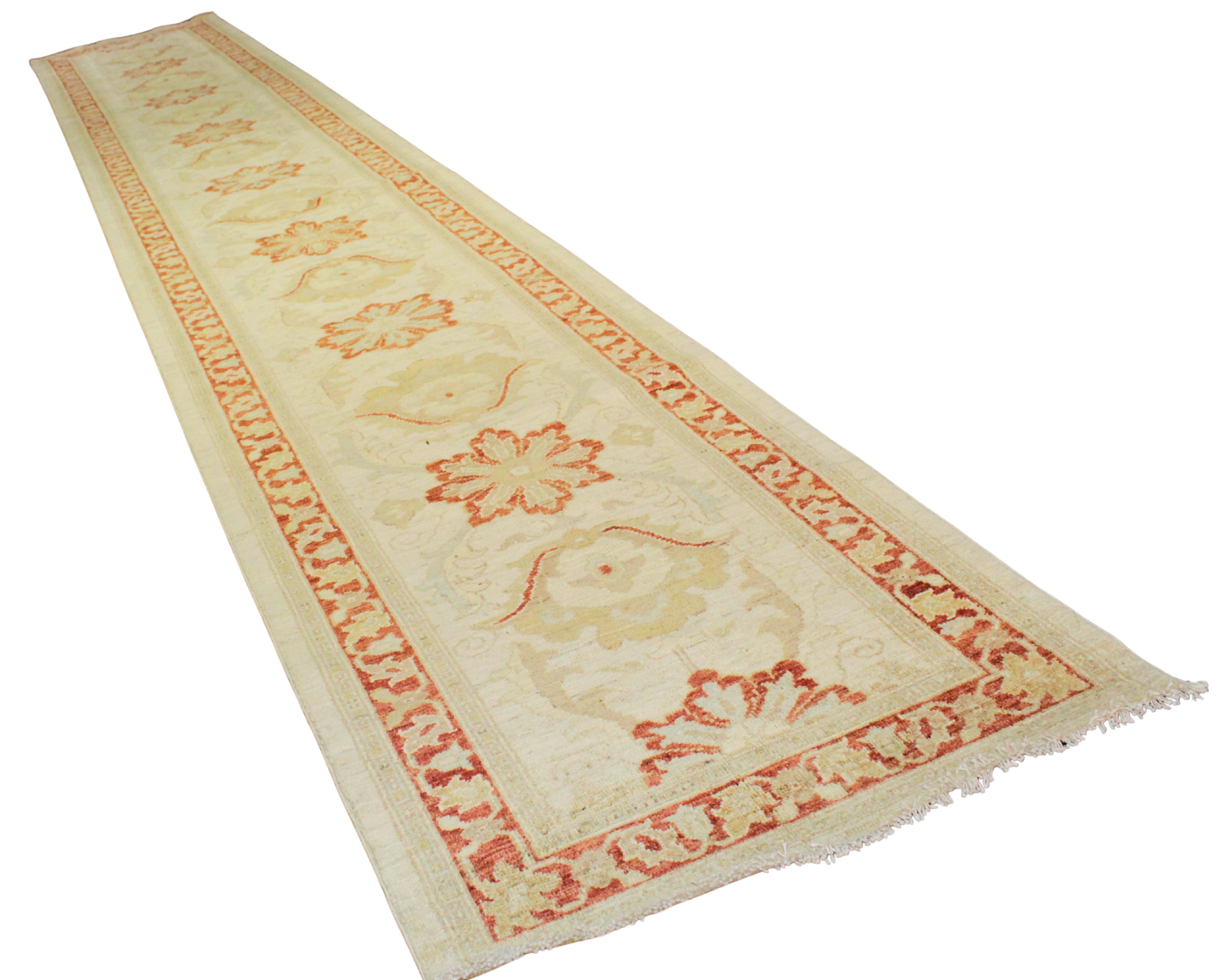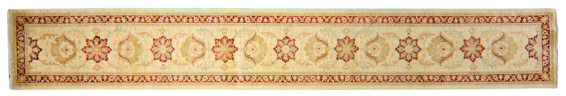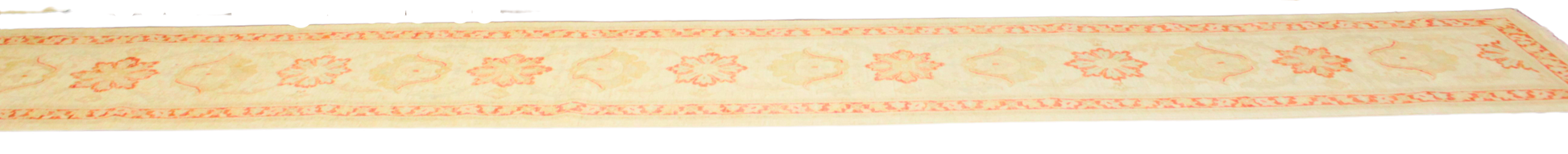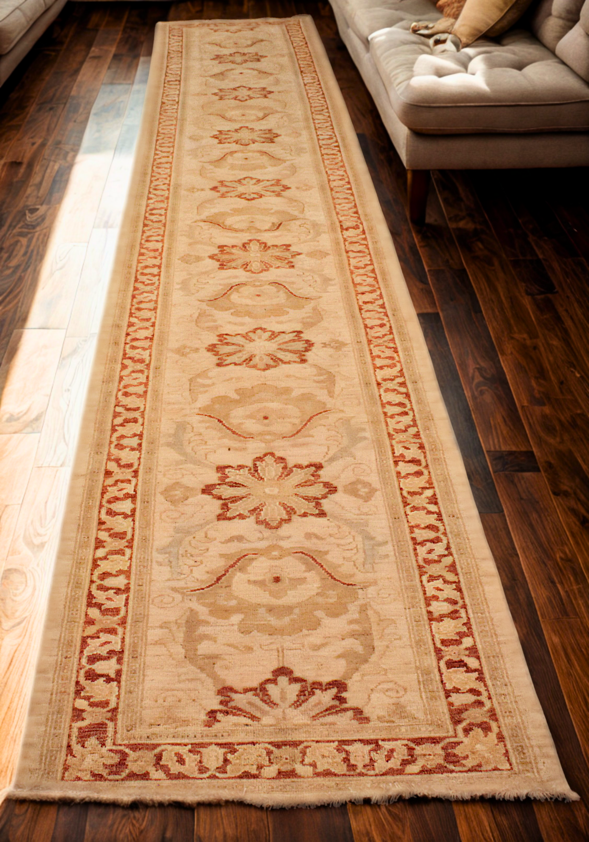 Elegant in length and rich in quiet drama, this hand-knotted Oushak runner (2.7 × 17.5 ft) from Pakistan stretches across space with a graceful rhythm of floral medallions and scrolling motifs. The field, rendered in a soft parchment ivory, provides a luminous stage for the striking crimson and muted olive tones that animate the design.