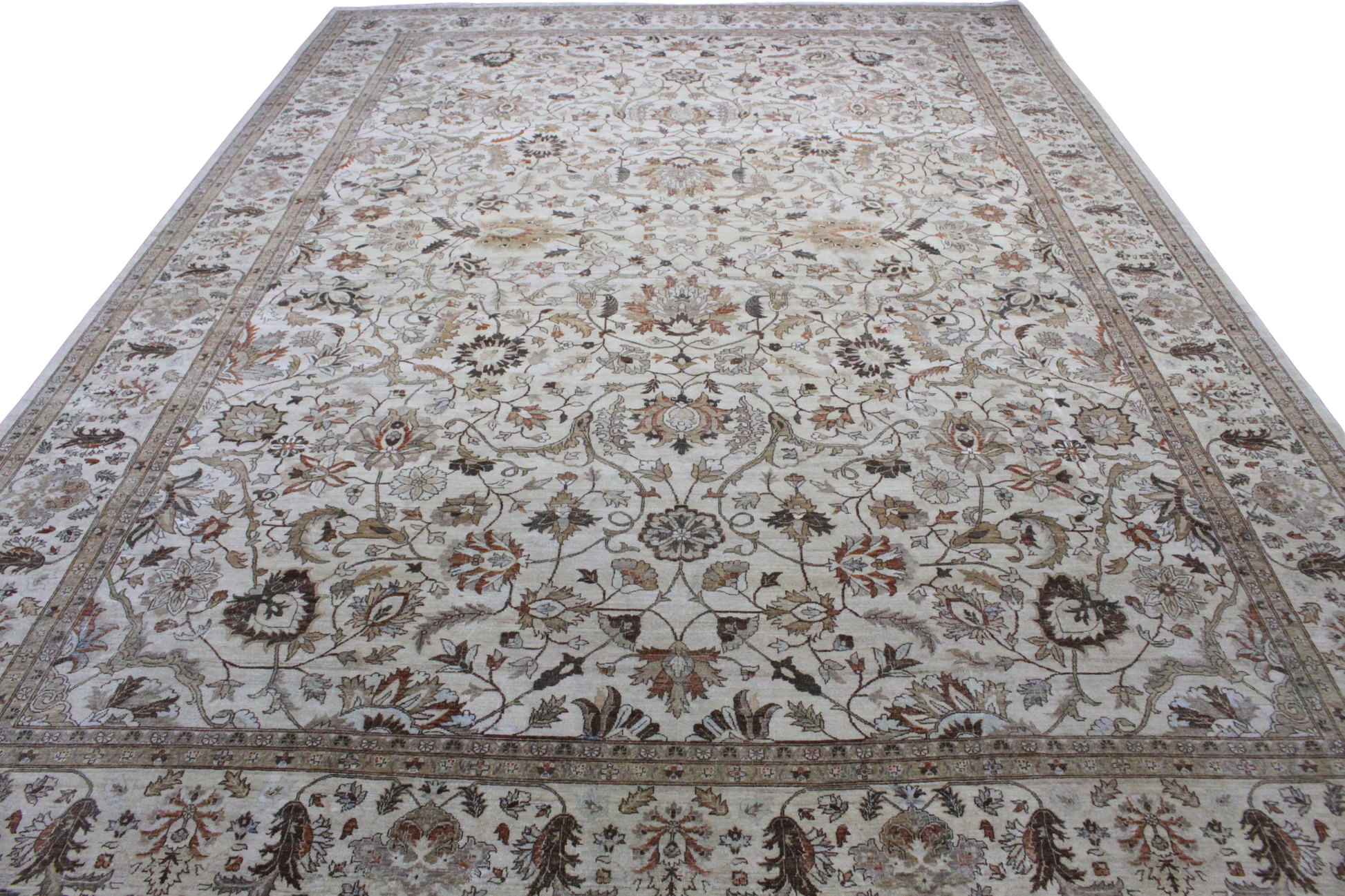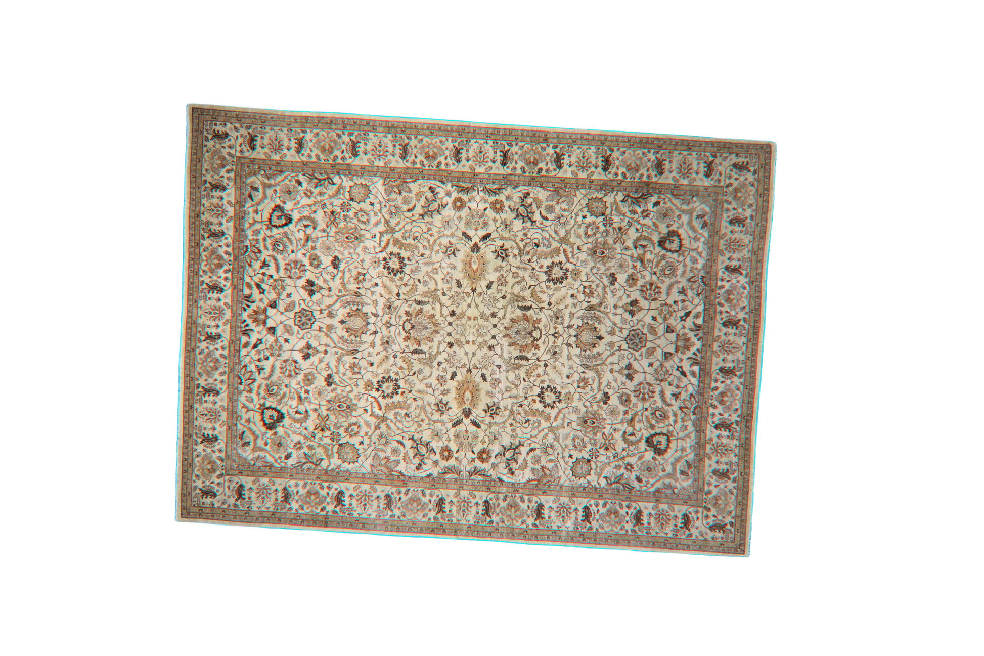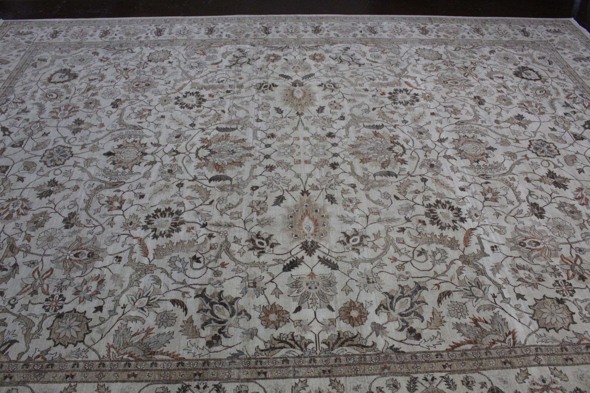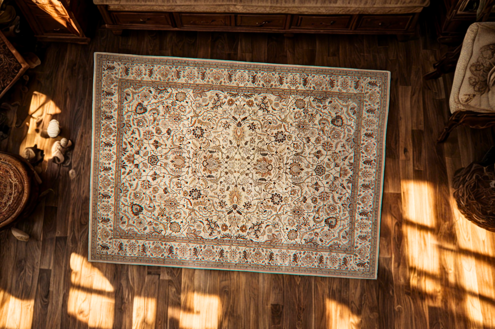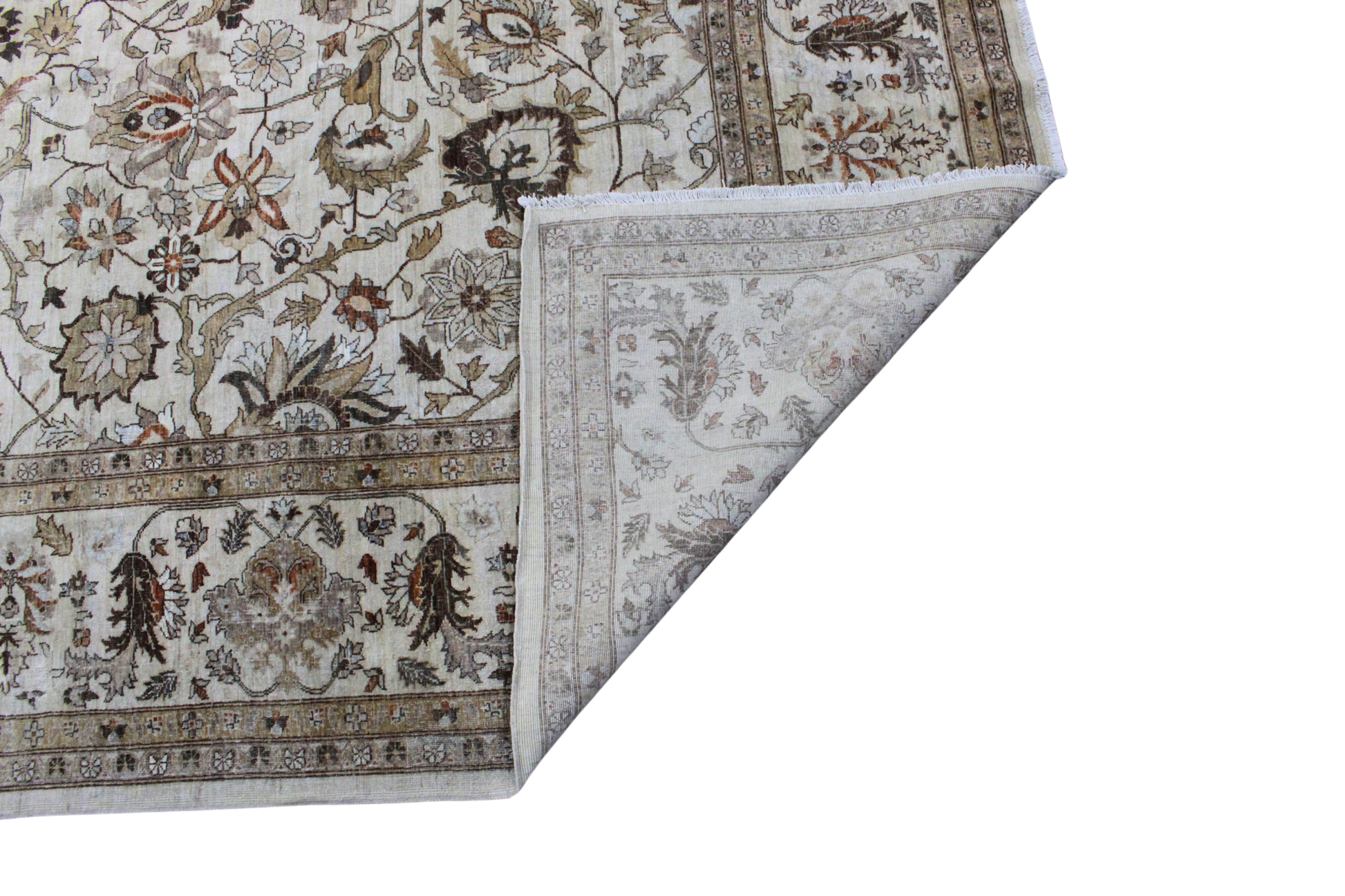 Intricate and impeccably balanced, this Afghan Hatatili rug is a celebration of classical Persian design with fine detailing and high-contrast elegance. A refined ivory field is filled with a lush tapestry of symmetrical vines, rosettes, palmettes, and arabesques in rich tones of walnut brown, burnt umber, soft rose, and muted sage. The central medallion blends organically into the floral field, creating harmony without harsh contrast.