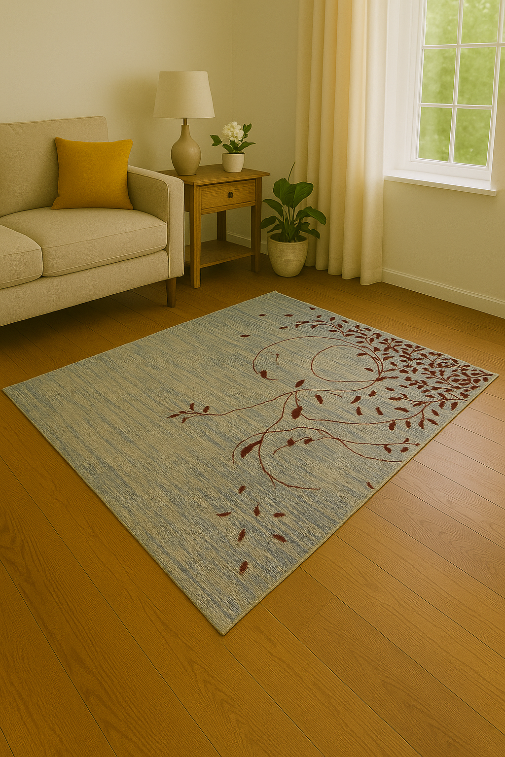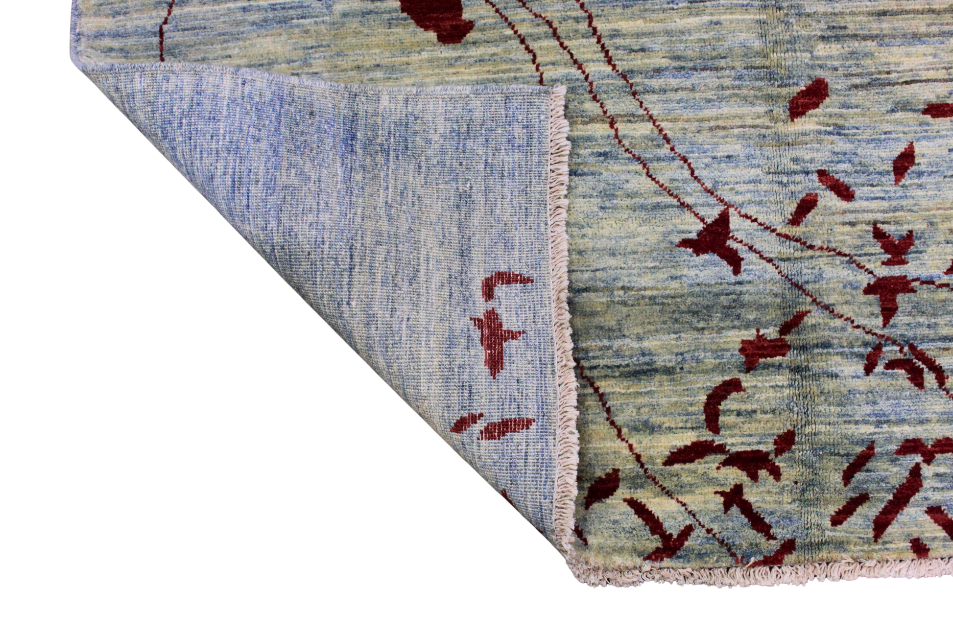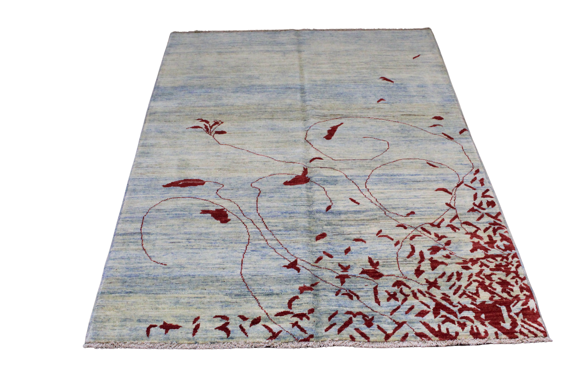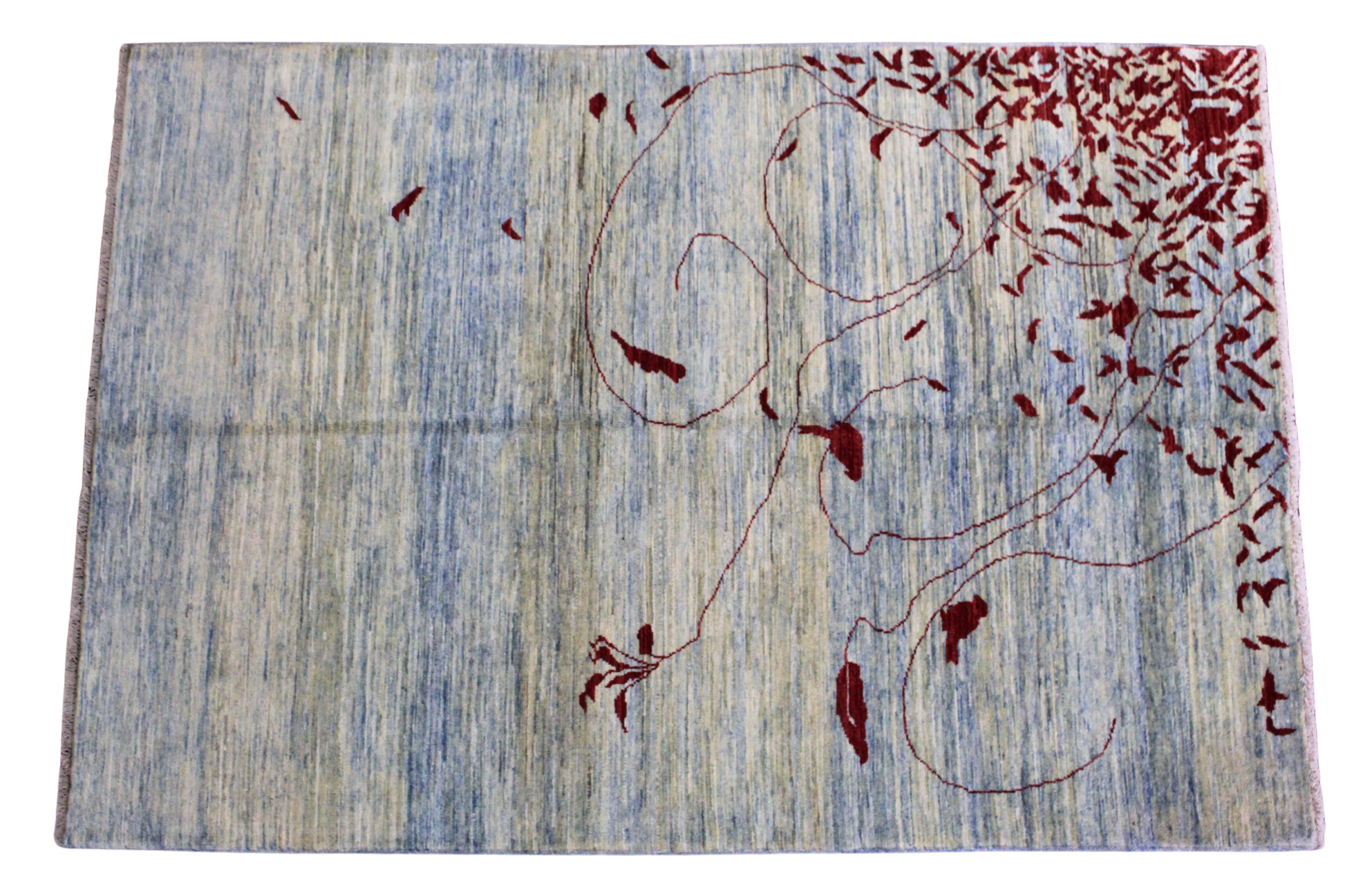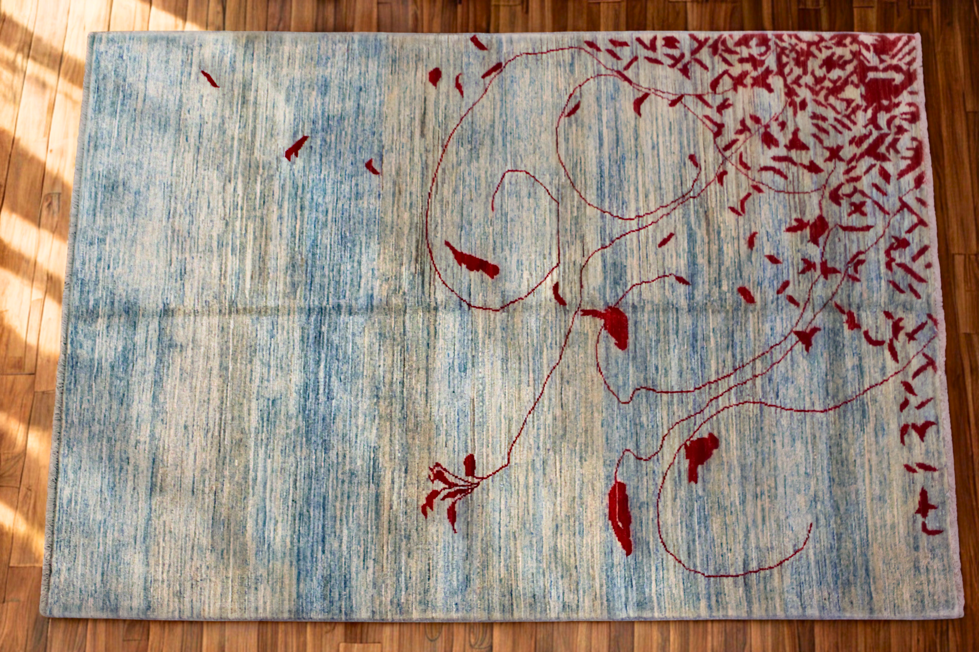 Rug 2396 is a 3.11 x 5.9 hand-knotted Oushak rug from Pakistan, reimagined through a strikingly modern lens. Set on a soft, variegated blue field, this piece features a sweeping vine-like motif and scattered leaves in rich, deep crimson—concentrated in one corner and drifting playfully across the surface. The asymmetry and open space evoke a sense of movement and balance, creating a visual experience that’s at once serene and expressive.