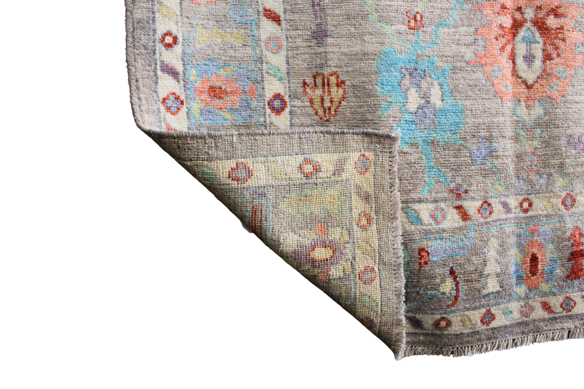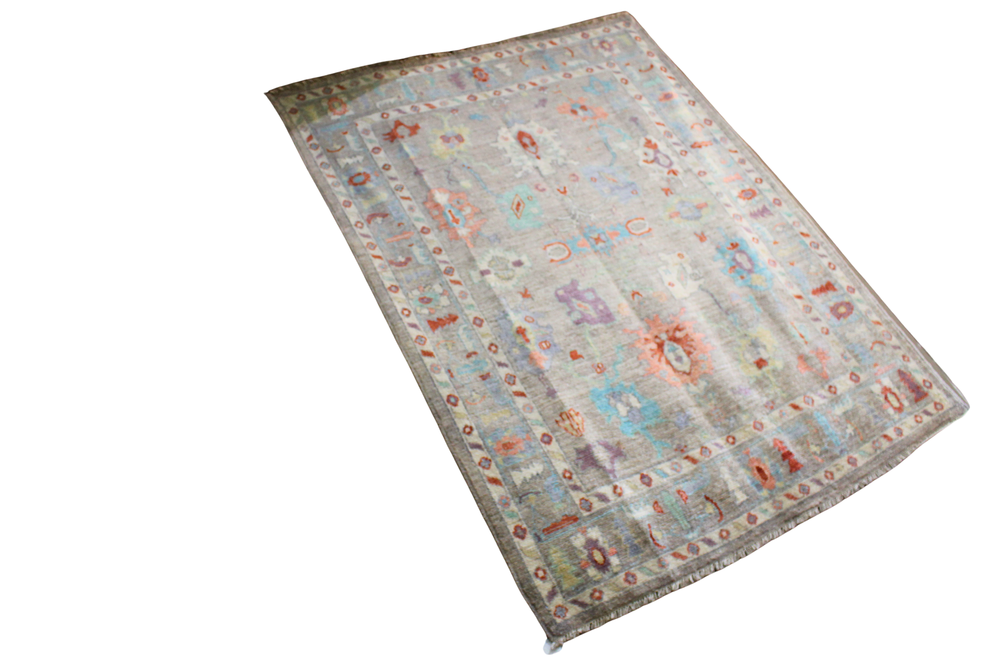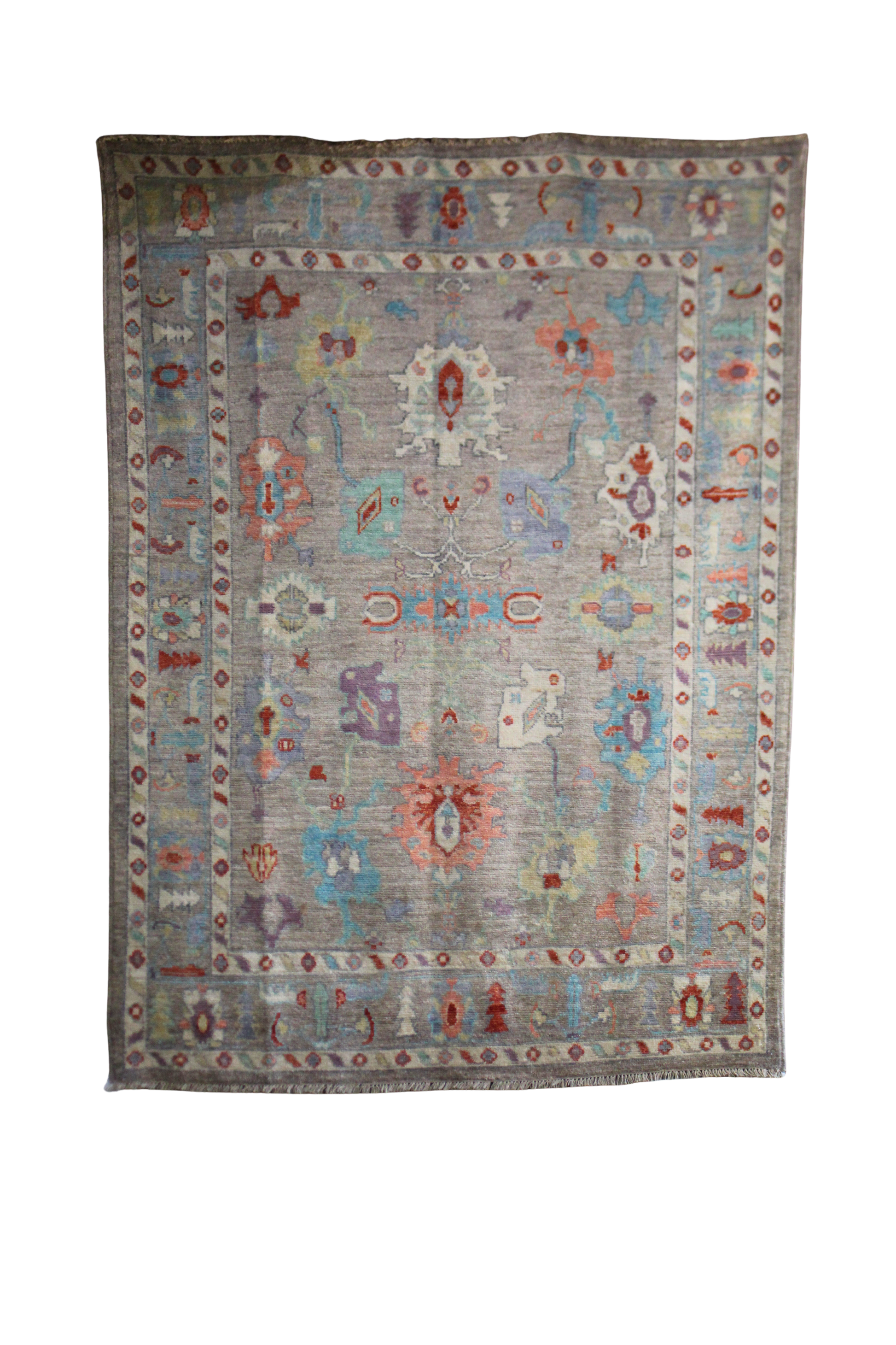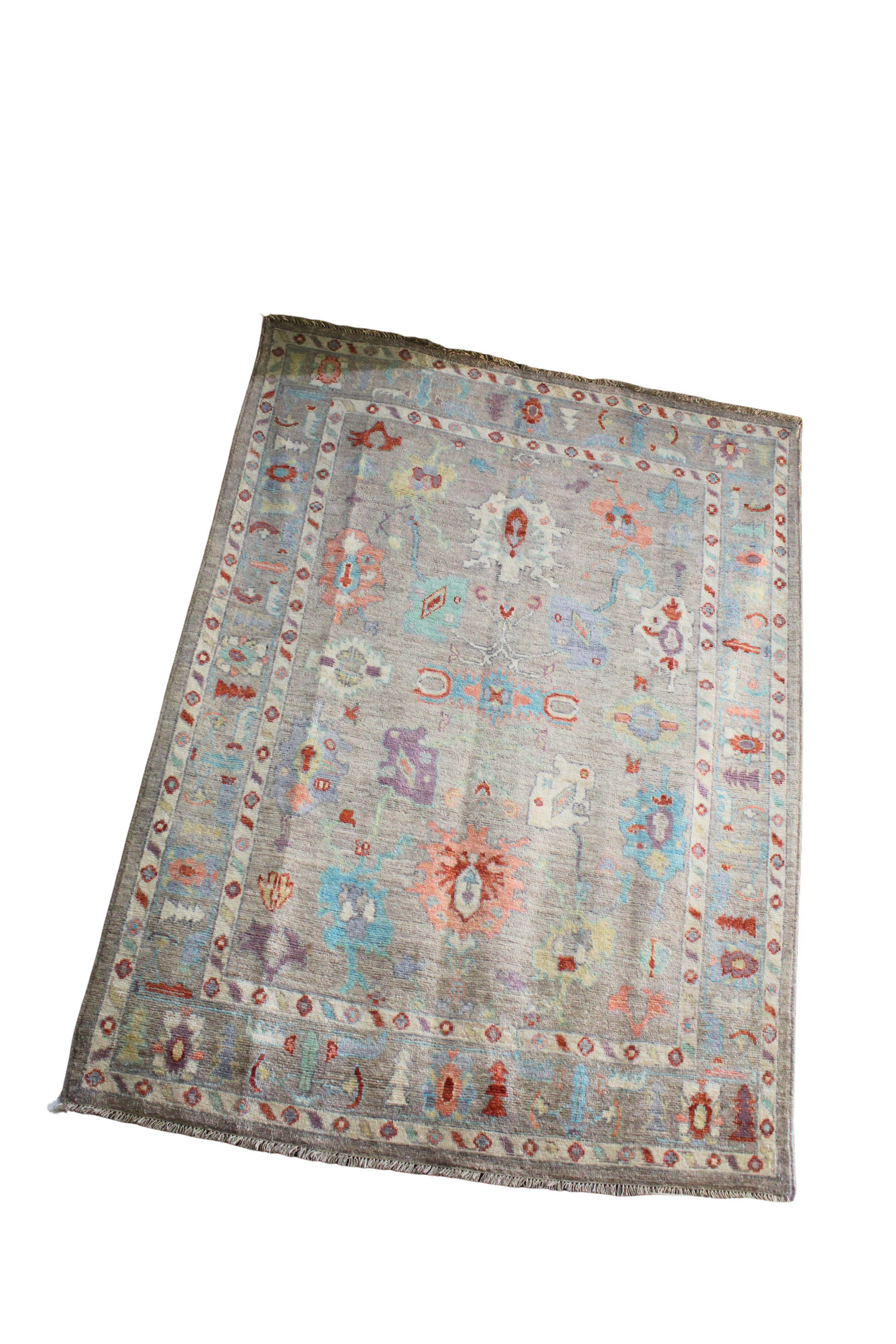 Delicately whimsical and full of soul, this hand-knotted Oushak rug from Afghanistan (5′1″ × 6′11″) blends classical design with a refreshing pastel twist. The cool gray-lavender field is gently scattered with stylized medallions, abstract florals, and tribal emblems, rendered in muted hues of apricot, powder blue, lilac, coral, ivory, and soft teal.
