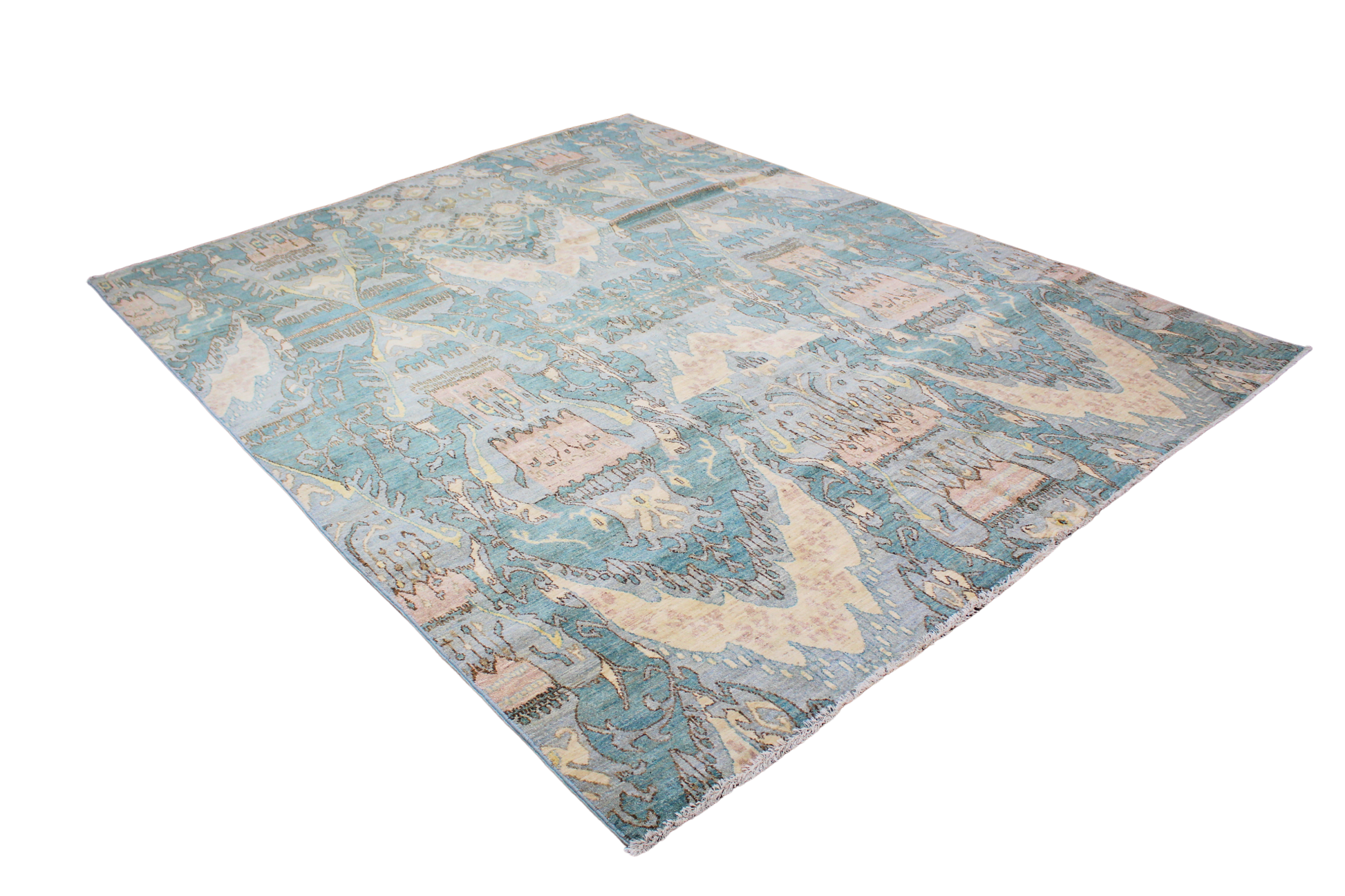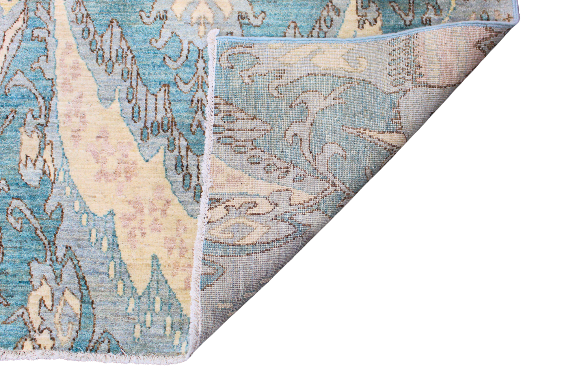 Energize your space with the exotic charm of this contemporary Ikat rug, handwoven in Pakistan. This piece showcases a mesmerizing vertical motif that fuses traditional tribal elements with modern artistic abstraction. The repeating symmetrical pattern features stylized medallions, elongated diamond shapes, and temple-like architectural echoes rendered in a lush palette of teal, aqua, ivory, and pale rose.