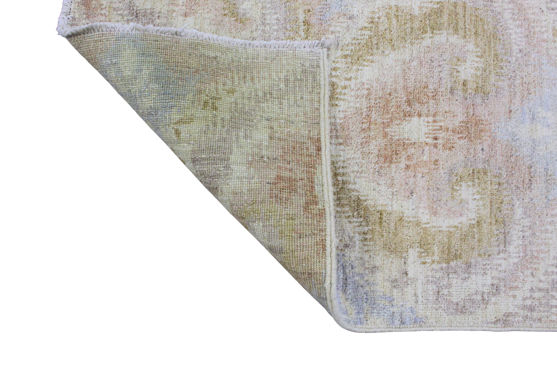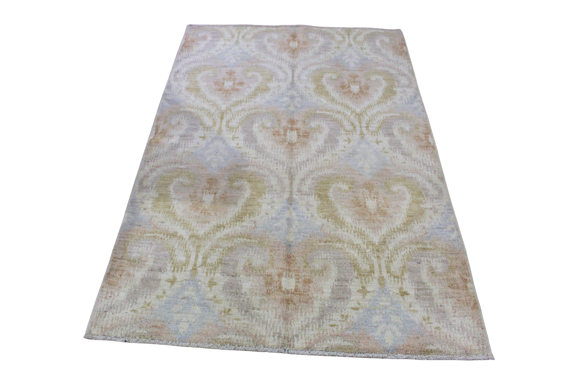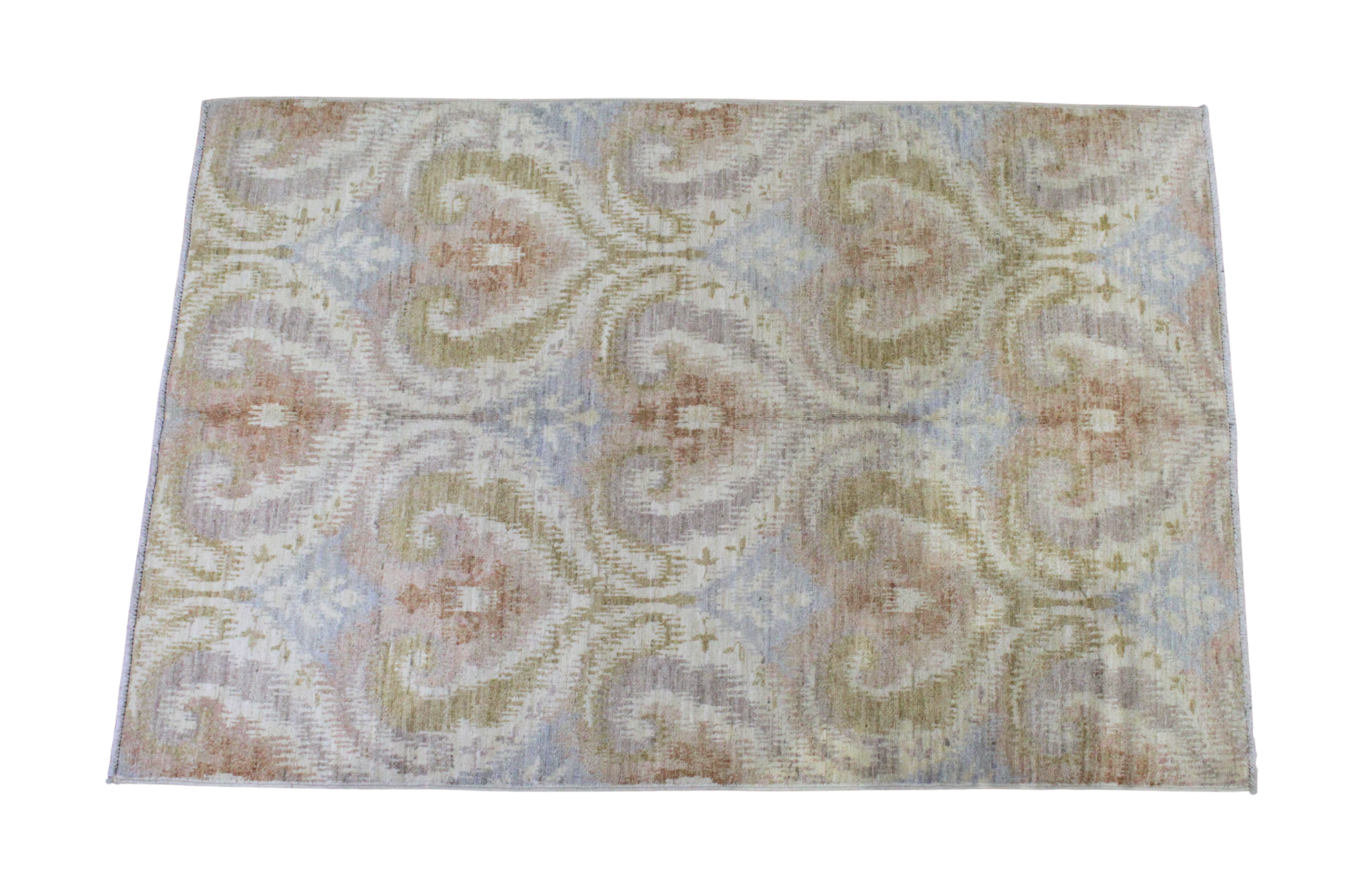 This 4x6 Ikat rug from Pakistan envelops the room in a gentle, painterly haze of earthy pastels and subtle movement. Inspired by the time-honored dyeing technique of Ikat textiles, the design features flowing, mirrored motifs reminiscent of paisleys and plumes — rendered in a palette of muted olive, faded rust, and dusty sky blue over a soft ivory base. The overall effect is soothing and refined, with just enough pattern to suggest quiet sophistication.