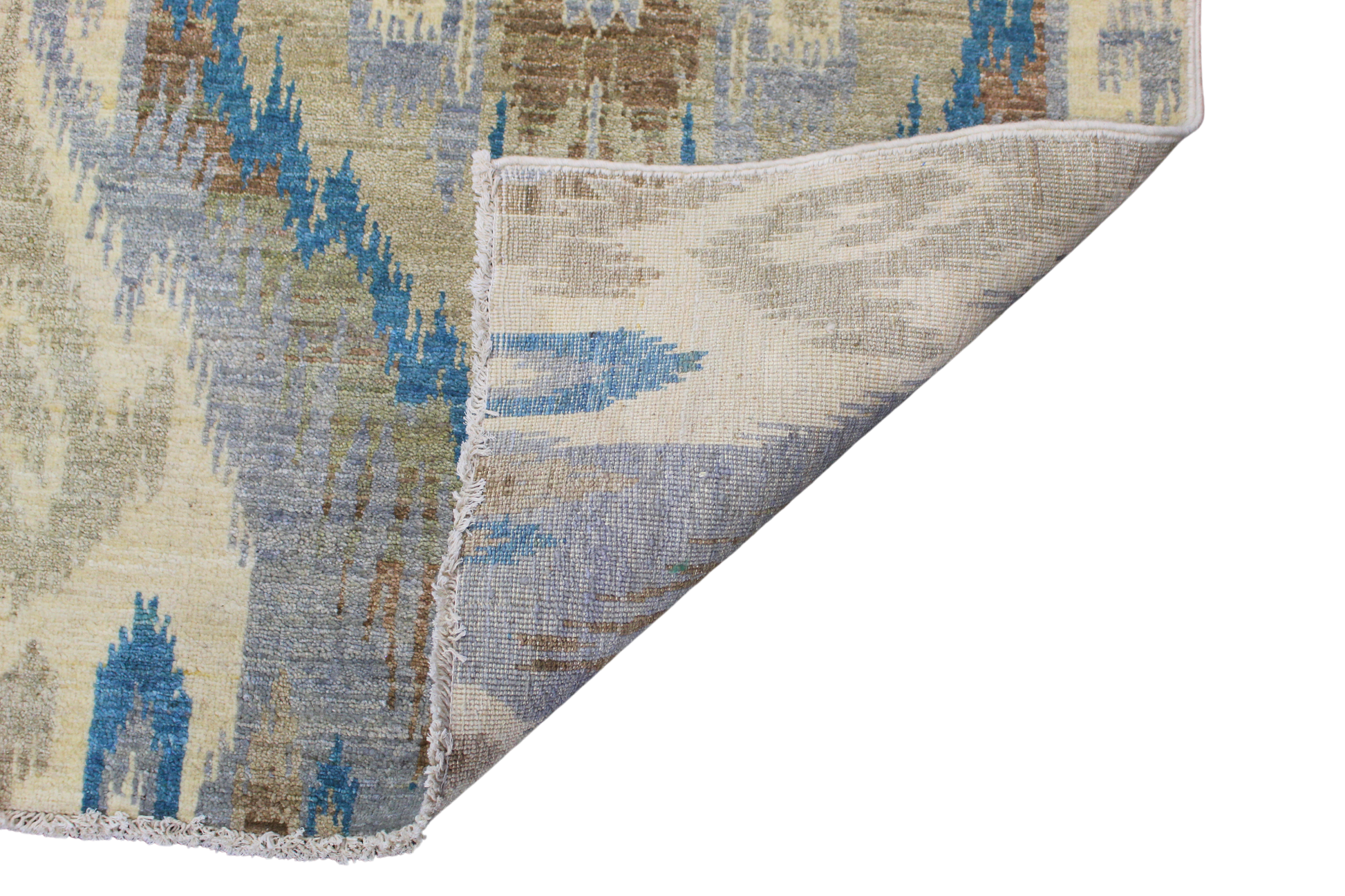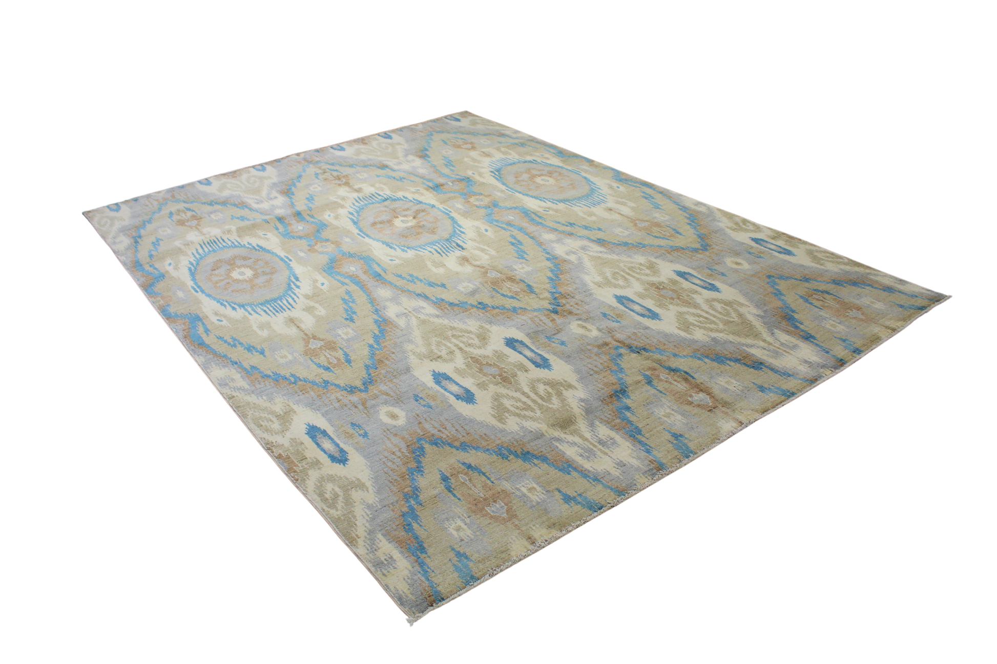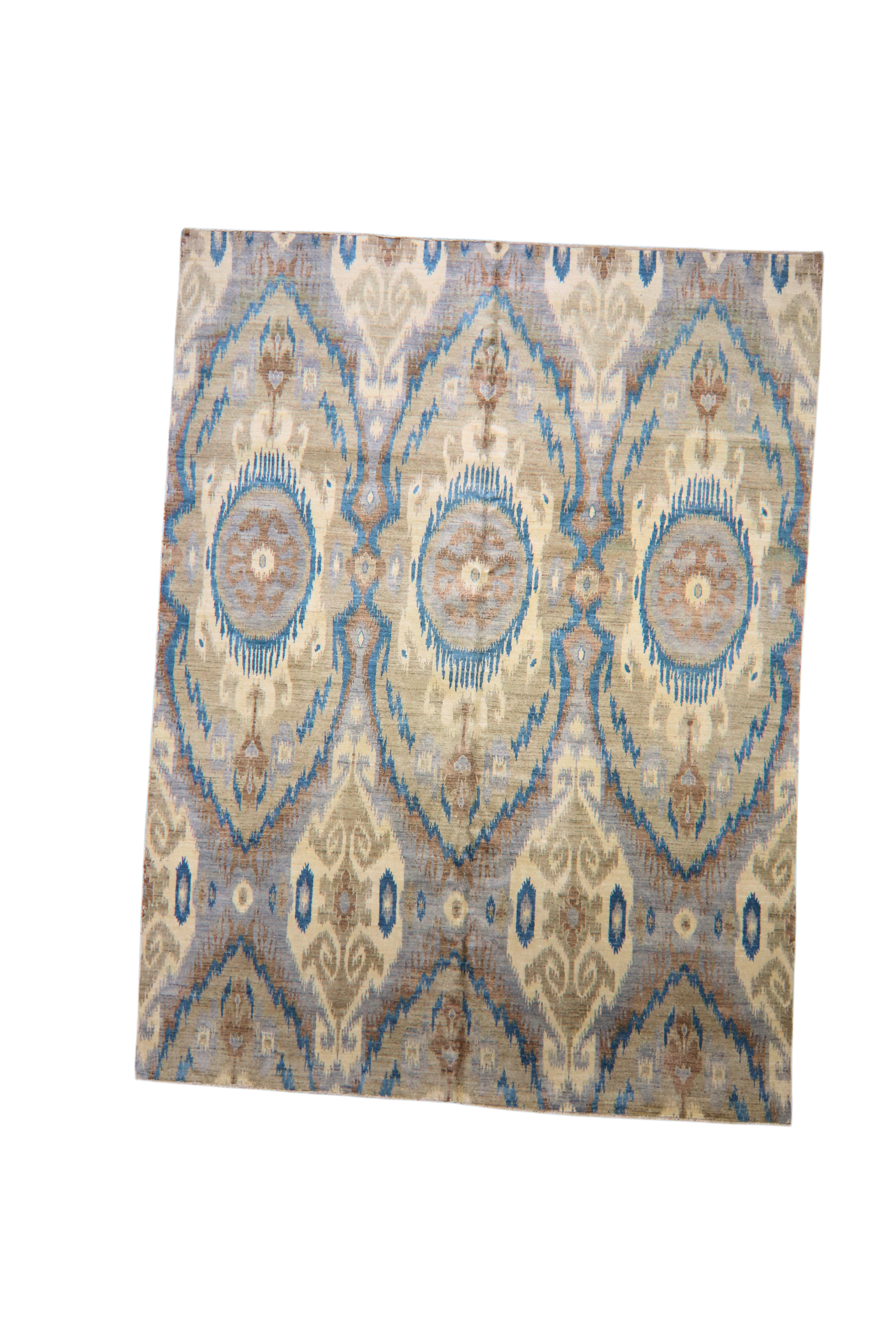 Bring a bold, artistic flair to your space with this contemporary Ikat rug from Pakistan. Designed with striking rhythm and symmetry, the piece features a stylized medallion repeat in a palette of cool slate blue, cream, taupe, and misty gray. The painterly effect of the Ikat design captures the essence of traditional dye-resist techniques, now translated into wool pile with remarkable clarity.