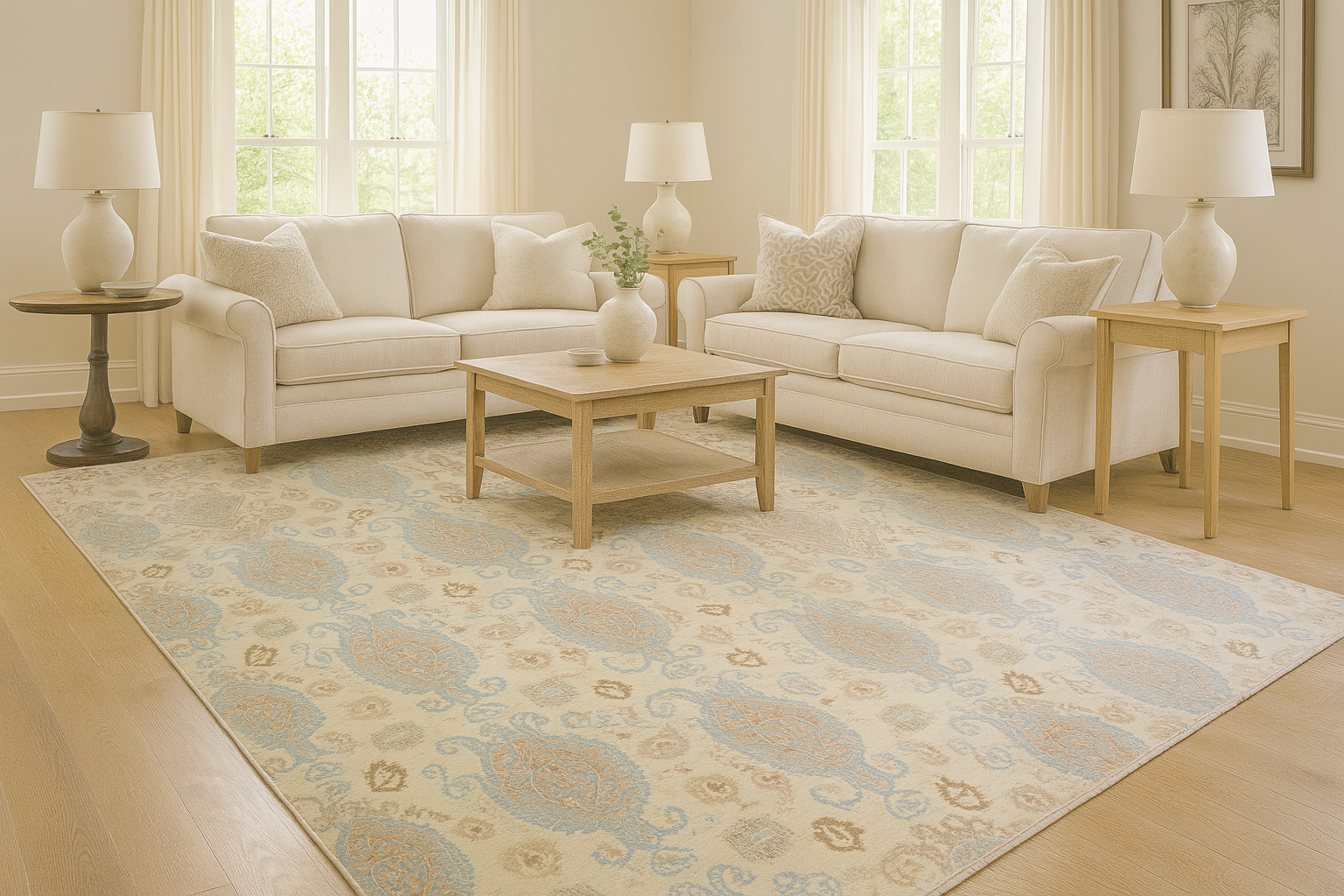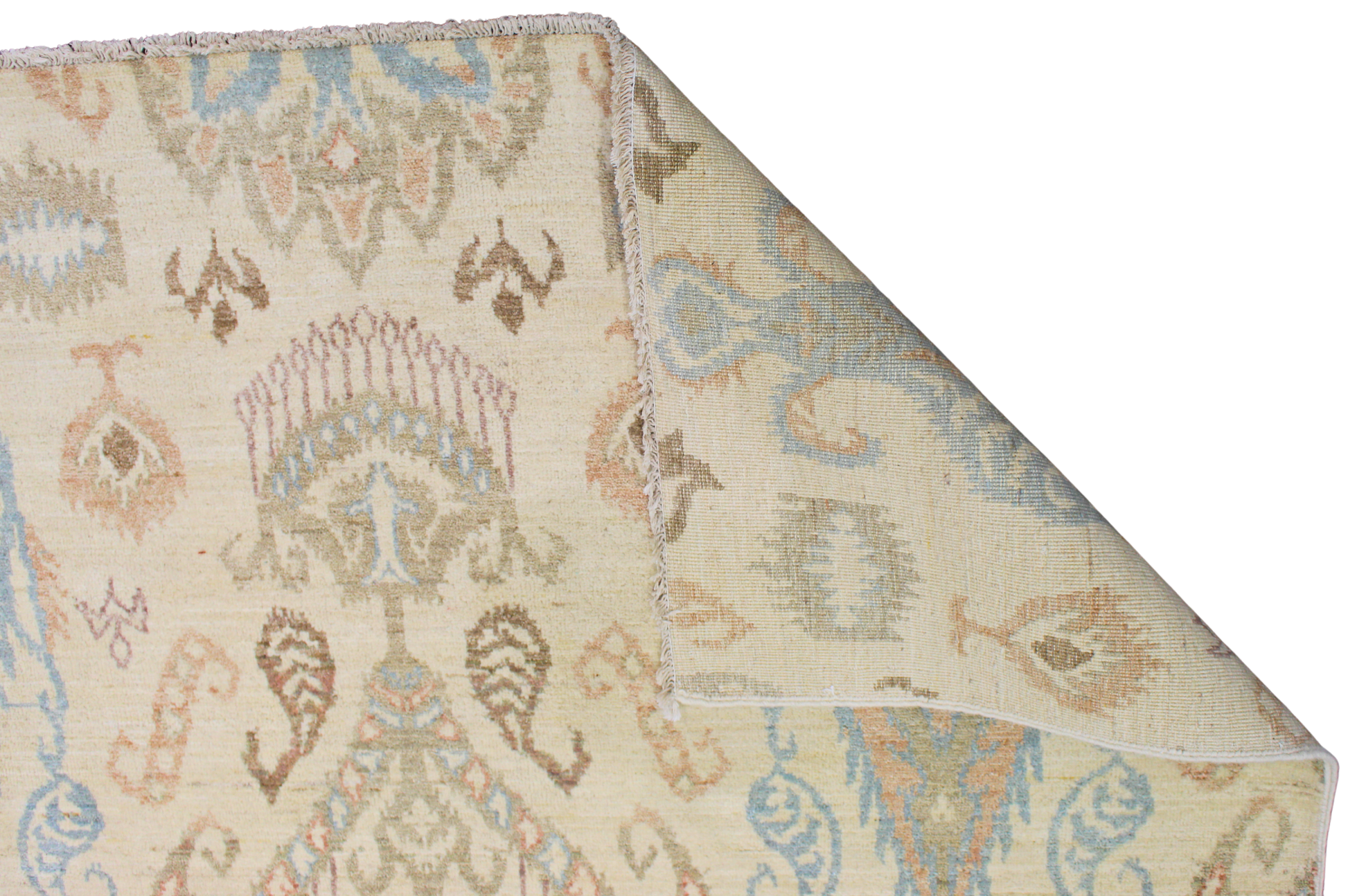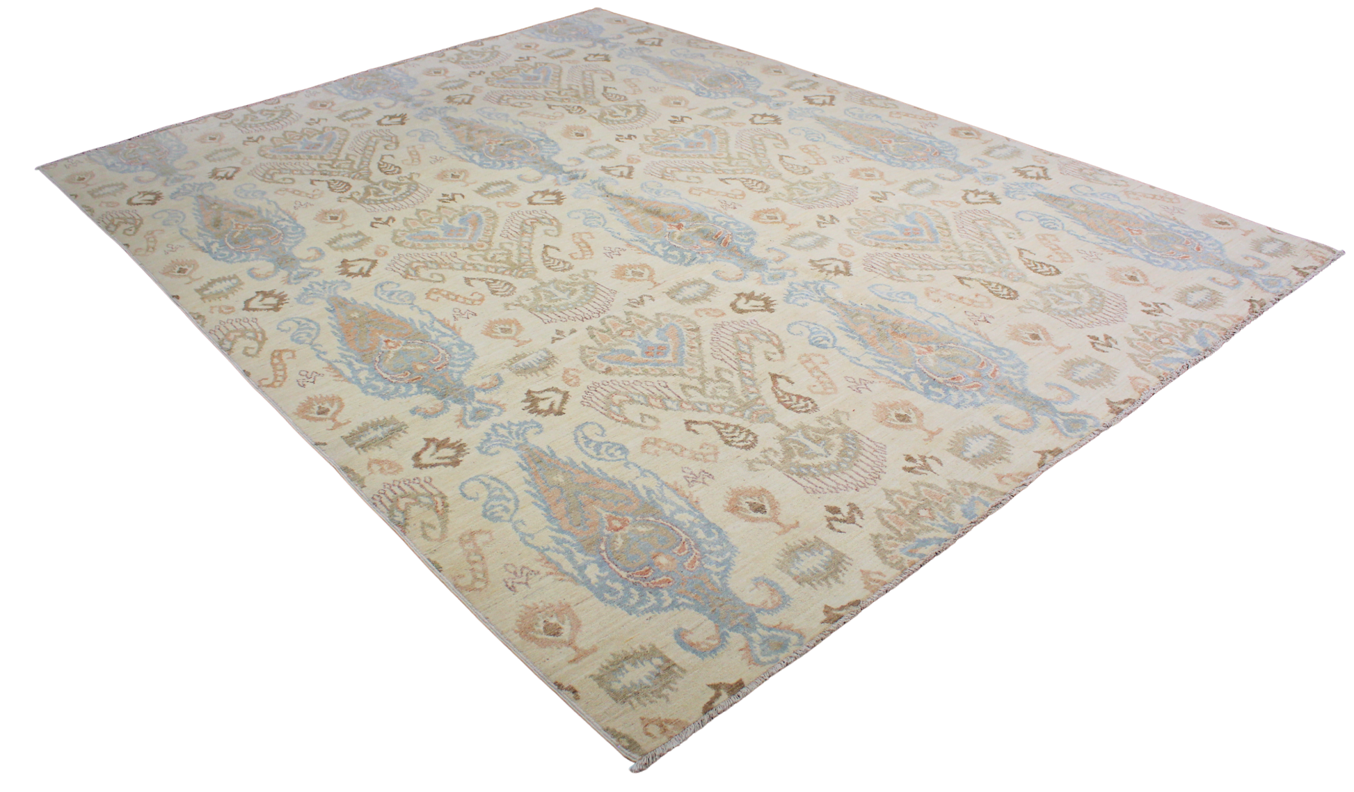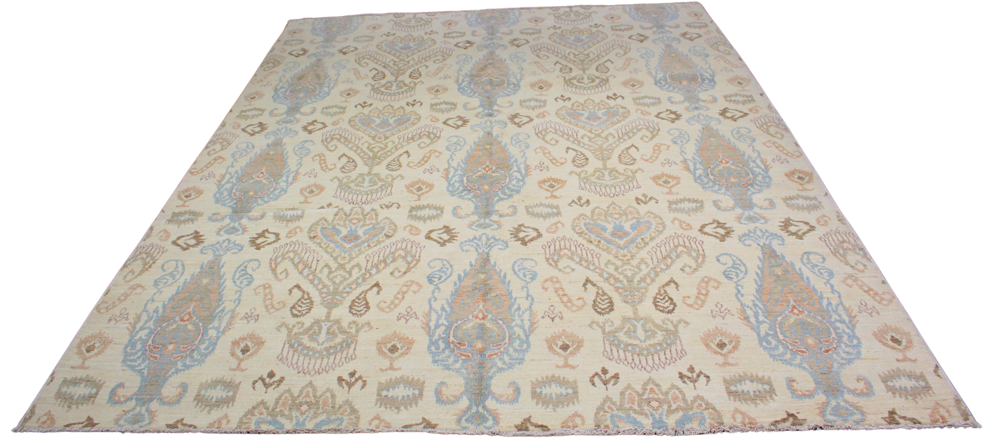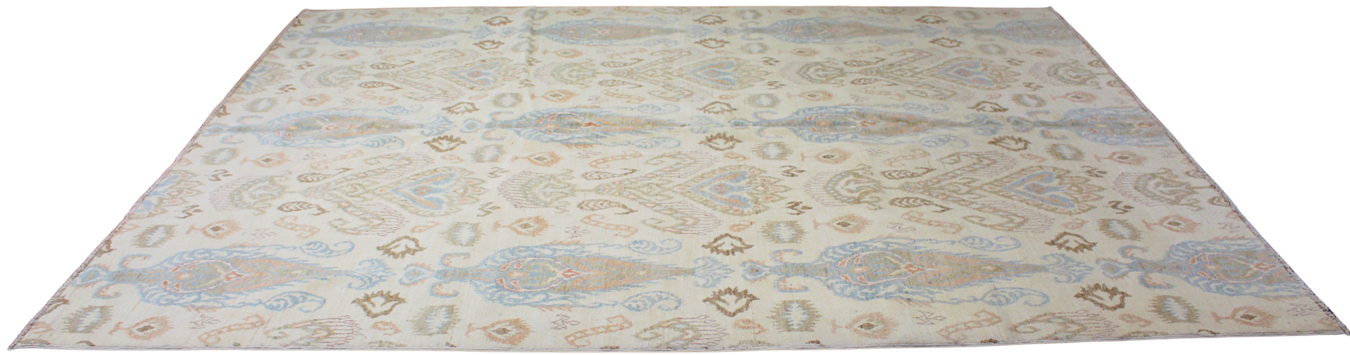 Soft and serene, this hand-knotted Ikat rug from Pakistan (9′1″ × 12′1″) is a refined composition of graceful form and tranquil palette. Delicate sky blues, misty greys, and warm taupes dance across an airy ivory background, forming a repeating ikat-inspired medallion design that feels both ancient and contemporary.