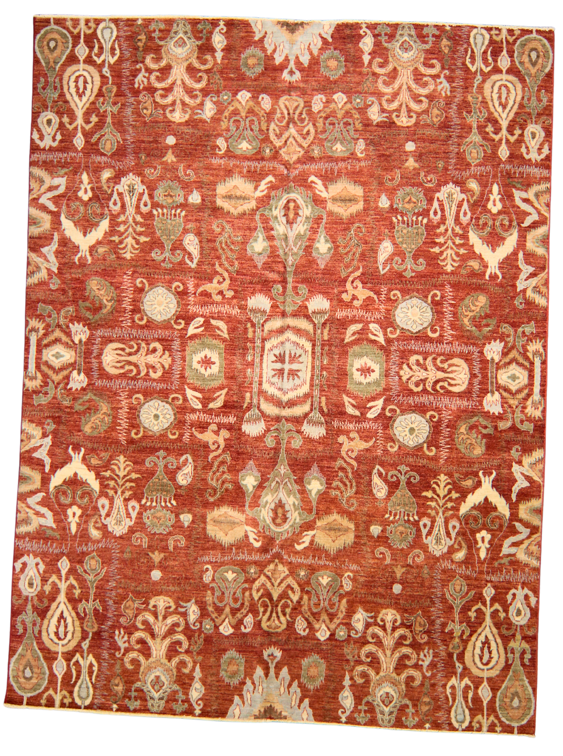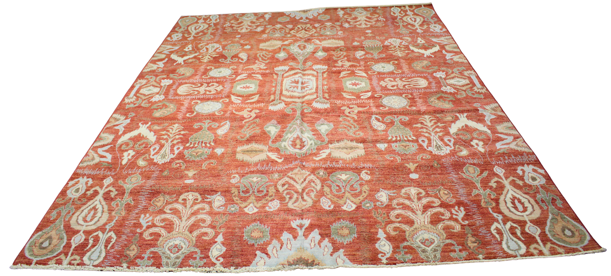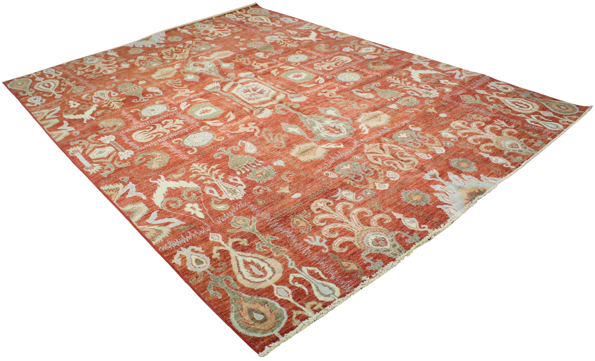 Blending bold tradition with artistic finesse, this hand-knotted Ikat rug from Pakistan (9′ × 12′1″) radiates with energy and depth. The rich terra cotta red backdrop creates a dramatic stage for its intricate ikat-inspired motifs, featuring abstract floral bursts, geometric medallions, and stylized tribal patterns in tones of ivory, sage green, and sand. The asymmetrical, painterly design evokes the visual rhythm of antique textiles while feeling decisively modern.