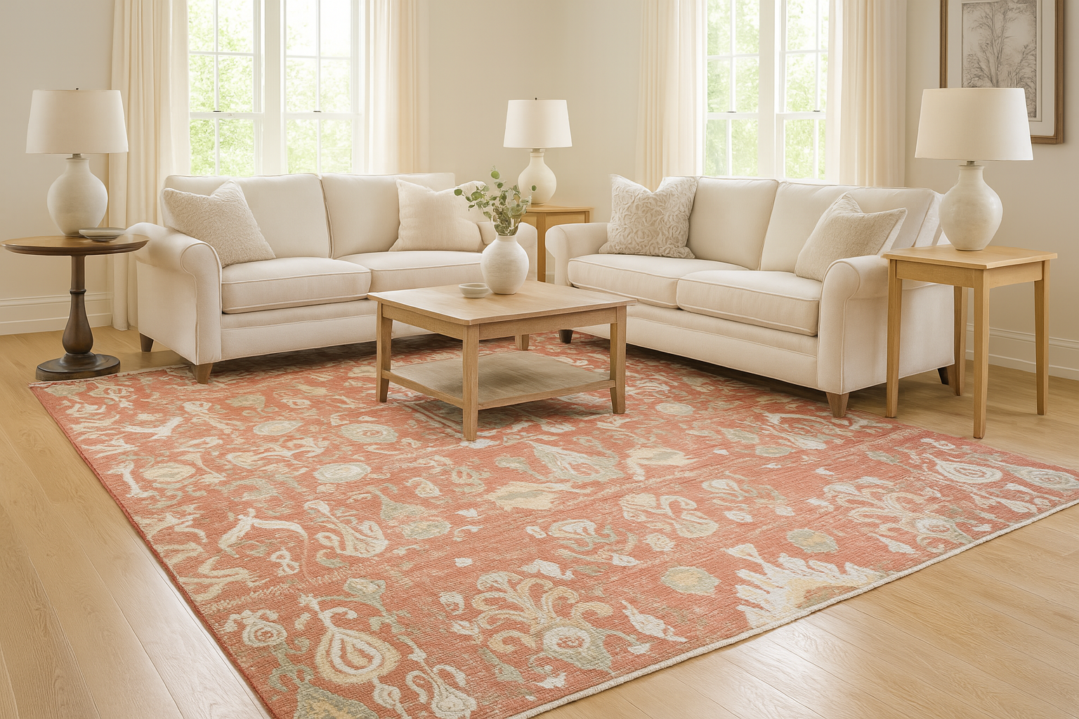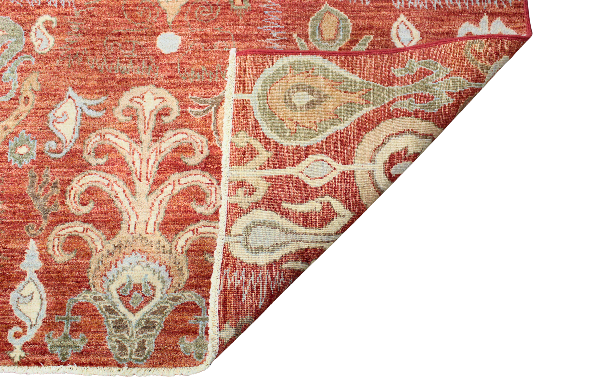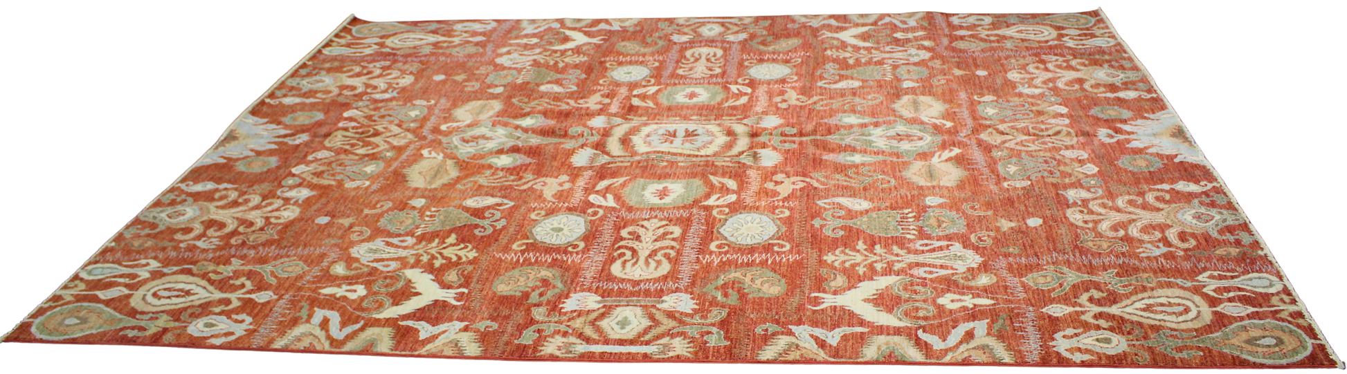 Blending bold tradition with artistic finesse, this hand-knotted Ikat rug from Pakistan (9′ × 12′1″) radiates with energy and depth. The rich terra cotta red backdrop creates a dramatic stage for its intricate ikat-inspired motifs, featuring abstract floral bursts, geometric medallions, and stylized tribal patterns in tones of ivory, sage green, and sand. The asymmetrical, painterly design evokes the visual rhythm of antique textiles while feeling decisively modern.