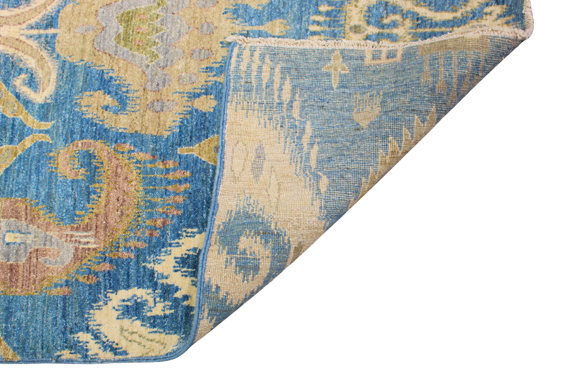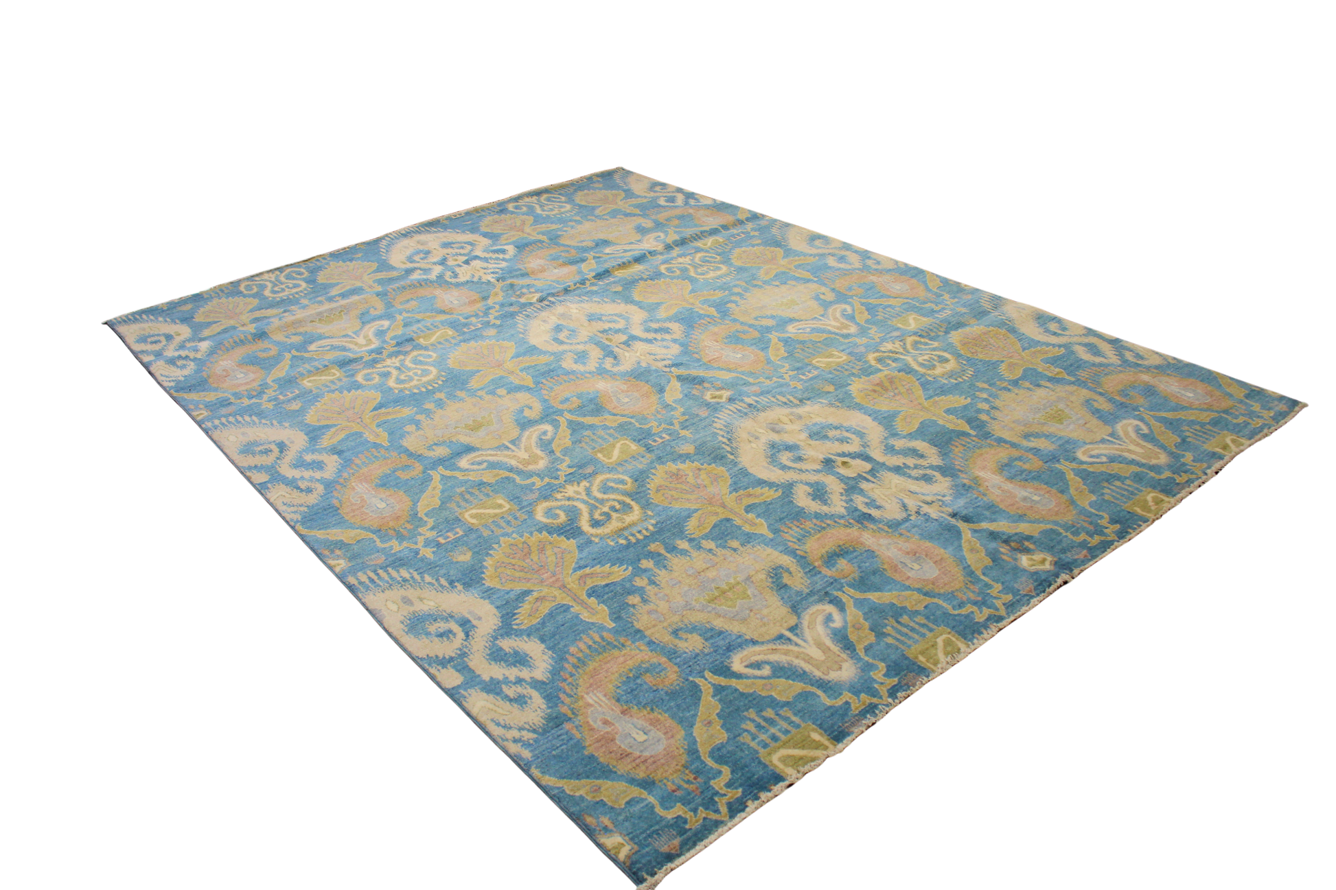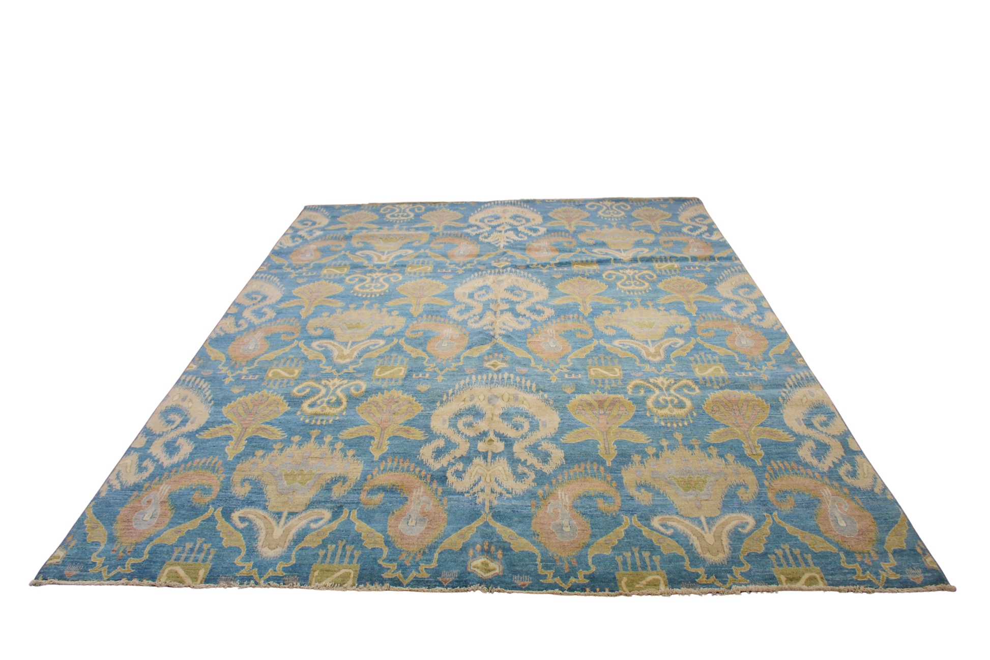 Washed in aquatic hues and animated by rhythmic symmetry, this hand-knotted Pakistani Ikat rug (9′2″ × 12′2″) brings a fresh, global spirit to any room. The pattern floats across the field like sea creatures in motion — with soft teal, cream, mauve, and pale ochre forming a hypnotic composition of abstracted florals, tendrils, and paisleys.