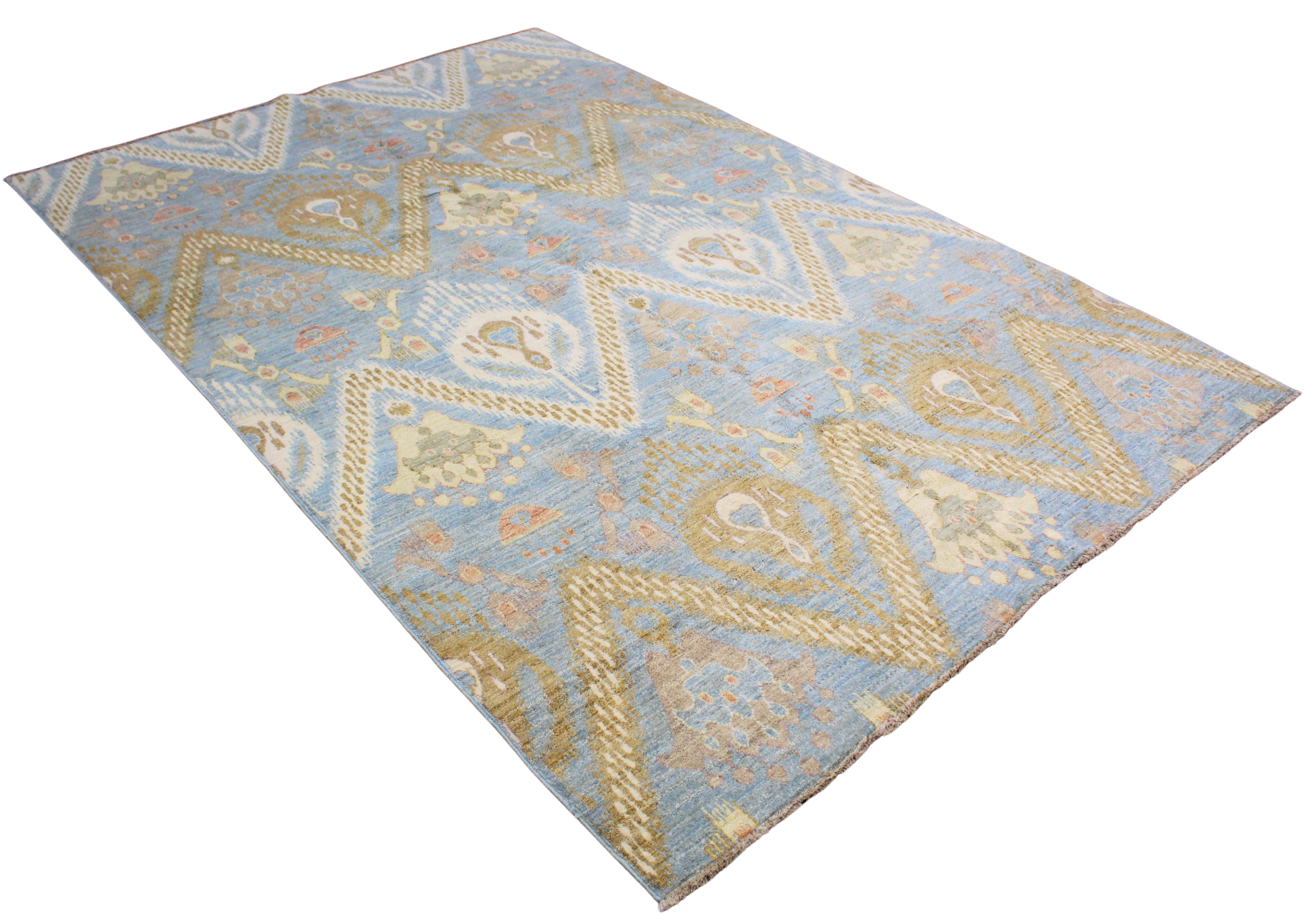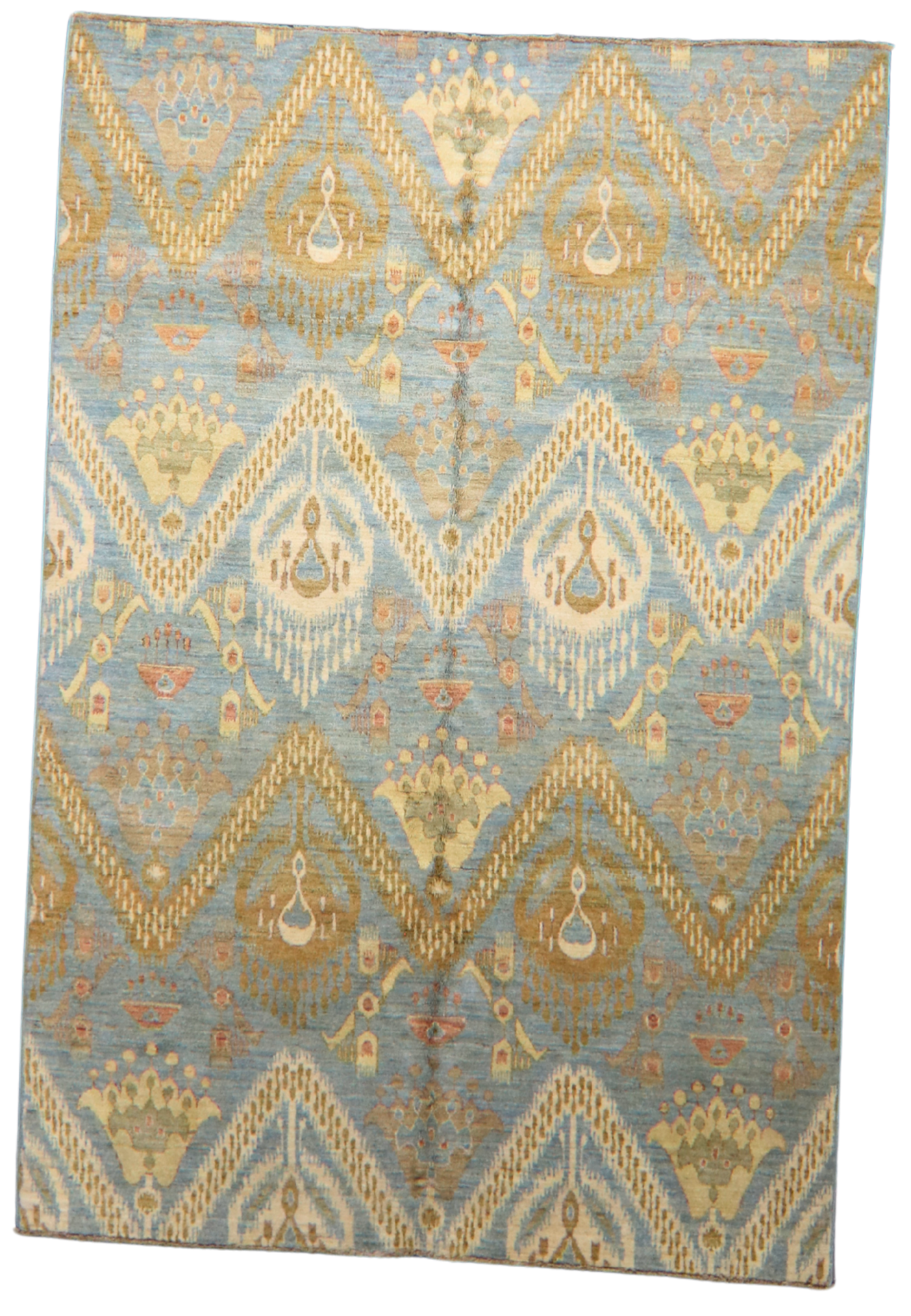 This beautifully balanced Ikat rug from Pakistan (8′11″ × 6′) is a masterclass in softness and symmetry. Its distinctive zigzag lattice anchors a series of jewel-like motifs — abstract floral medallions, pendants, and stylized tribal forms — all rendered in a dreamy palette of seafoam blue, muted gold, ivory, and soft peach.