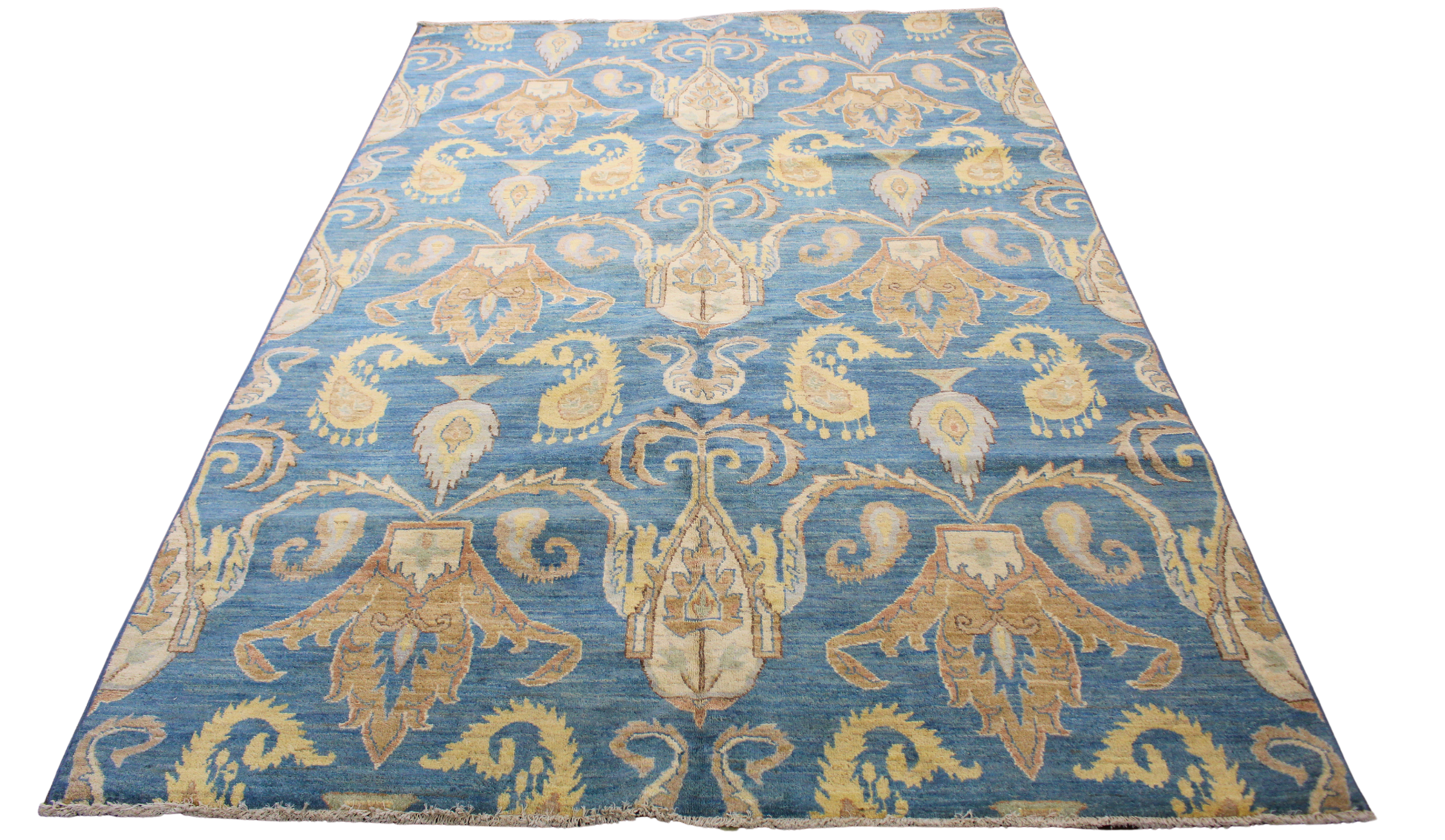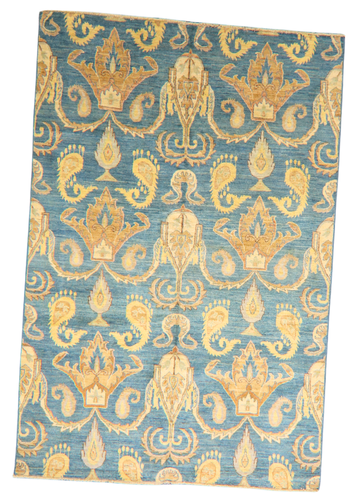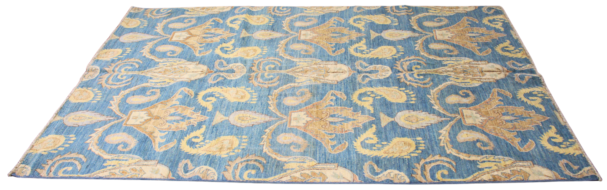 Vibrant and regal, this hand-knotted Ikat rug from Pakistan (6′1″ × 9′2″) is a striking example of textile art reimagined through bold color and classical symmetry. The lush teal-blue field sets a vivid stage for the repeating ikat motifs in golden beige, ochre, and soft ivory, rendered with stylized botanical flair that echoes Mughal and Central Asian design influences.