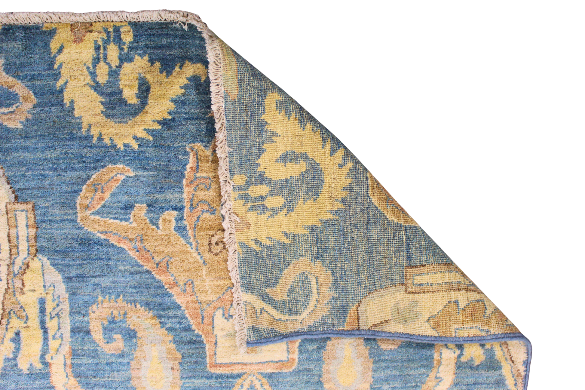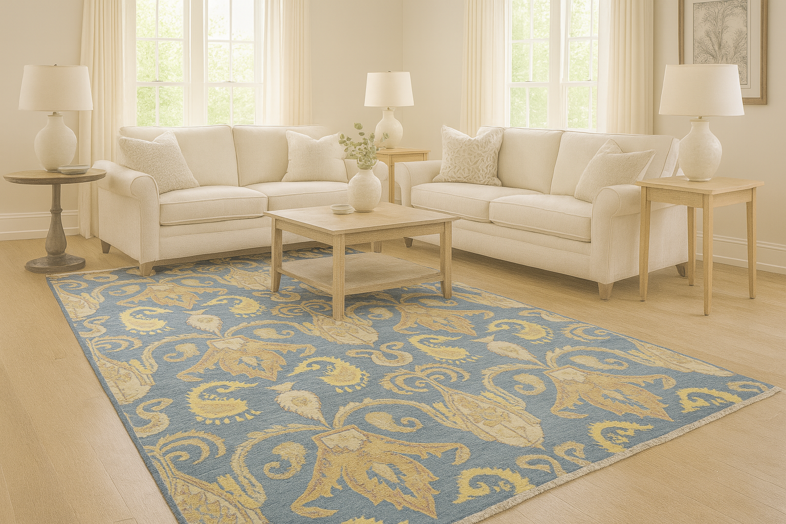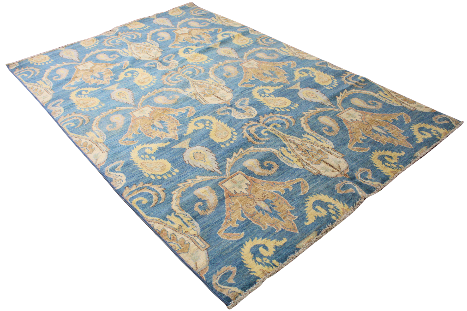 Vibrant and regal, this hand-knotted Ikat rug from Pakistan (6′1″ × 9′2″) is a striking example of textile art reimagined through bold color and classical symmetry. The lush teal-blue field sets a vivid stage for the repeating ikat motifs in golden beige, ochre, and soft ivory, rendered with stylized botanical flair that echoes Mughal and Central Asian design influences.