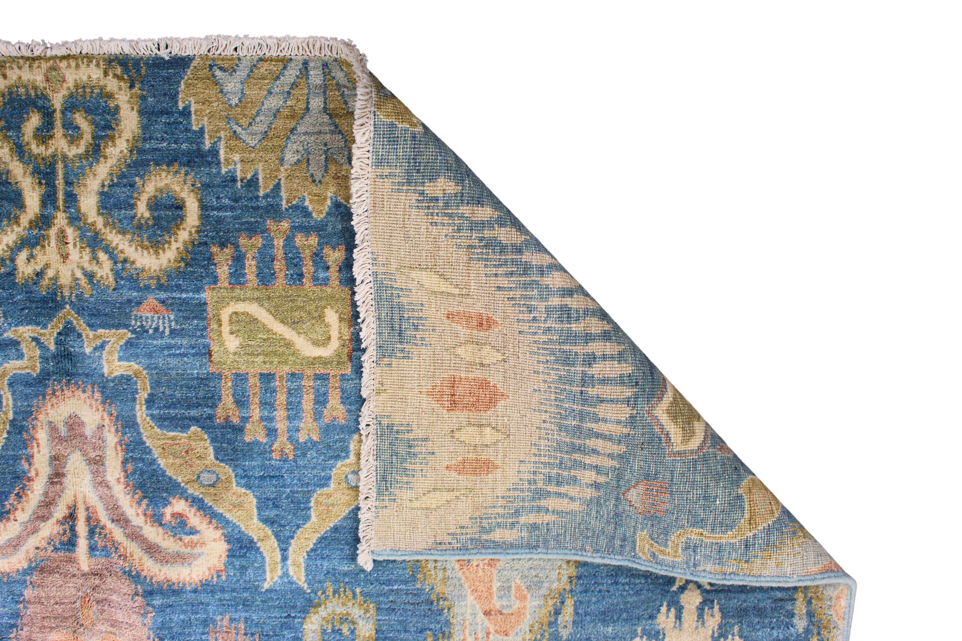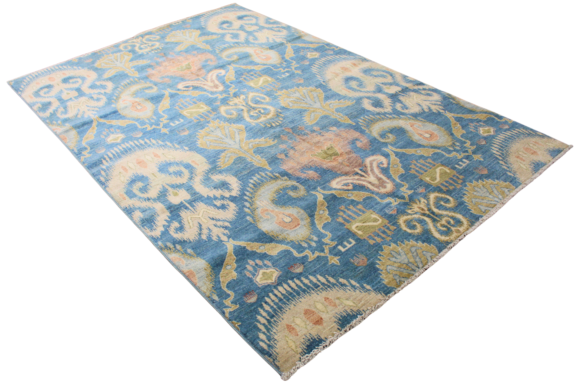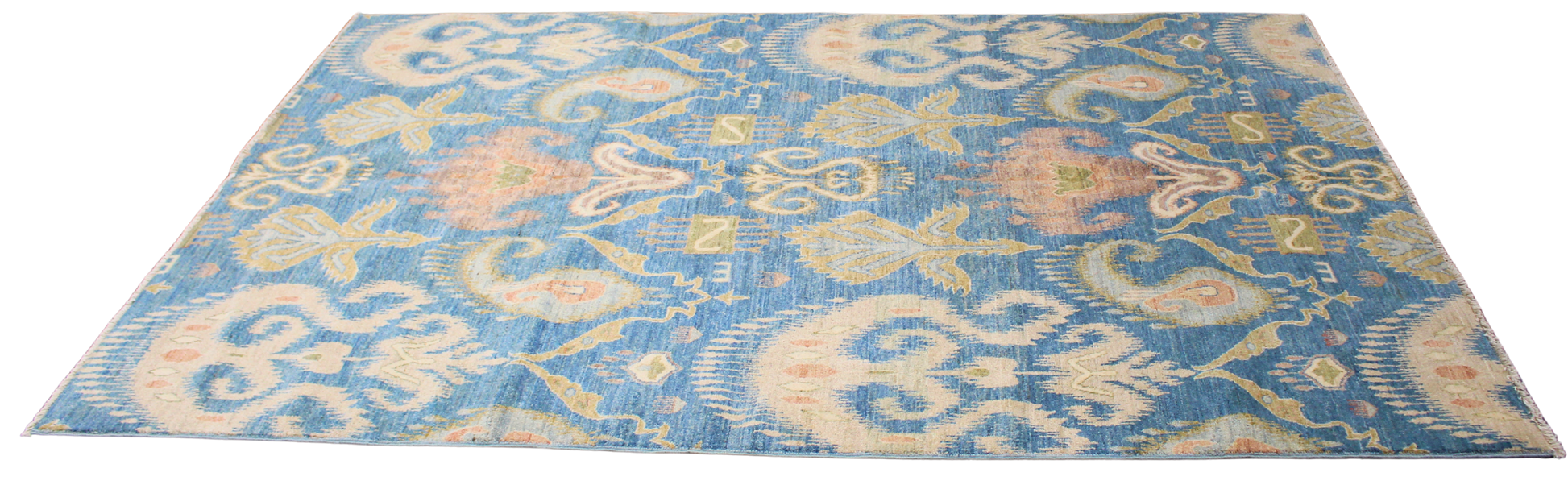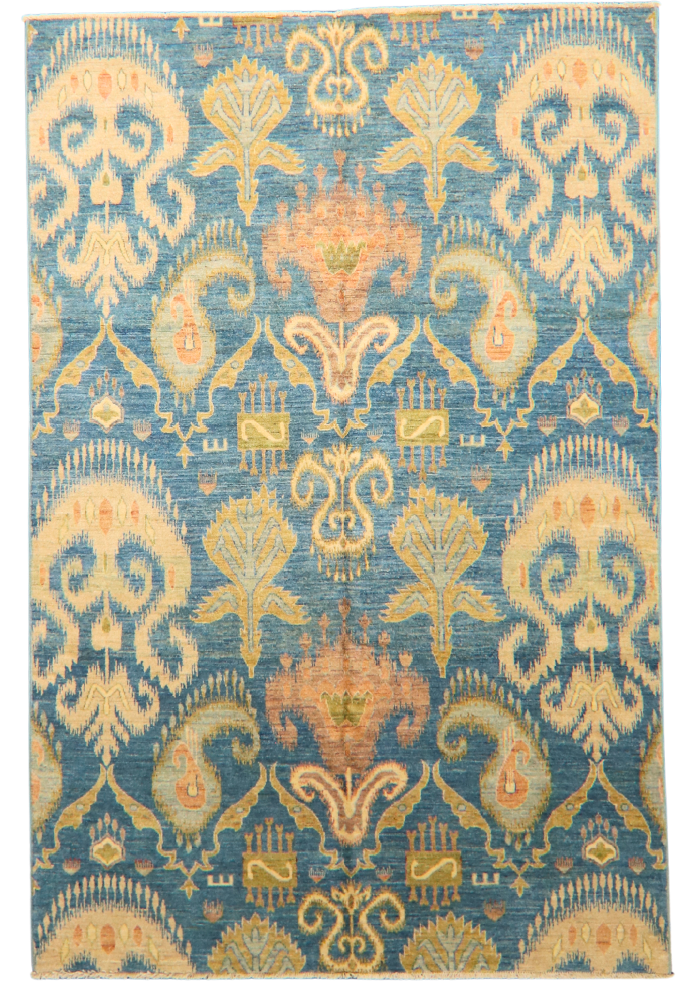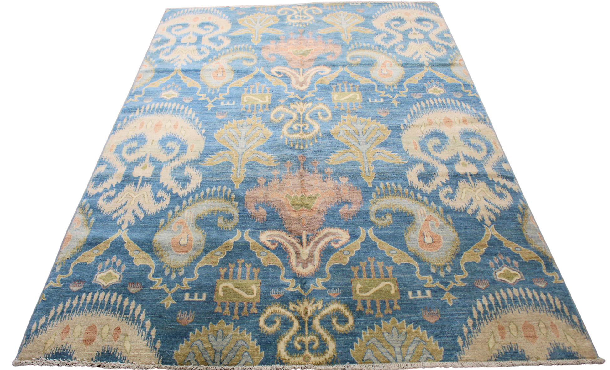 Graceful and luminous, this hand-knotted Ikat rug from Pakistan (6′ × 9′1″) blends painterly texture with symmetrical elegance. A lush jade-teal ground hosts a flowing array of stylized floral and tribal motifs in buttery cream, soft peach, faded coral, and golden beige — forming a mirror-like rhythm across the field that evokes blooming gardens and ancient tapestries.