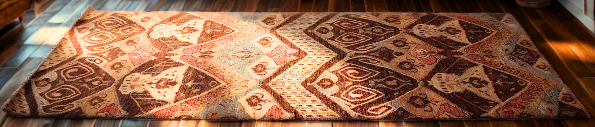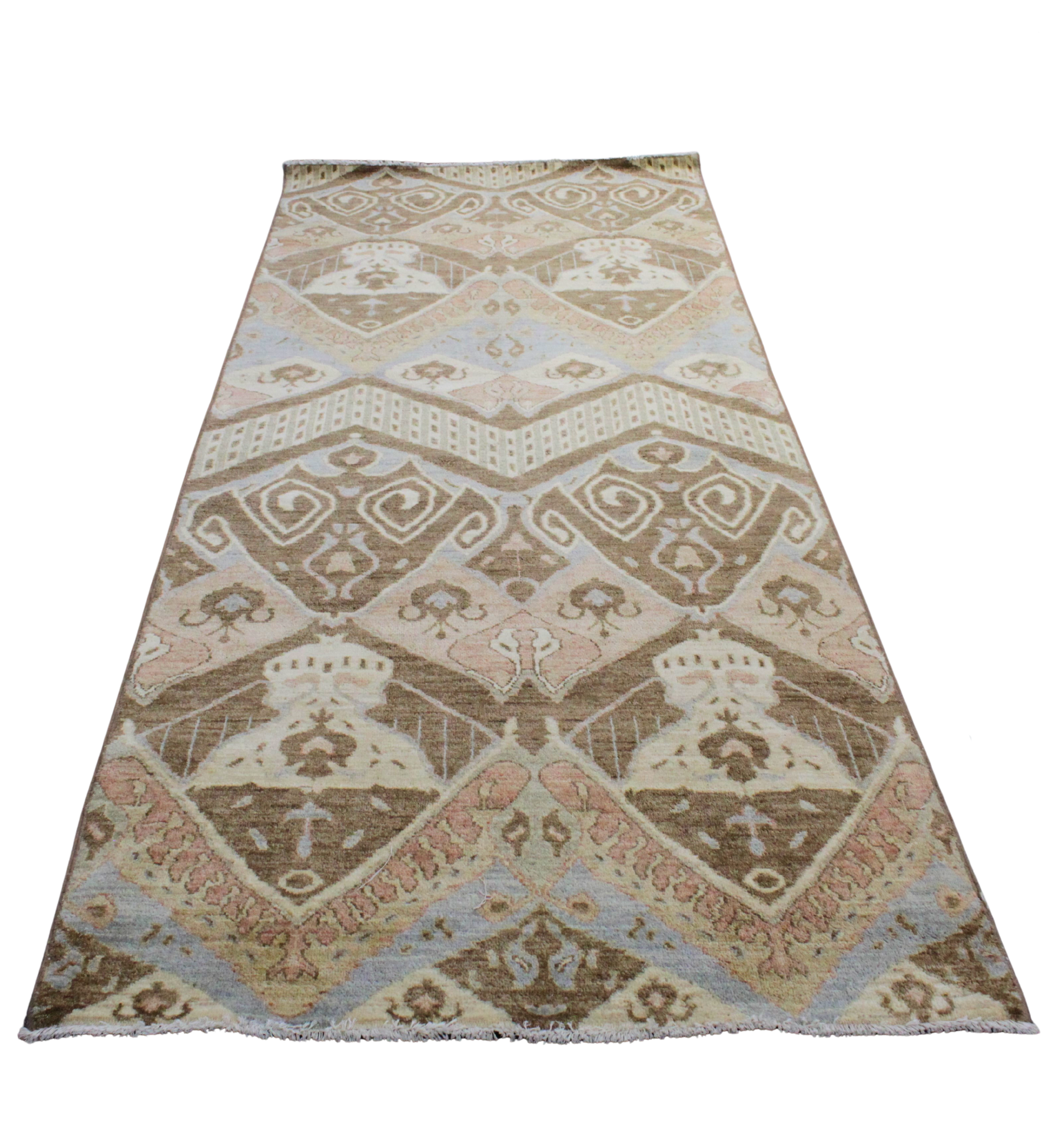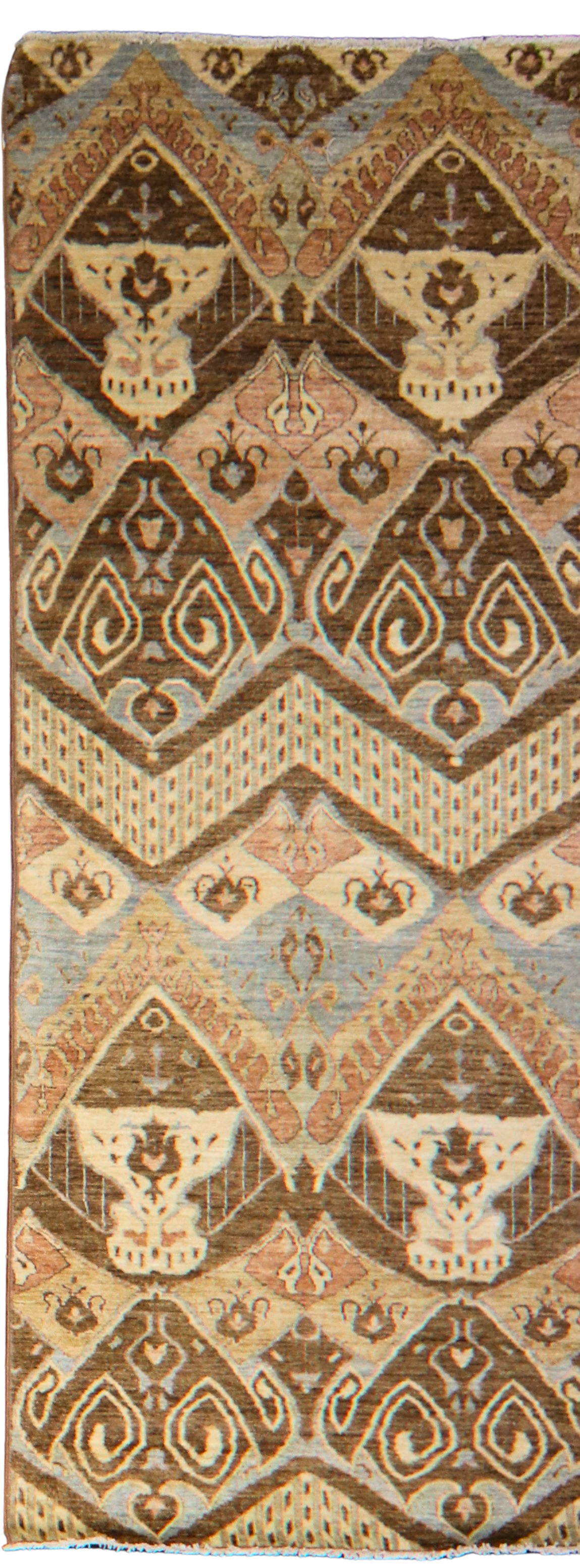 Evocative and elegantly modern, this 3.11 × 9.11 ft Ikat rug from Pakistan brings an artistic, global flair into any space. Its design channels traditional Central Asian motifs with a contemporary twist, using abstracted diamond medallions, stylized tulips, and mirrored forms that climb vertically across the field like the silhouette of distant mountains.