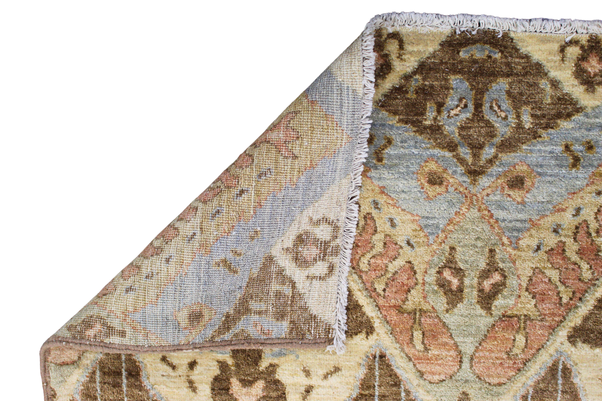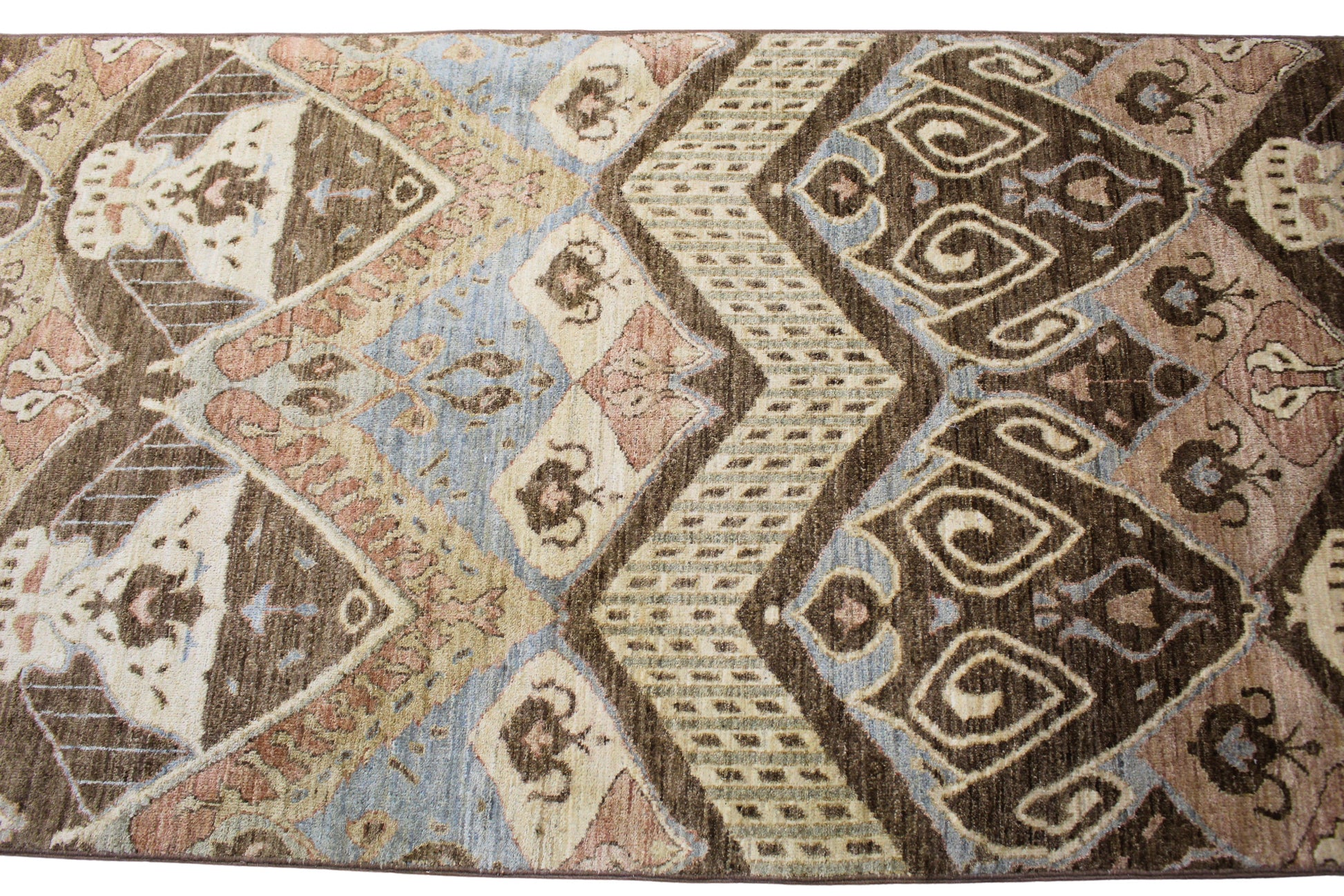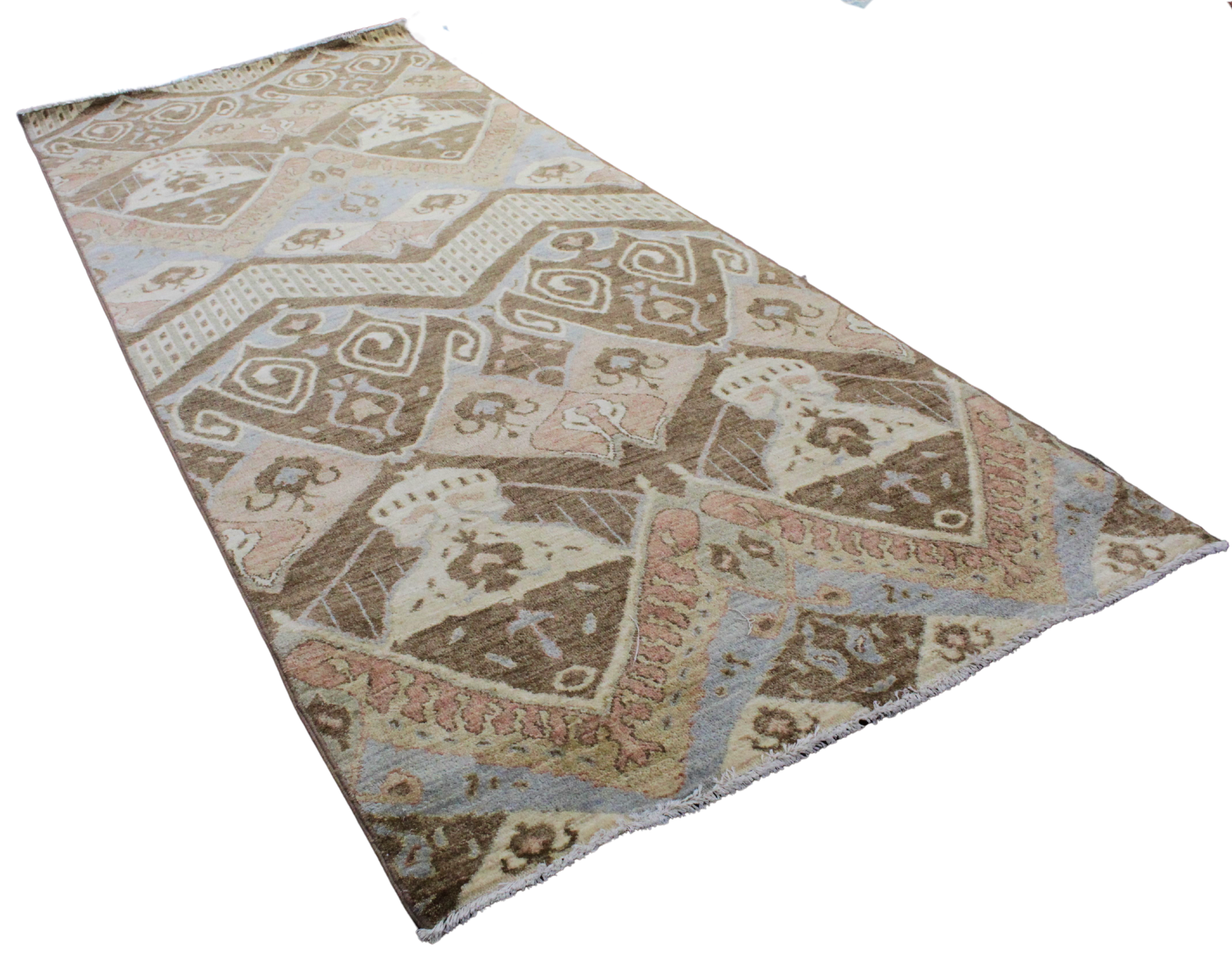 Evocative and elegantly modern, this 3.11 × 9.11 ft Ikat rug from Pakistan brings an artistic, global flair into any space. Its design channels traditional Central Asian motifs with a contemporary twist, using abstracted diamond medallions, stylized tulips, and mirrored forms that climb vertically across the field like the silhouette of distant mountains.