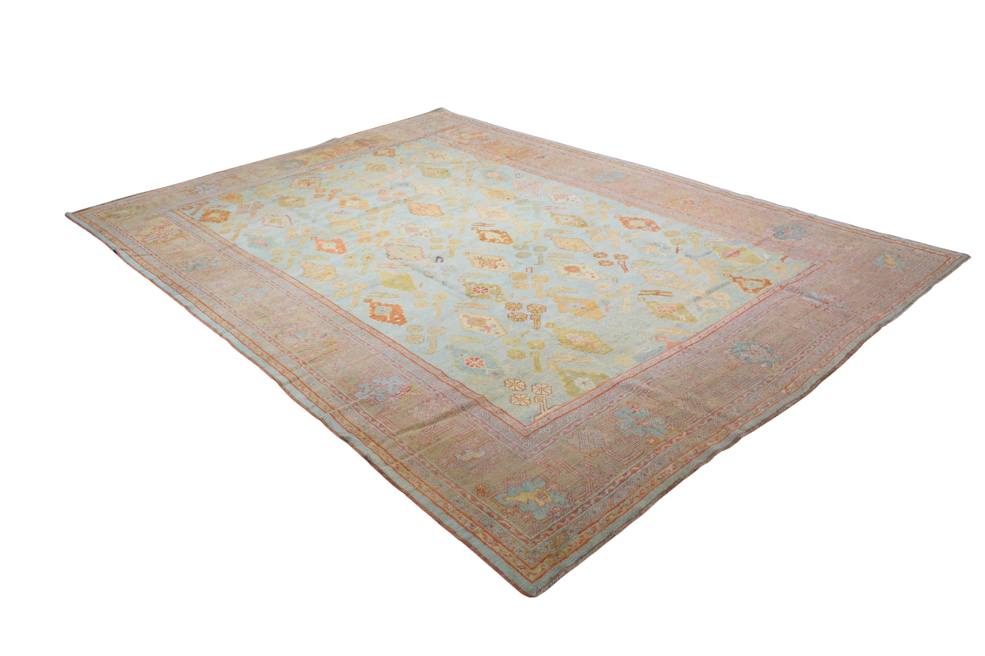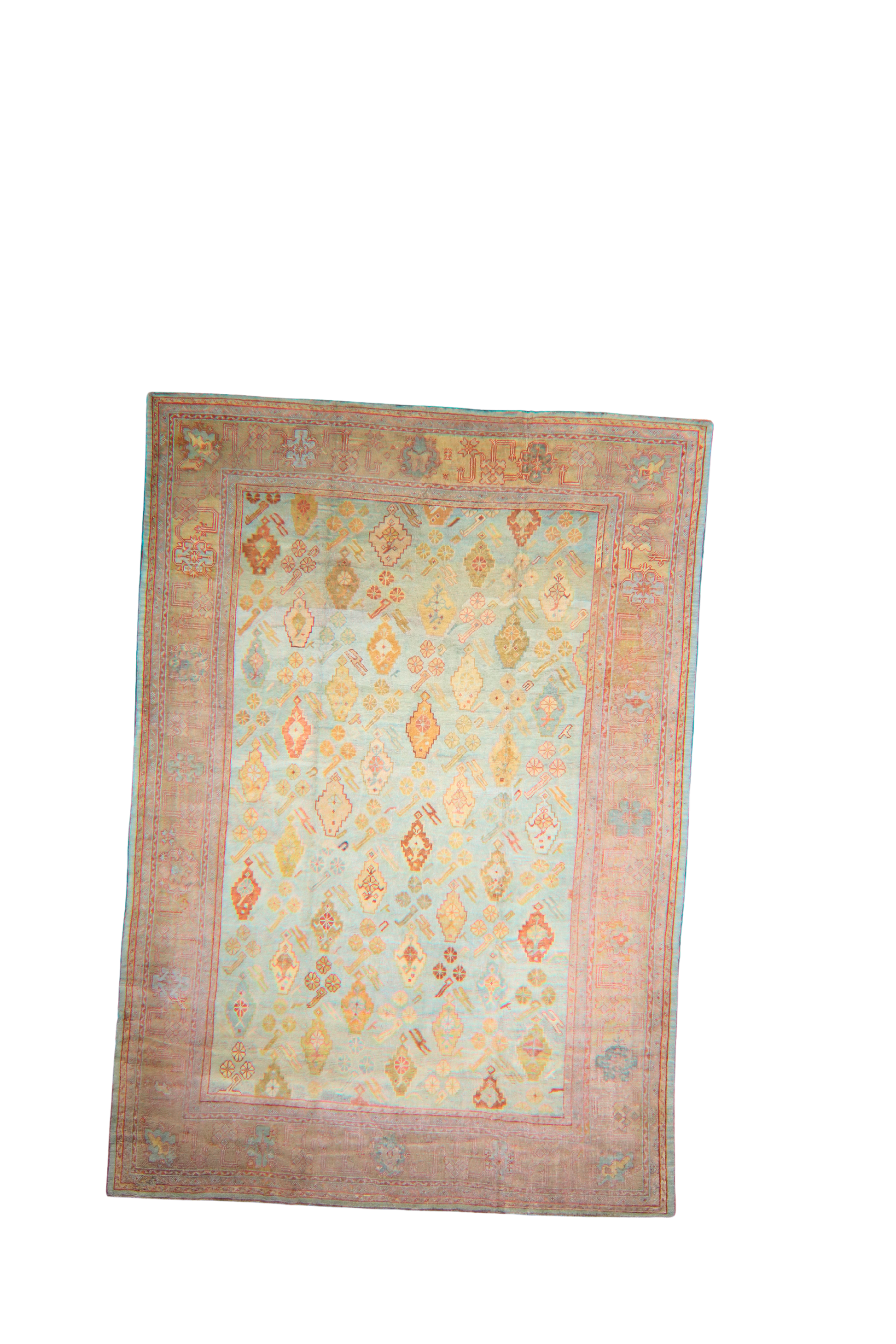 Effortlessly graceful, this antique Turkish Oushak rug (10′ × 14′2″) bathes the room in a dreamy, sun-faded glow. The field is a luminous aqua mist, gently washed with time, and dotted with a mosaic of geometric medallions and stylized floral guls, each uniquely shaped and softly rendered in shades of pale apricot, ivory, coral, faded gold, and celadon.