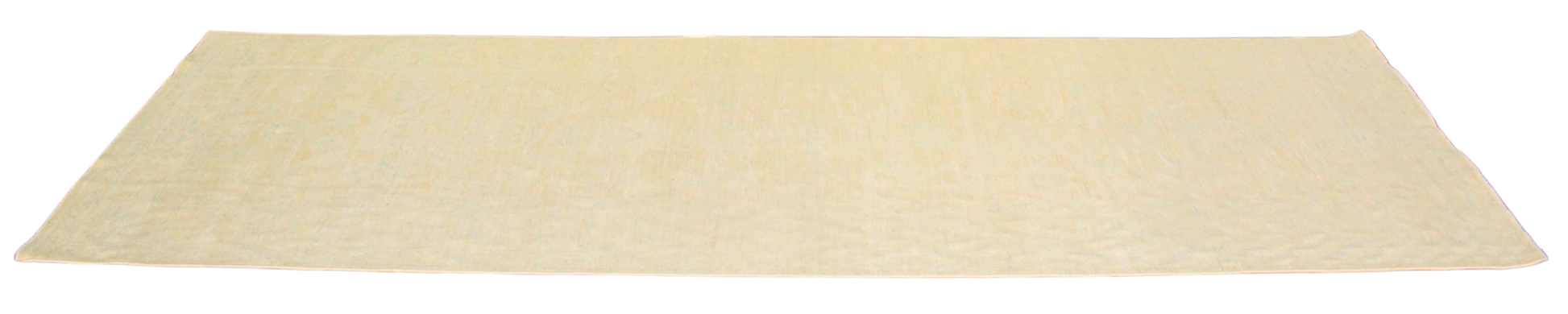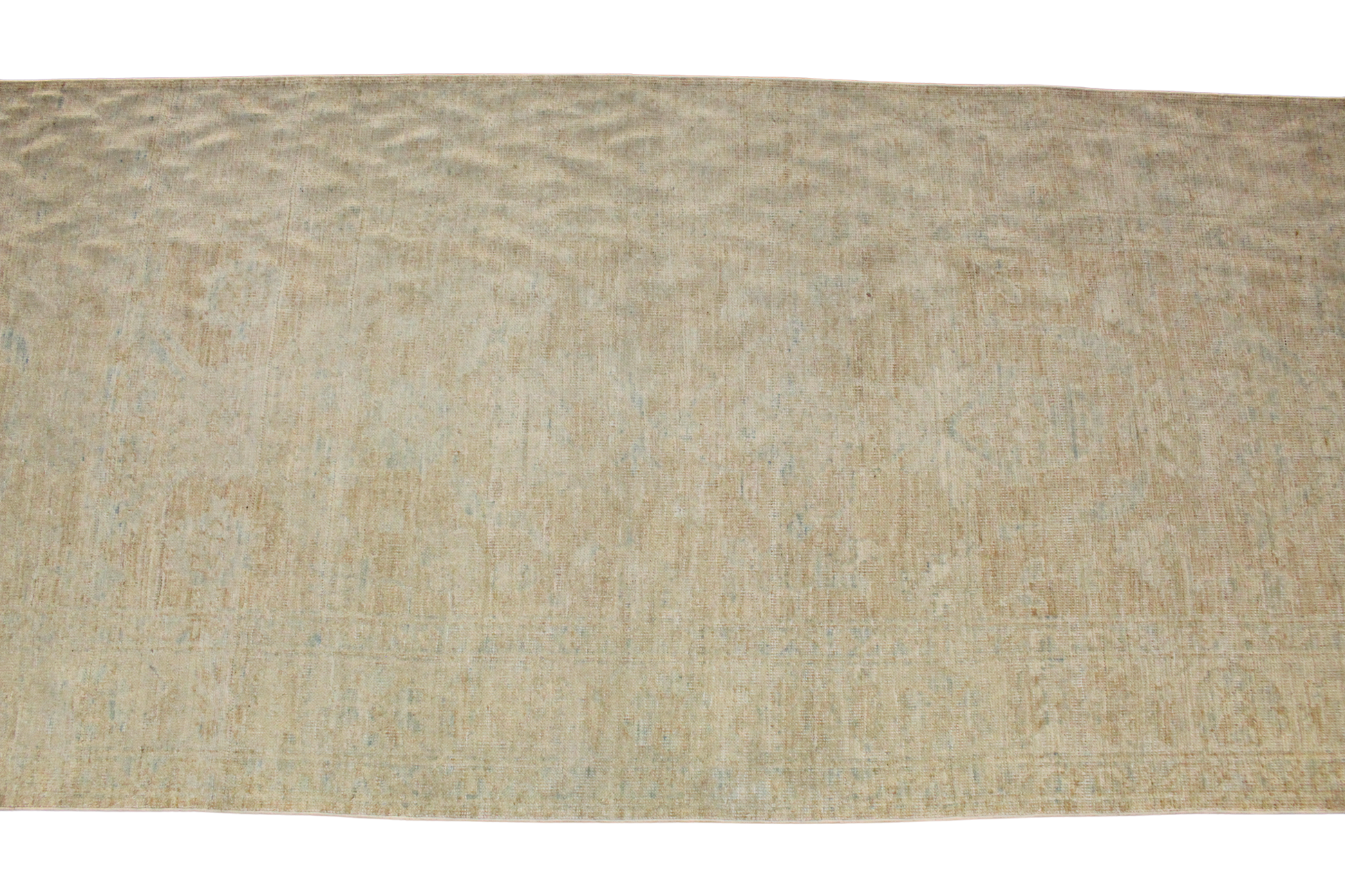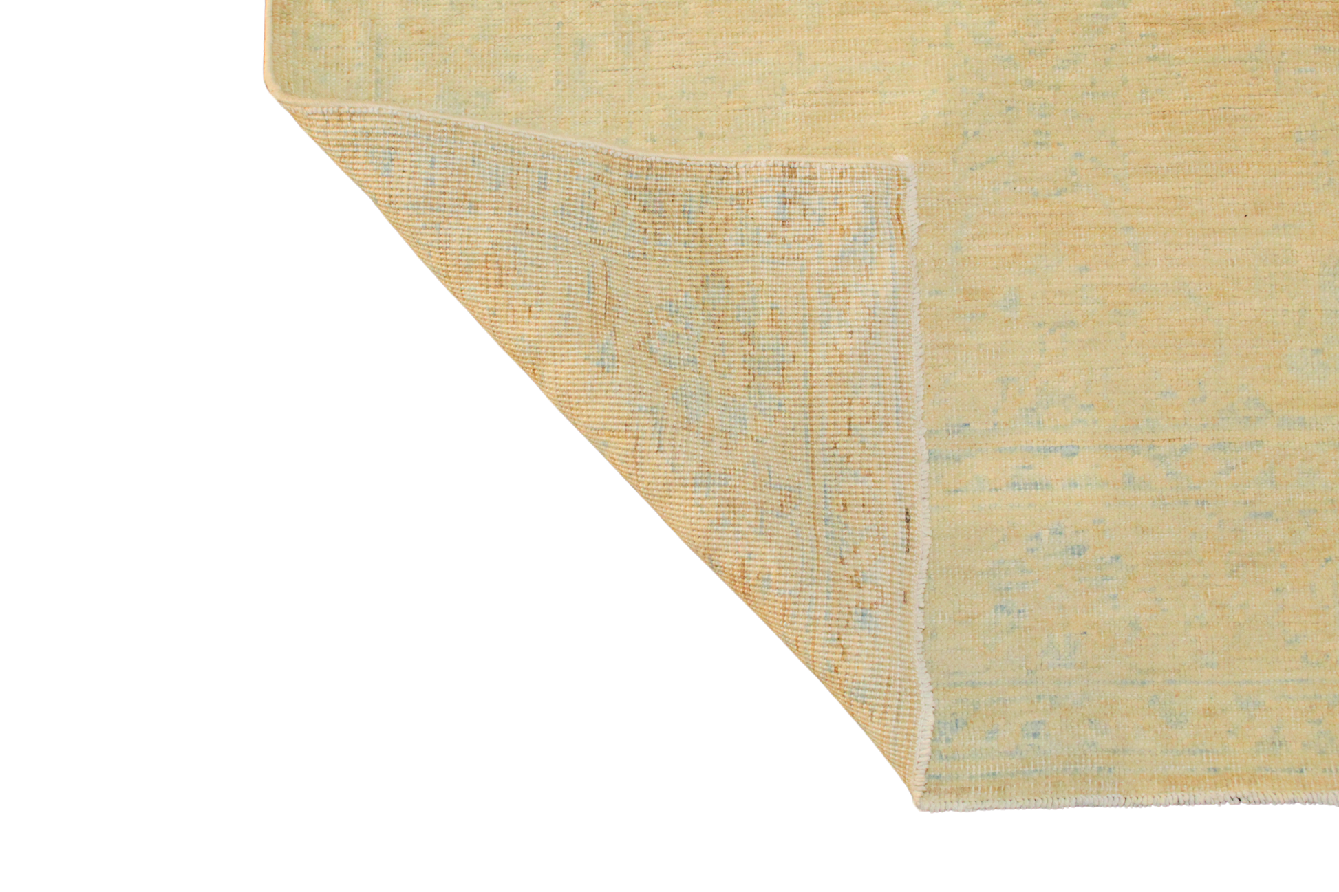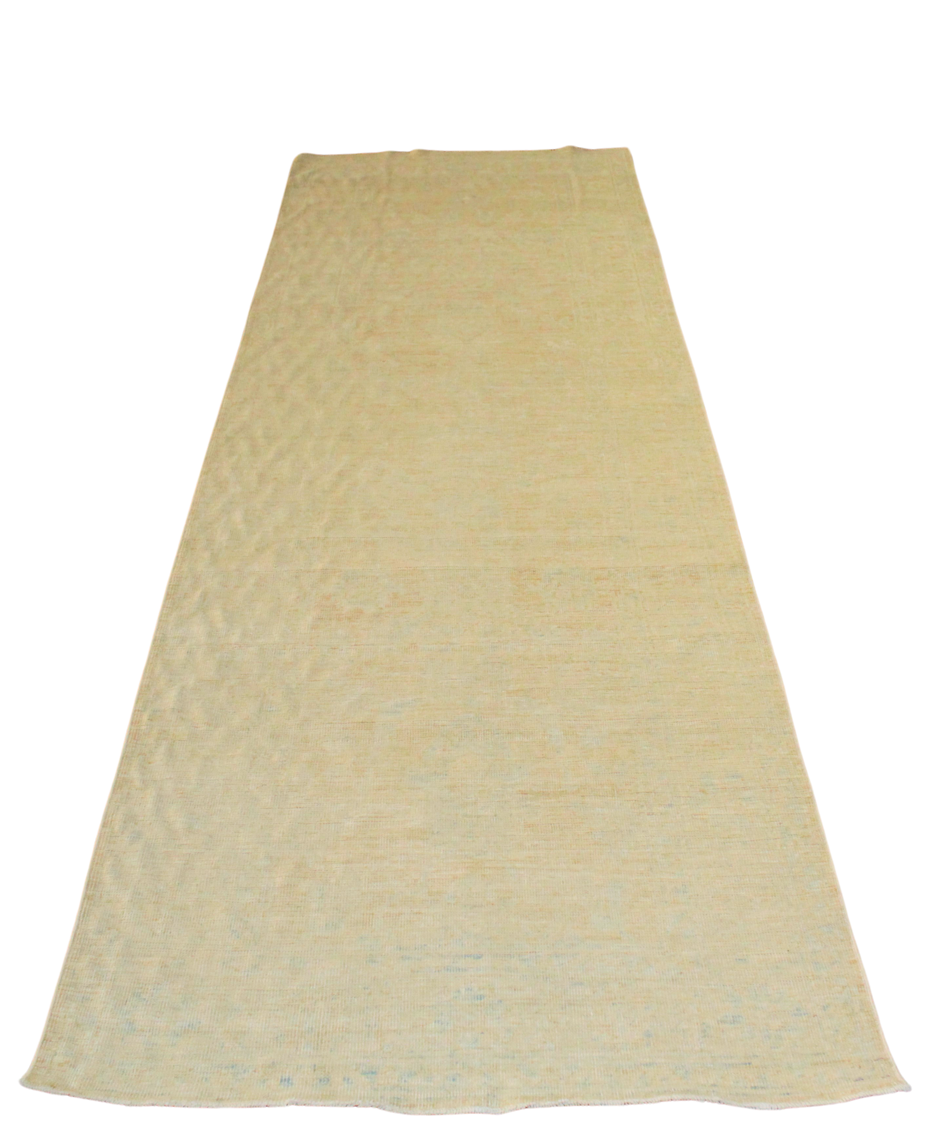 Refined in its simplicity, this hand-knotted Oushak runner from Afghanistan (3.1 × 9.11 ft) leans into understated elegance. The rug features a nearly tone-on-tone ivory field with the faintest whisper of geometric motifs subtly emerging from the wool surface, visible only at certain angles due to the natural abrash and pile sheen. This minimalist approach lets texture take center stage, making the piece as tactile as it is visually quiet.
