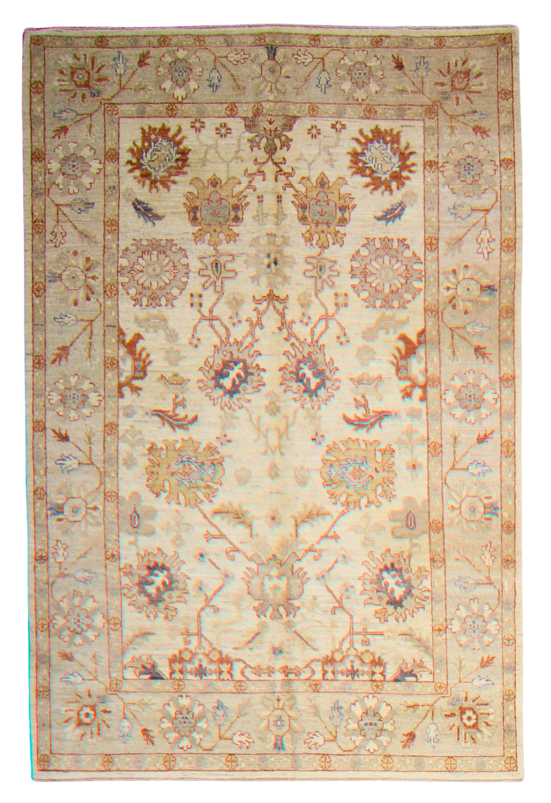 Radiating a gentle warmth, this 6.1 × 8.11 ft hand-knotted Oushak rug from Pakistan is a tranquil take on traditional design. The ivory field is decorated with a symmetrical lattice of stylized palmettes and floral sprays in muted tones of soft rust, powder blue, faded gold, and silvery beige.