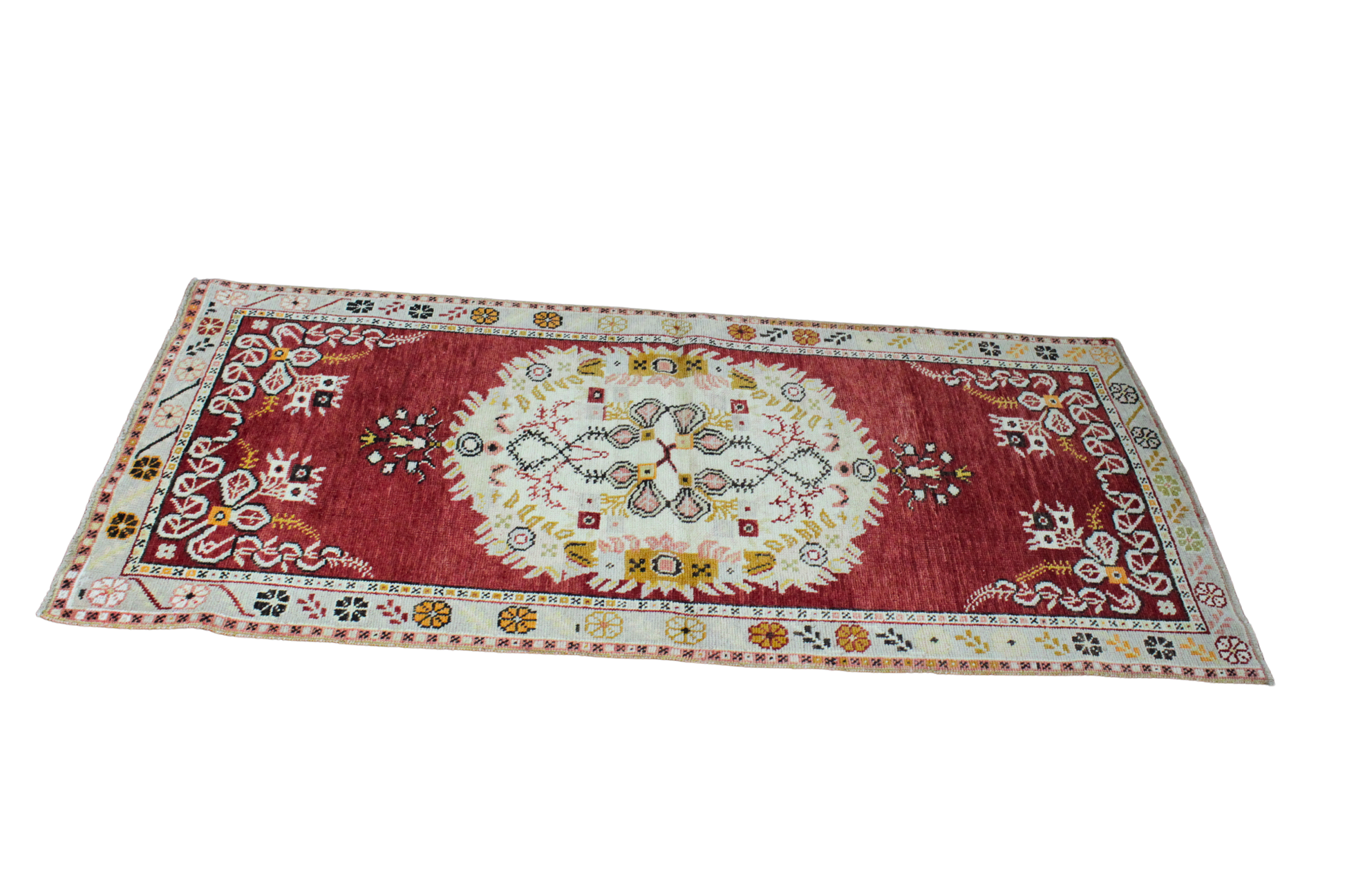 The rug features a vibrant crimson red field framing a large, central cream medallion, richly decorated with symbolic floral motifs and tribal scrolls. Delicate accents in mustard, blush, and black are scattered throughout the composition, giving the piece a playful rhythm. The main border, filled with a series of stylized rosettes and miniature geometric figures, brings a folk-art aesthetic that feels both handmade and deeply personal.