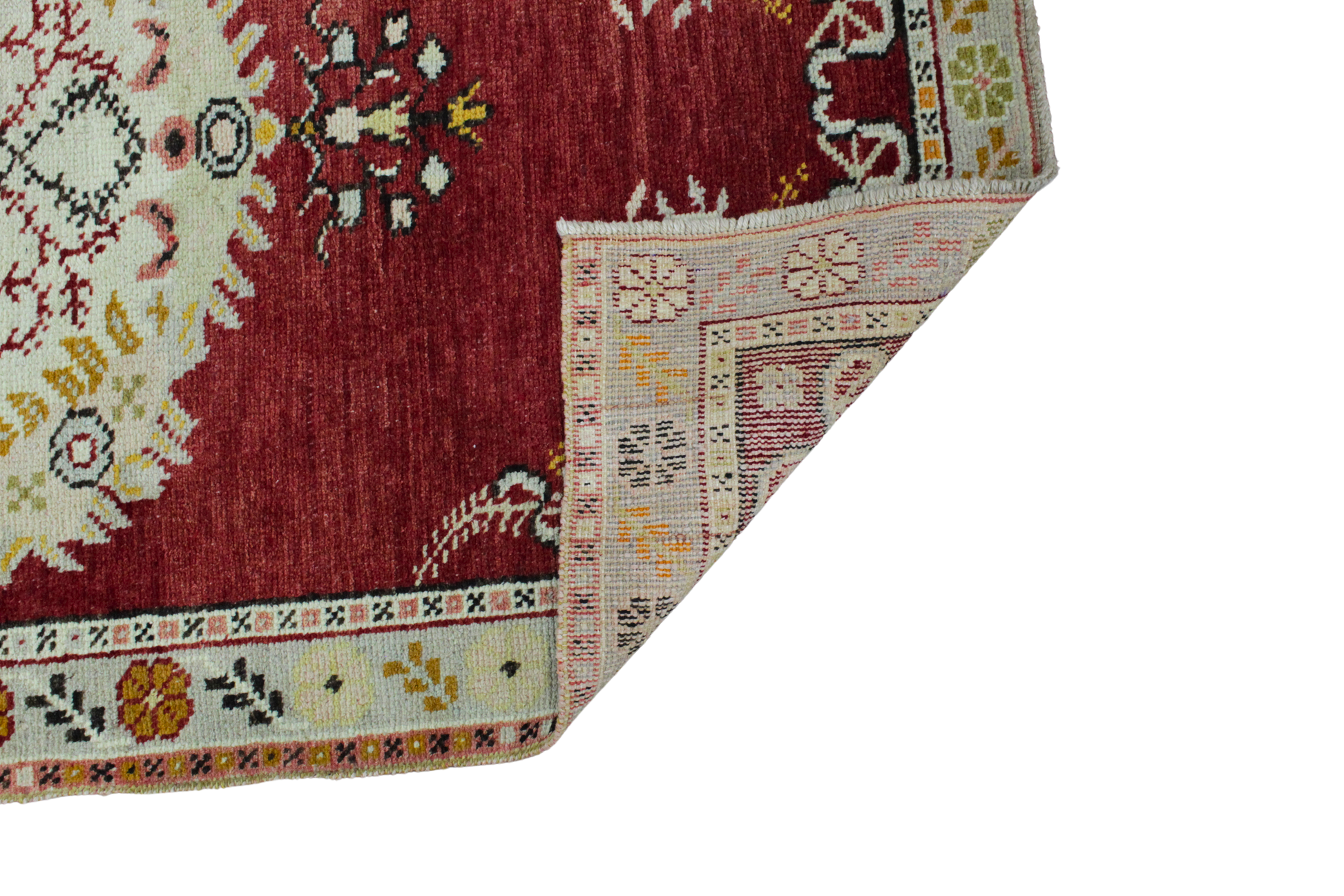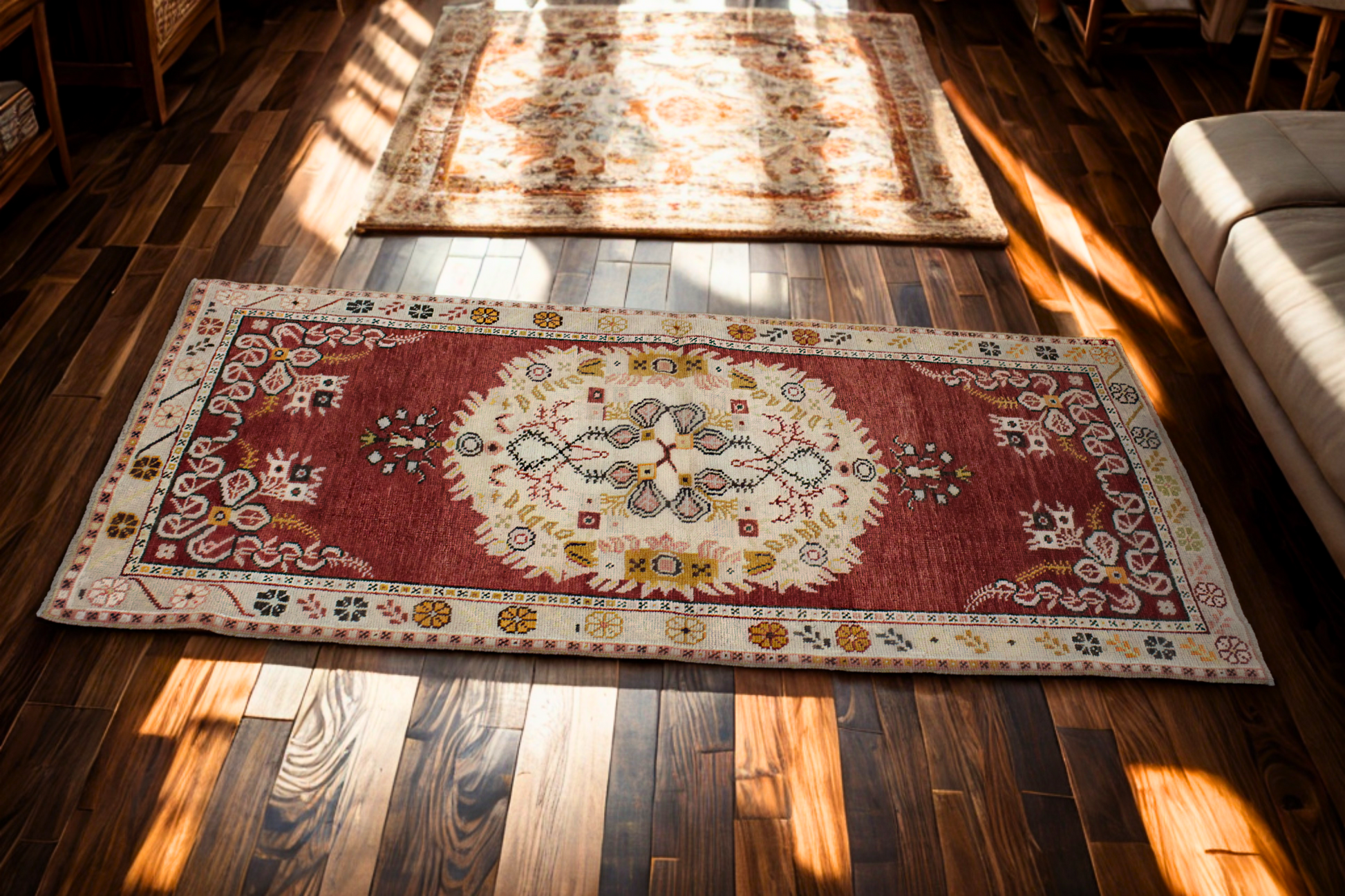 Charming Contrast — Turkish Oushak Rug in Crimson, Cream & Folk Motifs