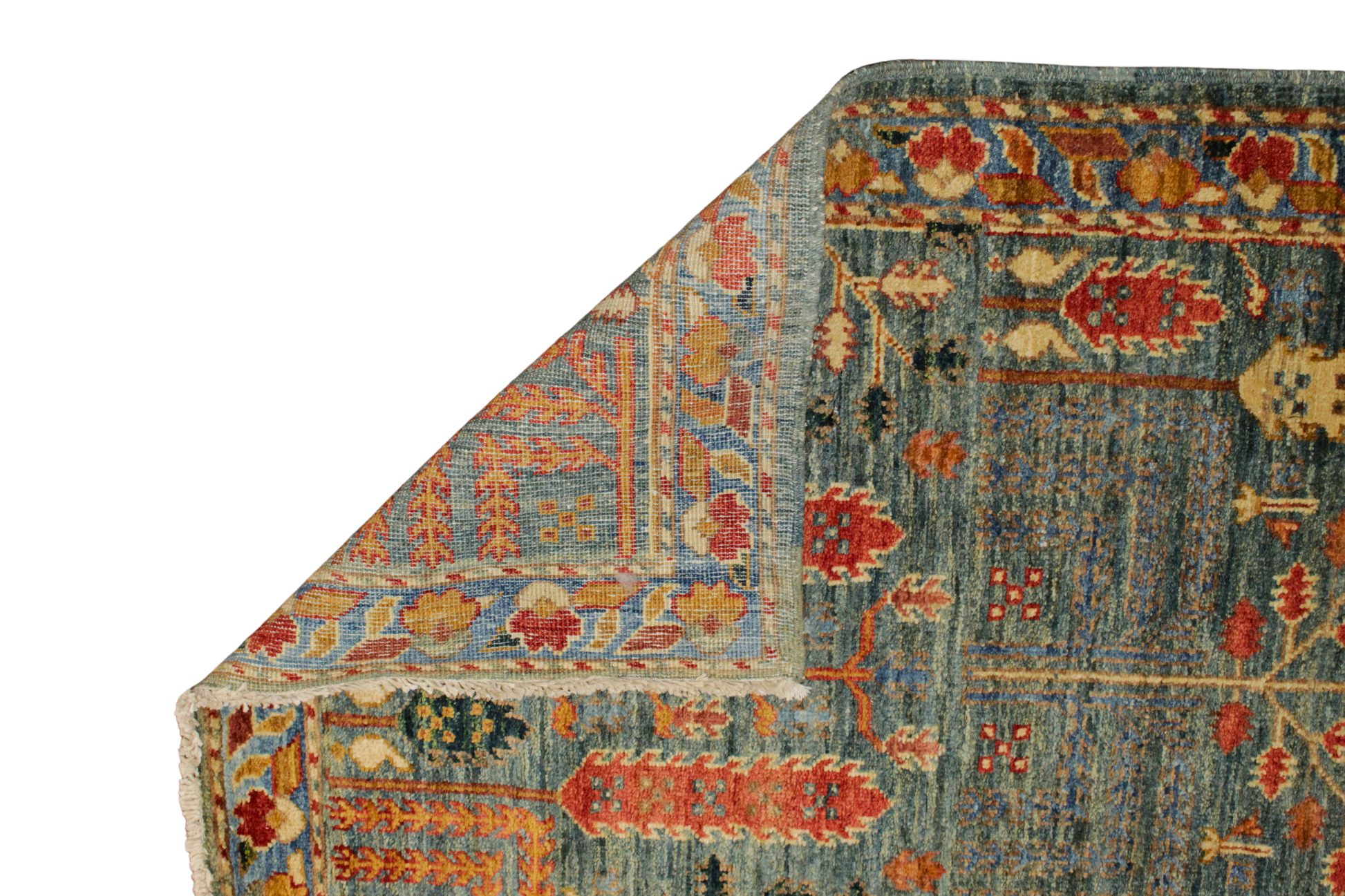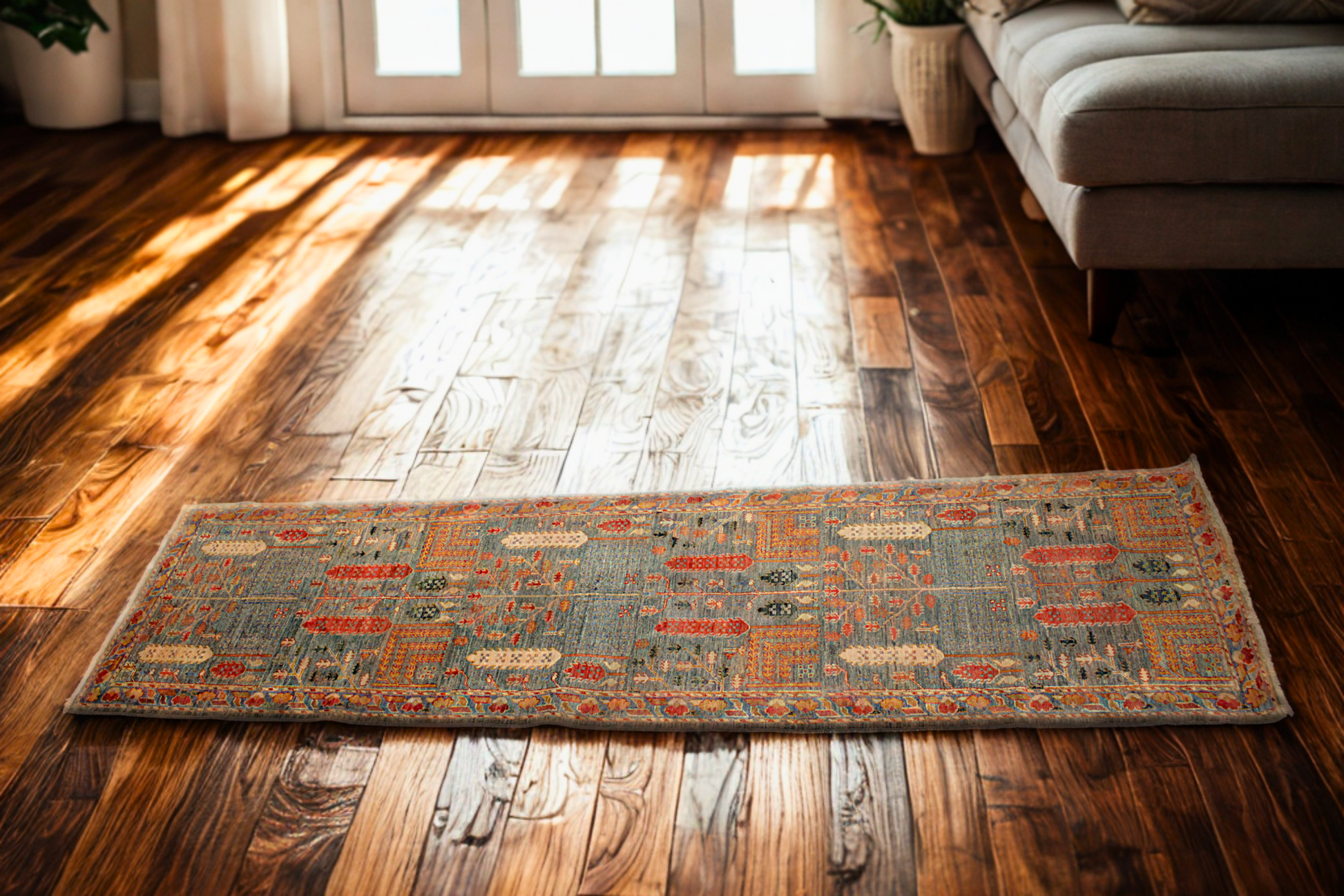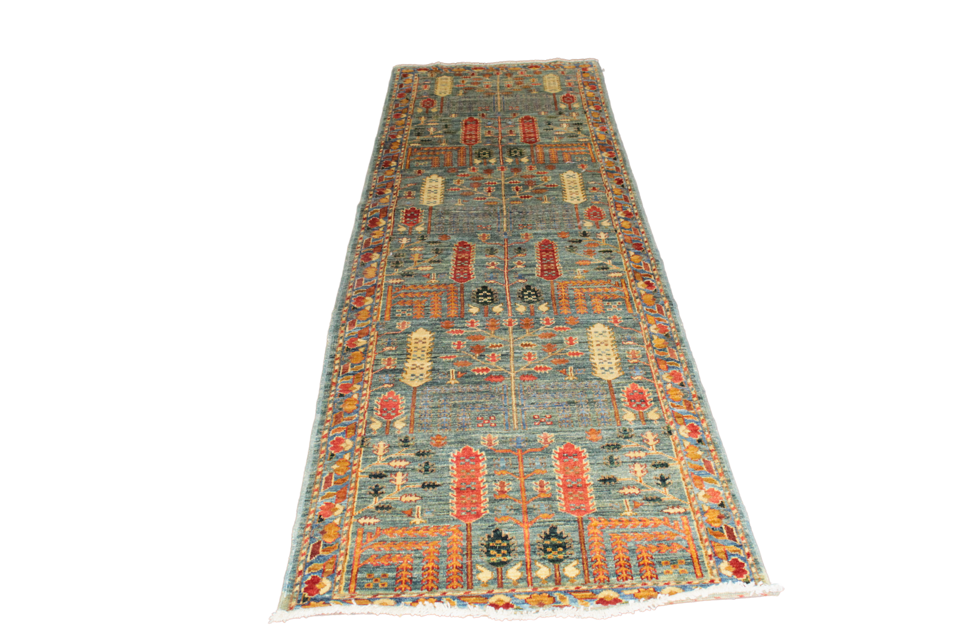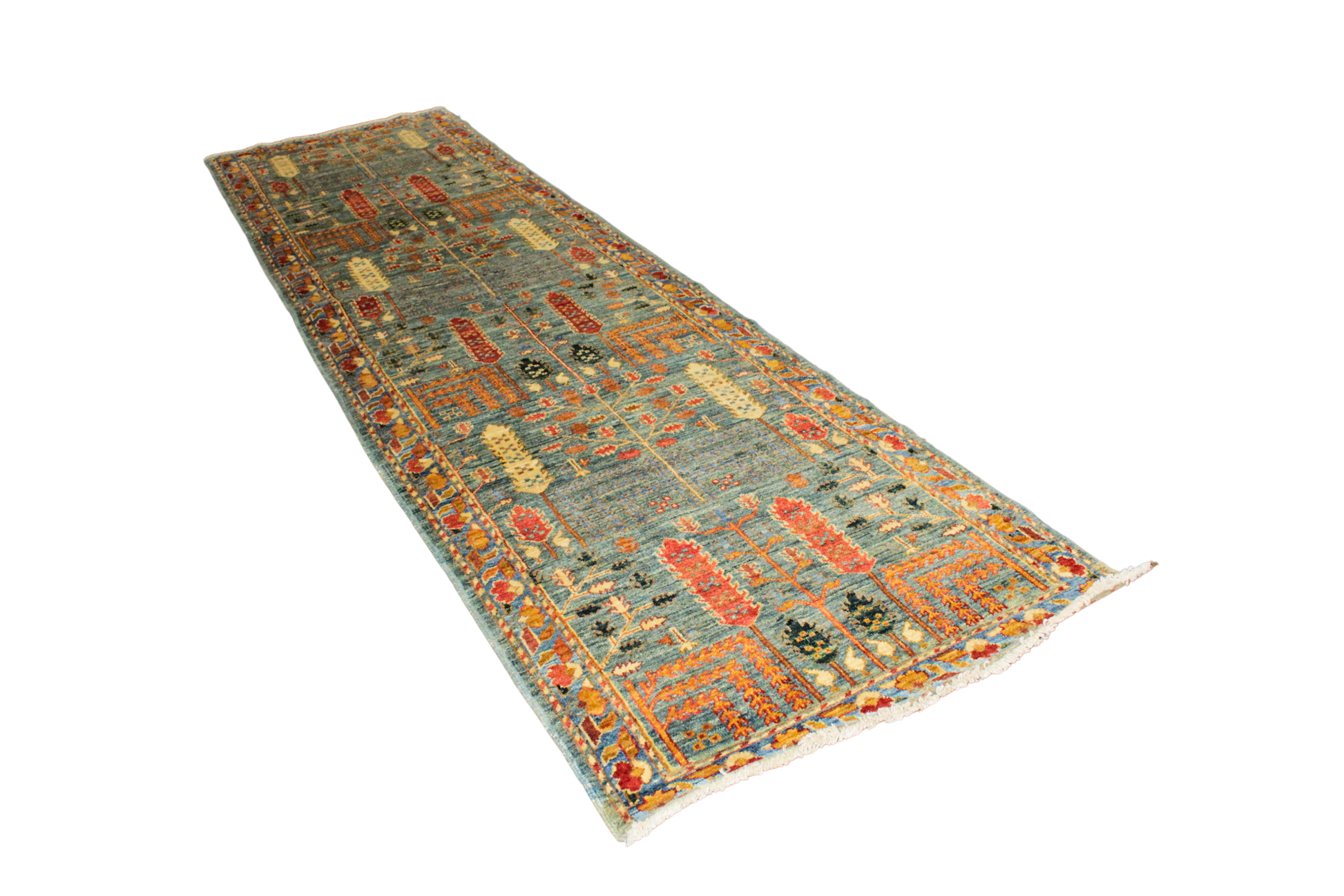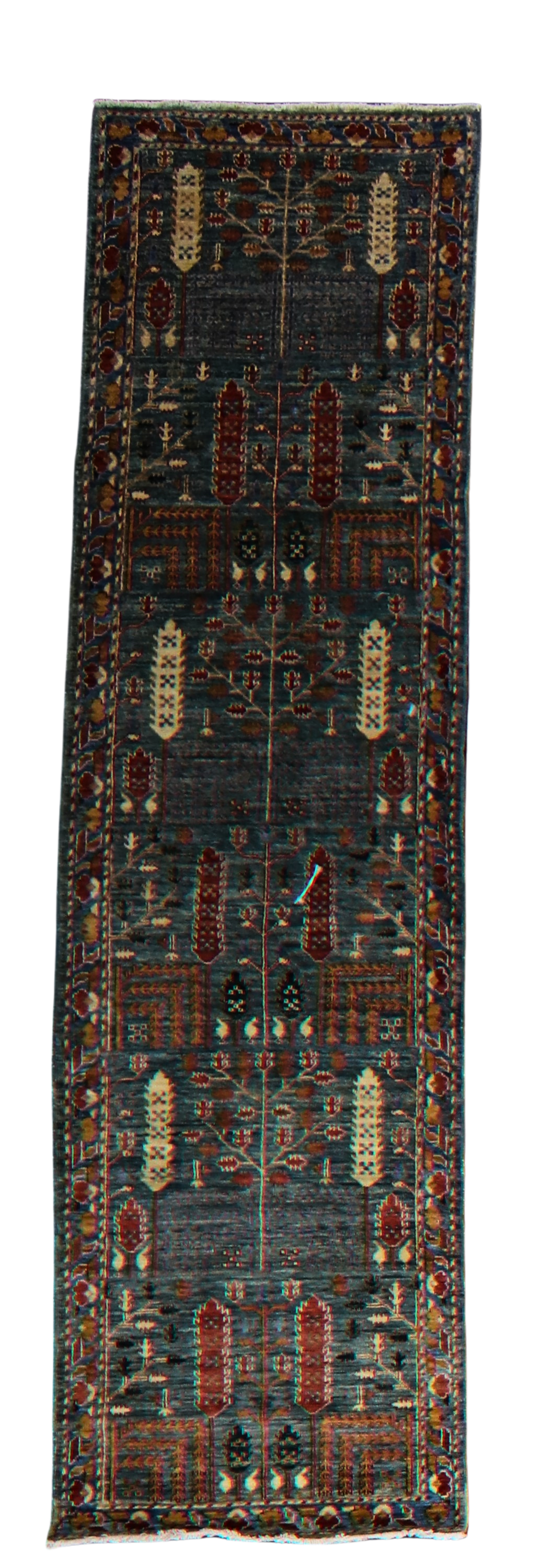 Alive with movement and bold expression, this hand-knotted Aryana runner (2.8 × 8.2 ft) from Afghanistan brings a rich, folkloric sensibility to any space it graces. Its deep teal-blue ground serves as the backdrop for an enchanting vertical garden of stylized trees, abstract florals, and tribal motifs — all arranged with rhythmic symmetry and confident colorwork.