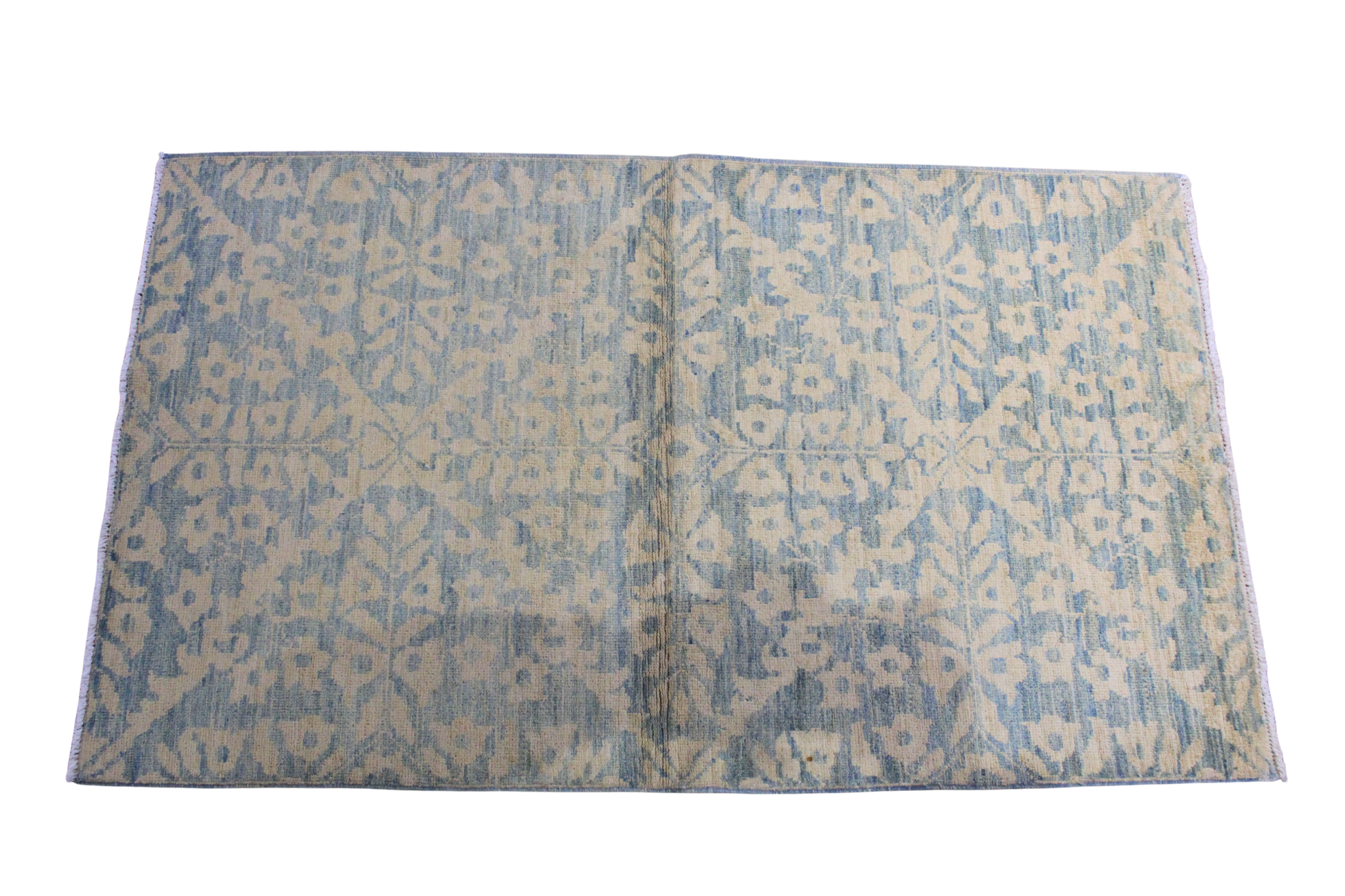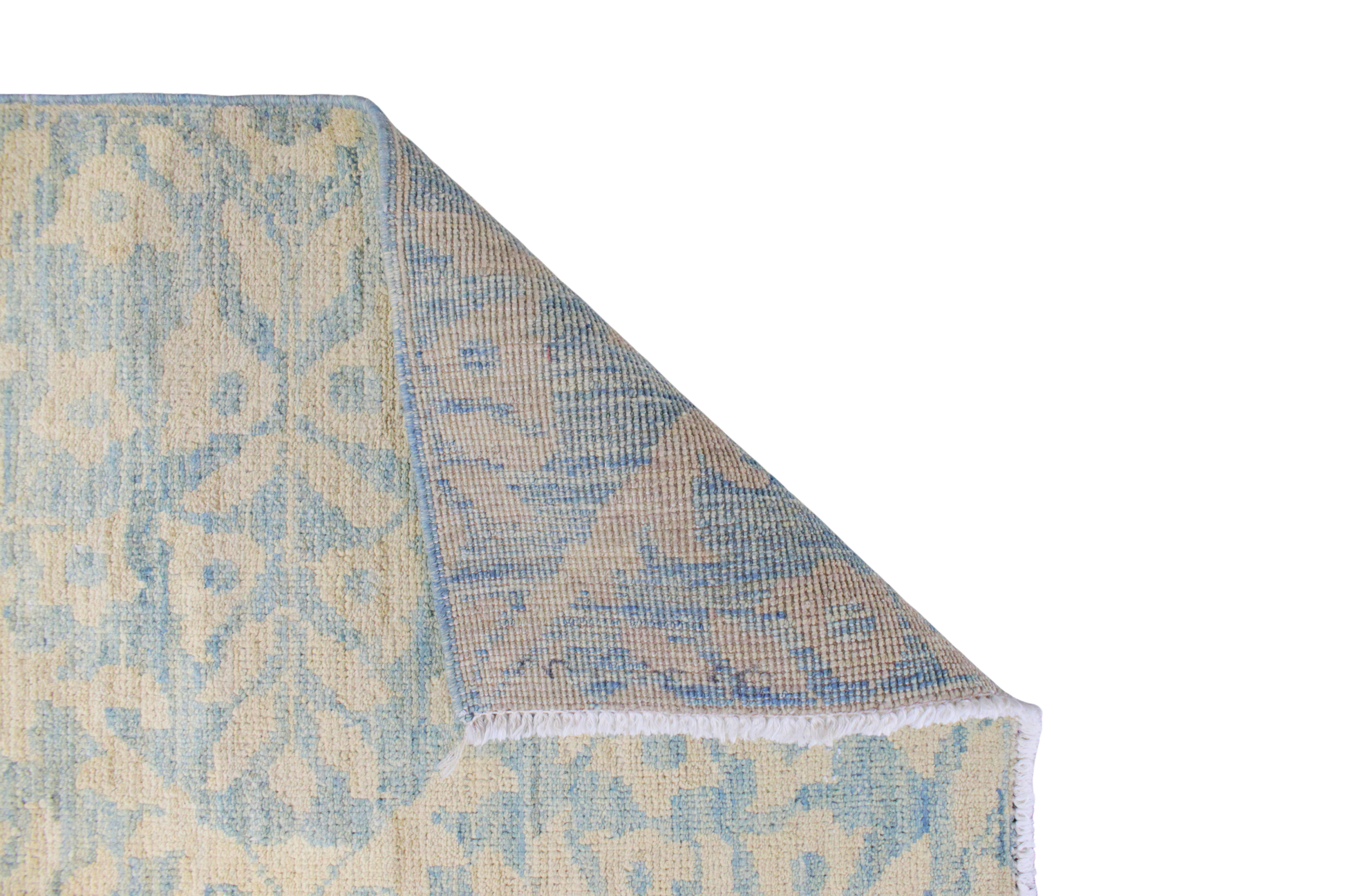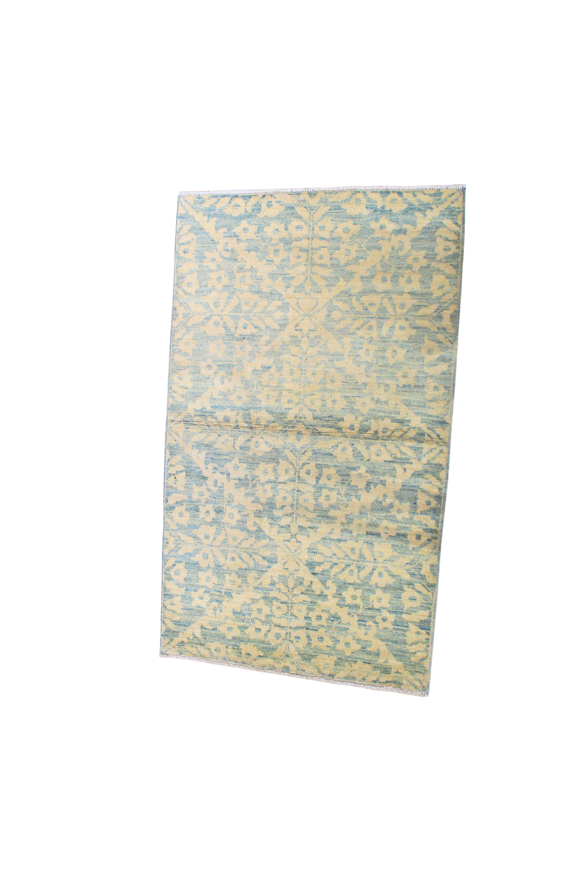 A breath of fresh air in woven form, this charming Oushak rug from Afghanistan (3 × 5 ft) infuses any space with softness and serenity. The repeating floral lattice floats gently across a misty blue and ivory ground, evoking the delicate rhythm of spring blossoms. The subtle abrash — or tonal shifts — adds dimension and a vintage-like texture, enhancing the artisanal charm of the weave.
