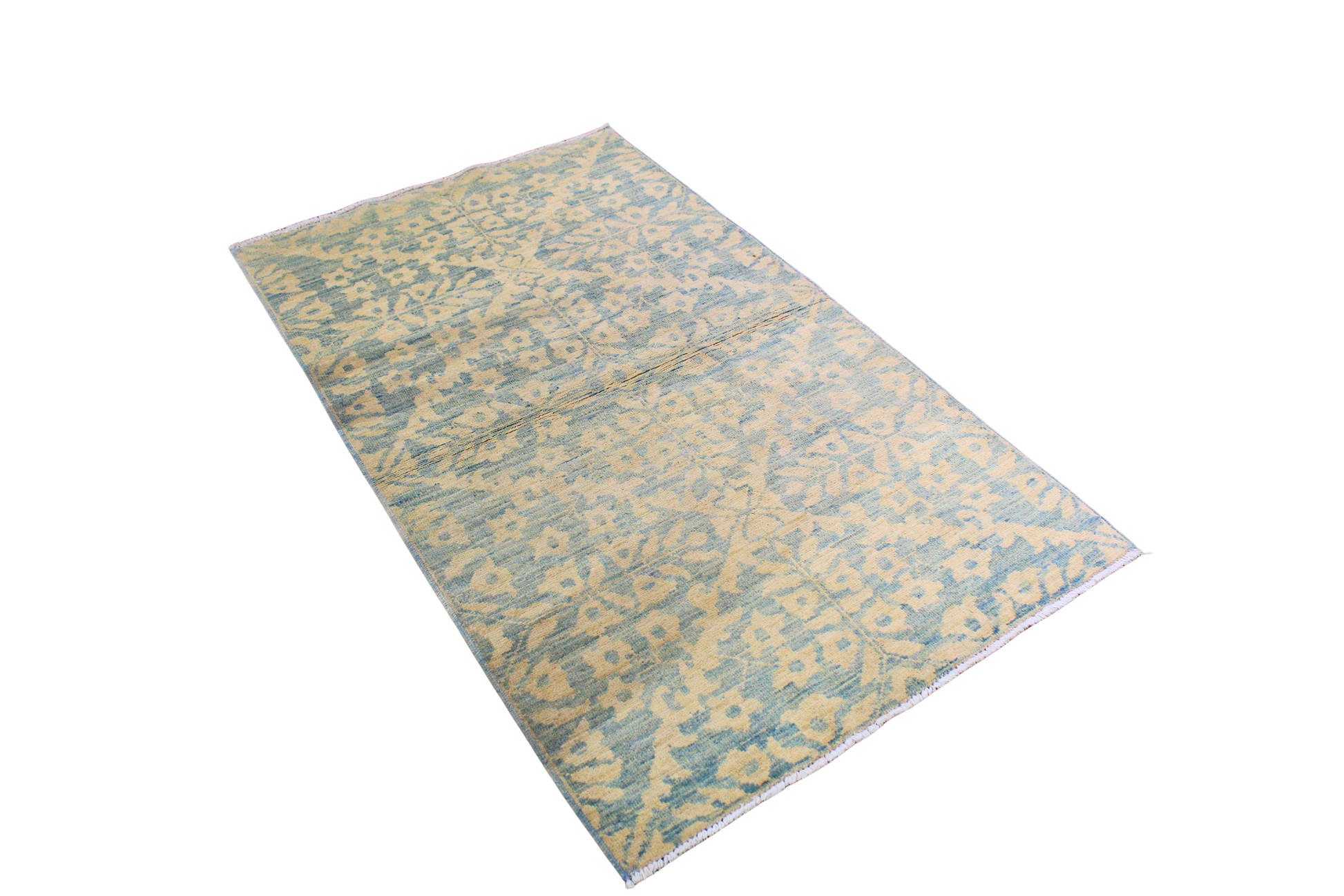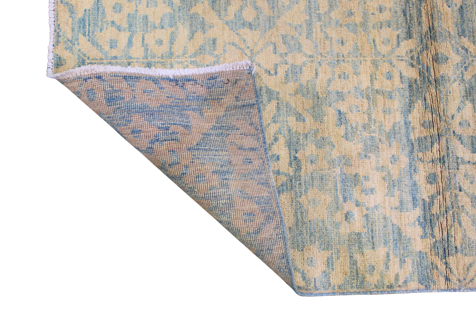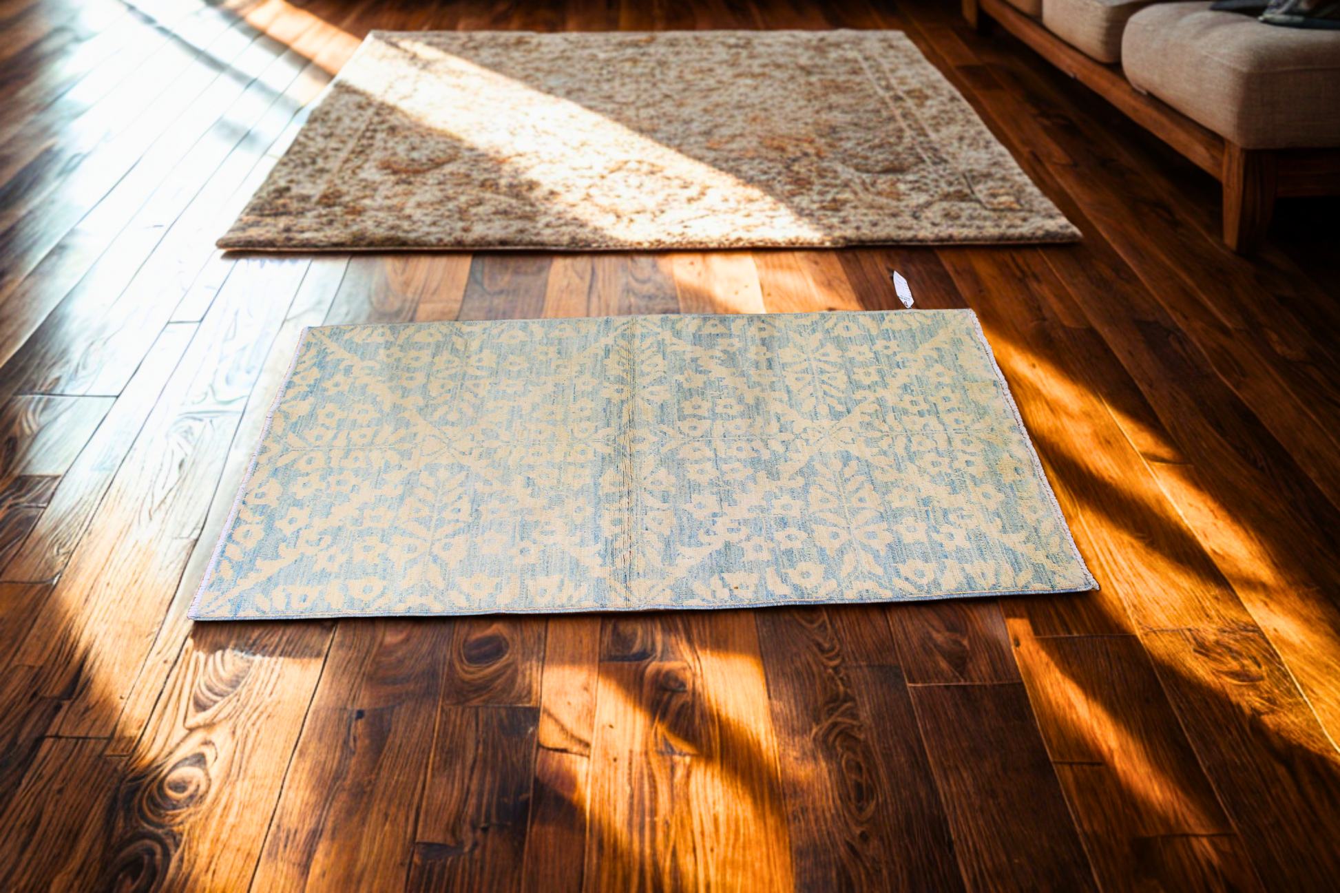 A breath of fresh air in woven form, this charming Oushak rug from Afghanistan (3 × 5 ft) infuses any space with softness and serenity. The repeating floral lattice floats gently across a misty blue and ivory ground, evoking the delicate rhythm of spring blossoms. The subtle abrash — or tonal shifts — adds dimension and a vintage-like texture, enhancing the artisanal charm of the weave.