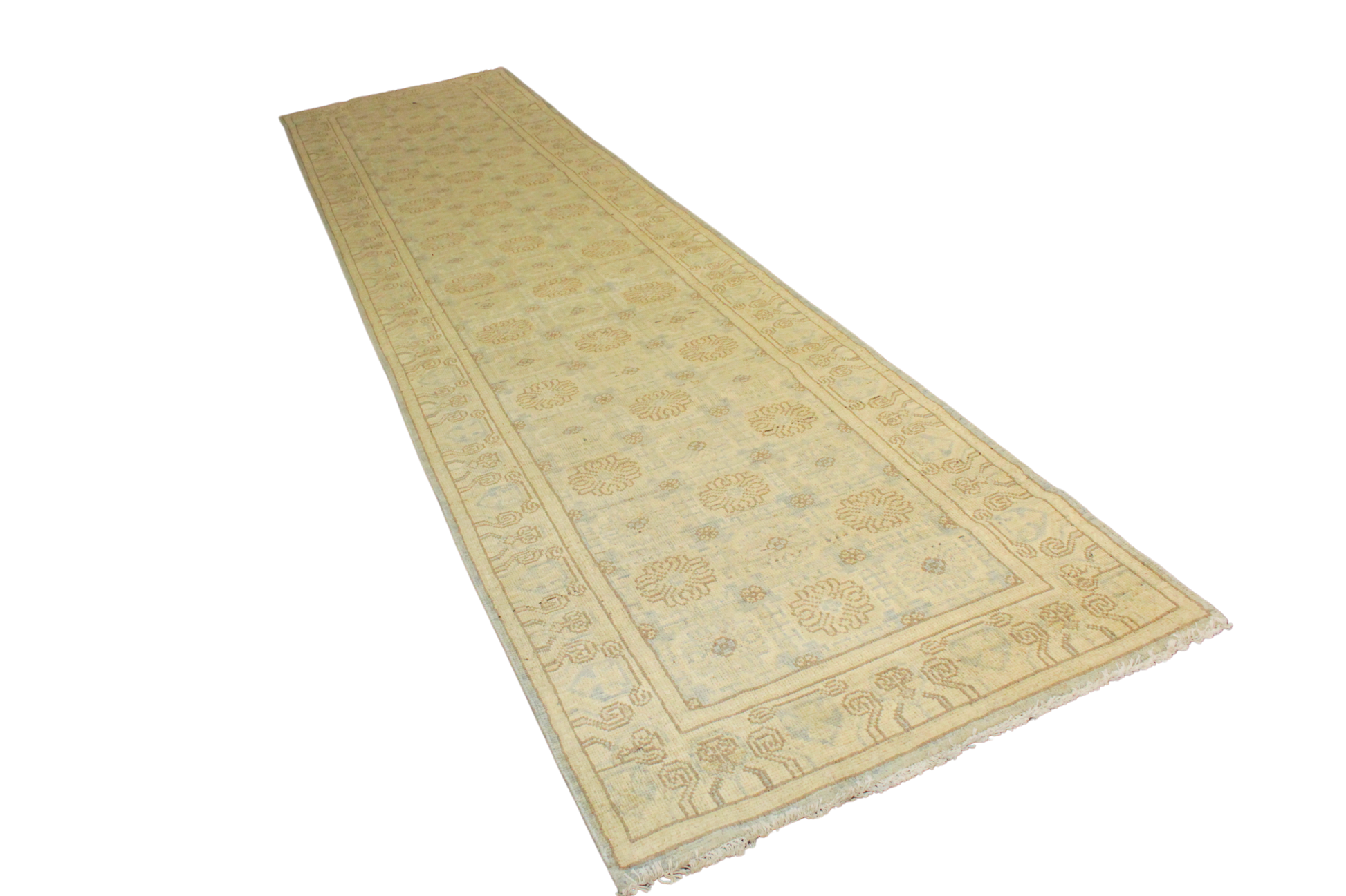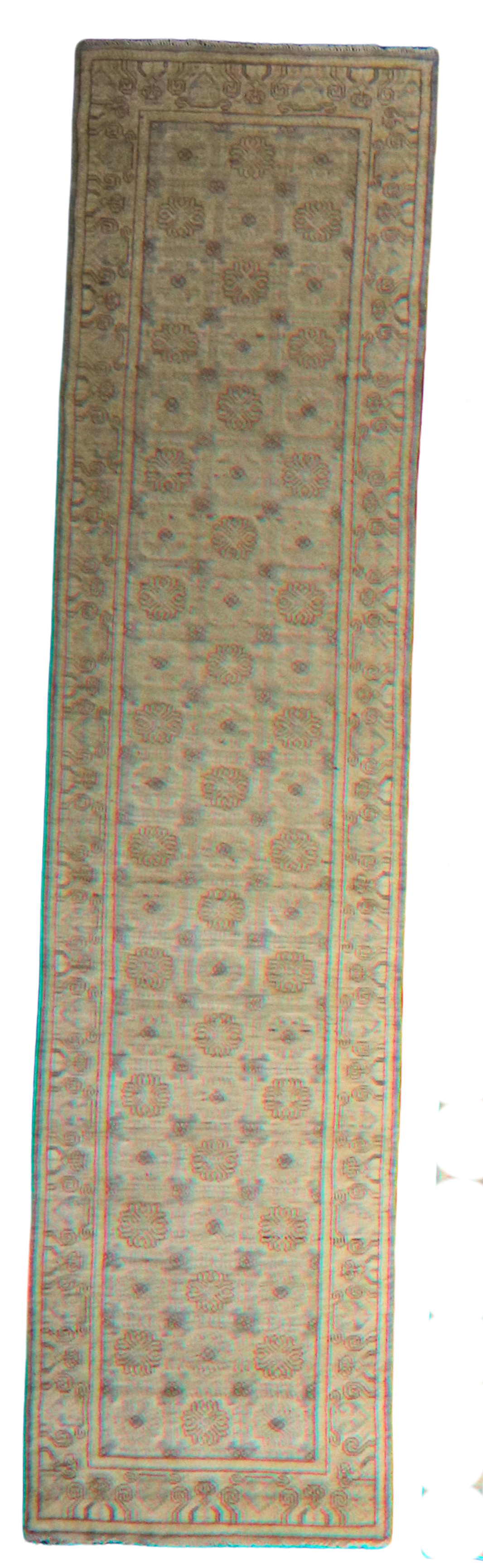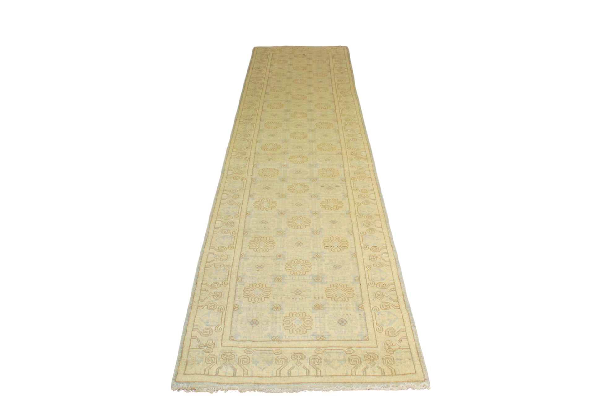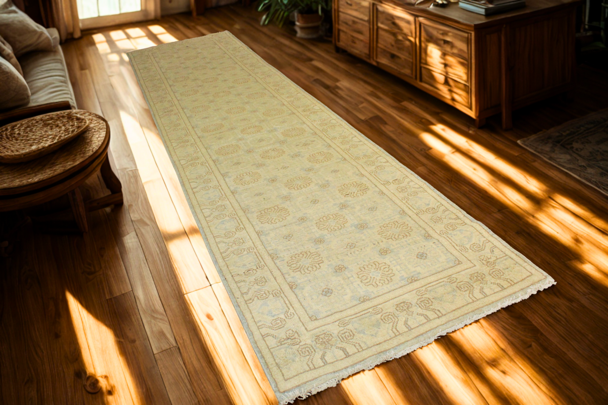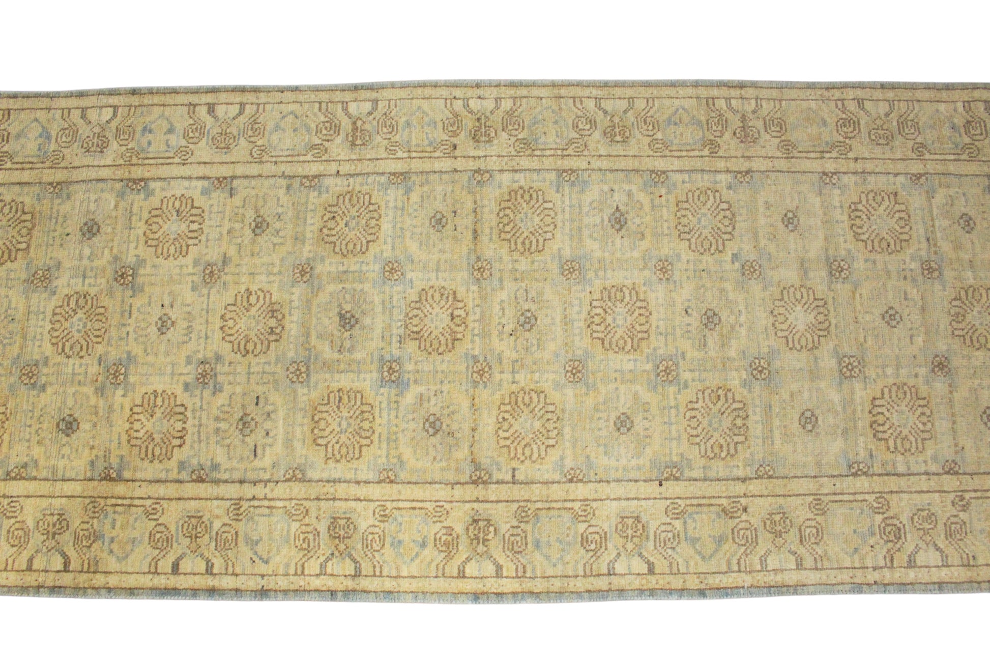 Blending restraint with detail, this Afghan Khottan runner draws on traditional East Turkestan motifs to deliver quiet luxury. The allover geometric medallion pattern repeats across a soft palette of weathered taupe, mist, and cloud gray, forming a nearly tone-on-tone harmony. Each medallion is meticulously framed in squared symmetry, offering a rhythm that feels both ancient and architectural.