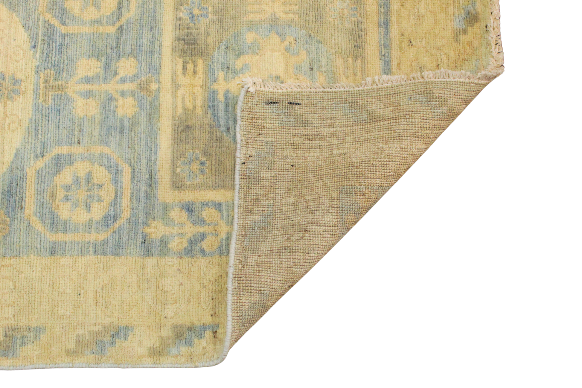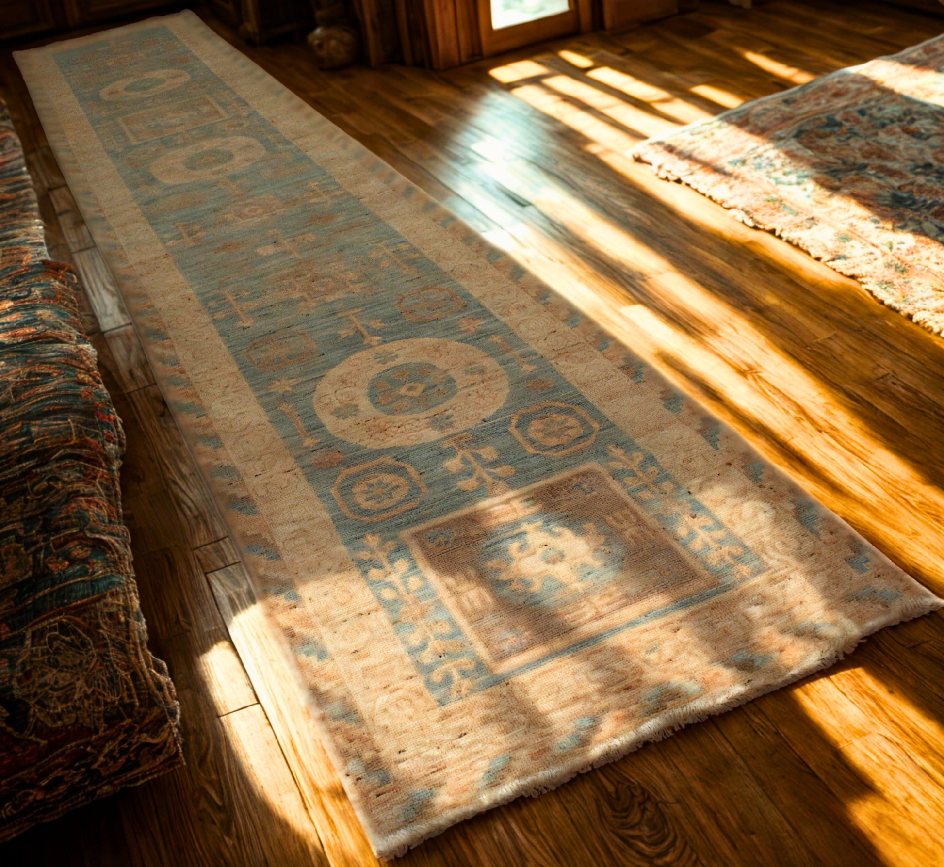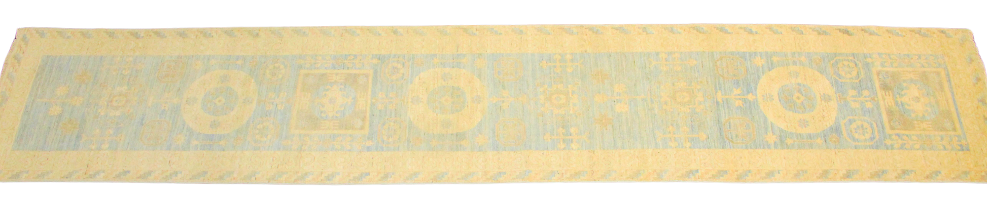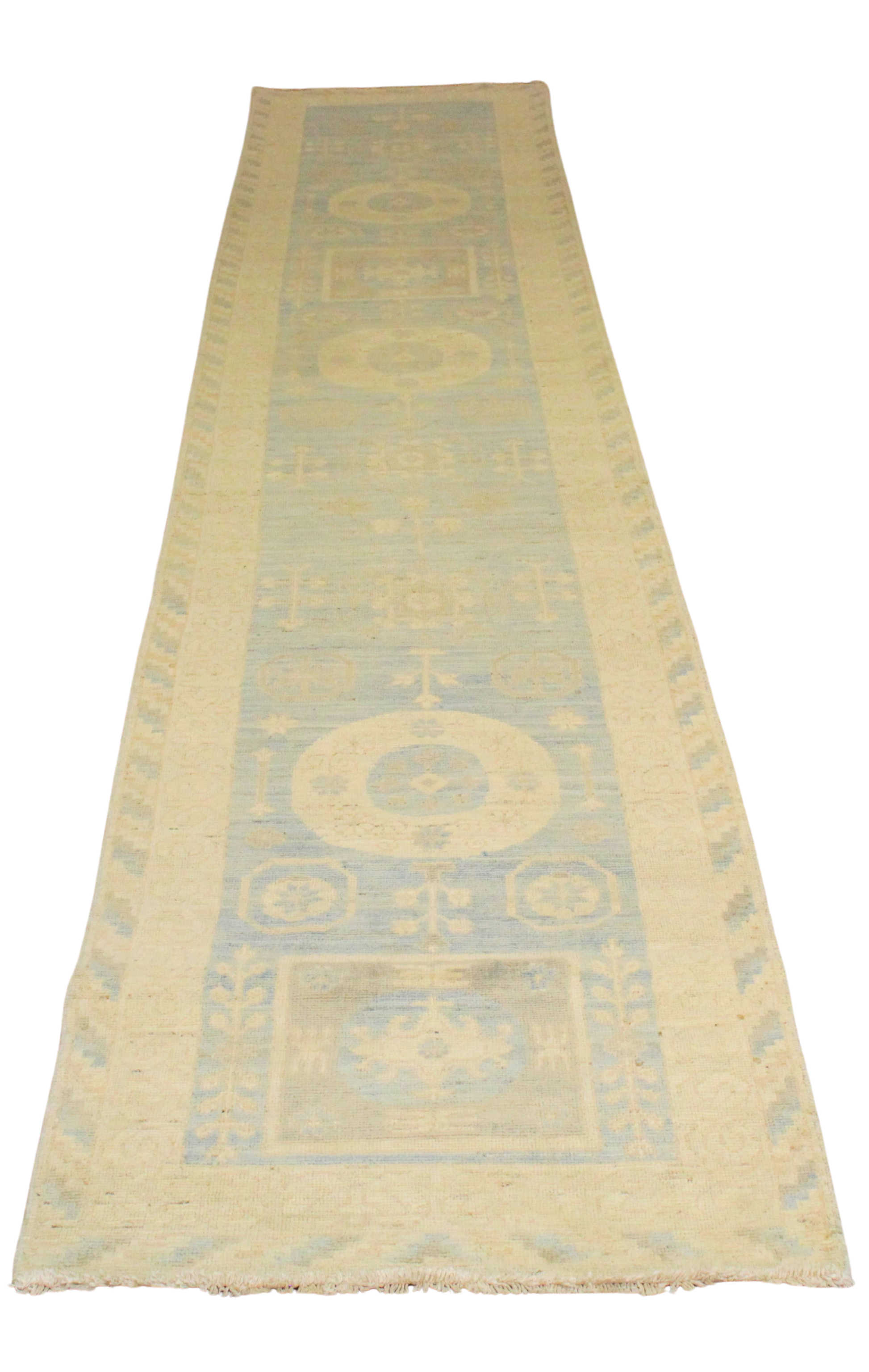 This long and graceful Afghan Oushak runner captures serenity in motion with its pastel tones and refined tribal geometry. The pale sky-blue field is punctuated by large medallions, floral rosettes, and symbolic figures, each rendered in soft ivory and parchment hues that feel airy and clean. The long vertical layout is perfectly suited to emphasize the rug’s rhythmic flow, guiding the eye along its harmonious, symmetrical path.