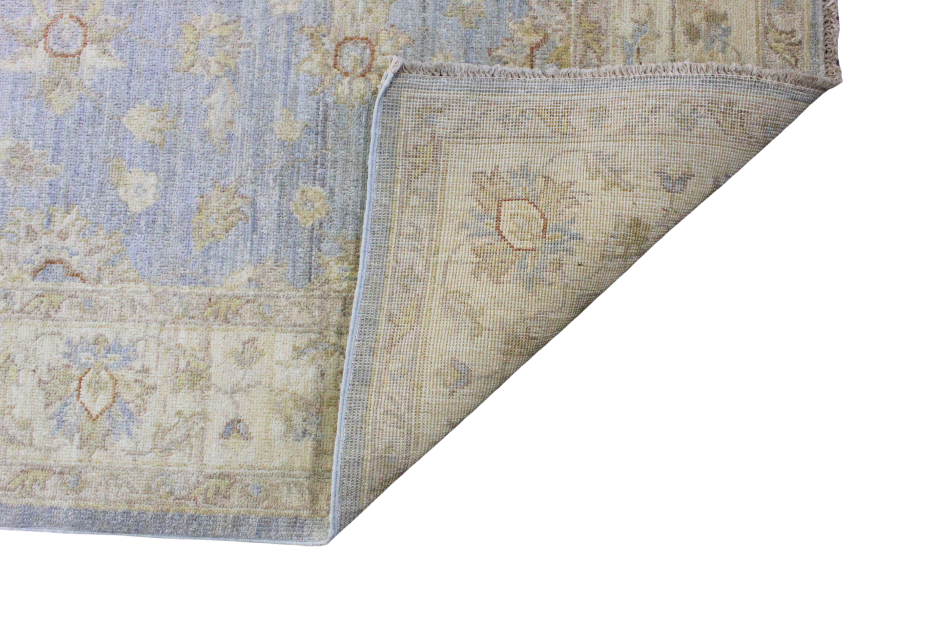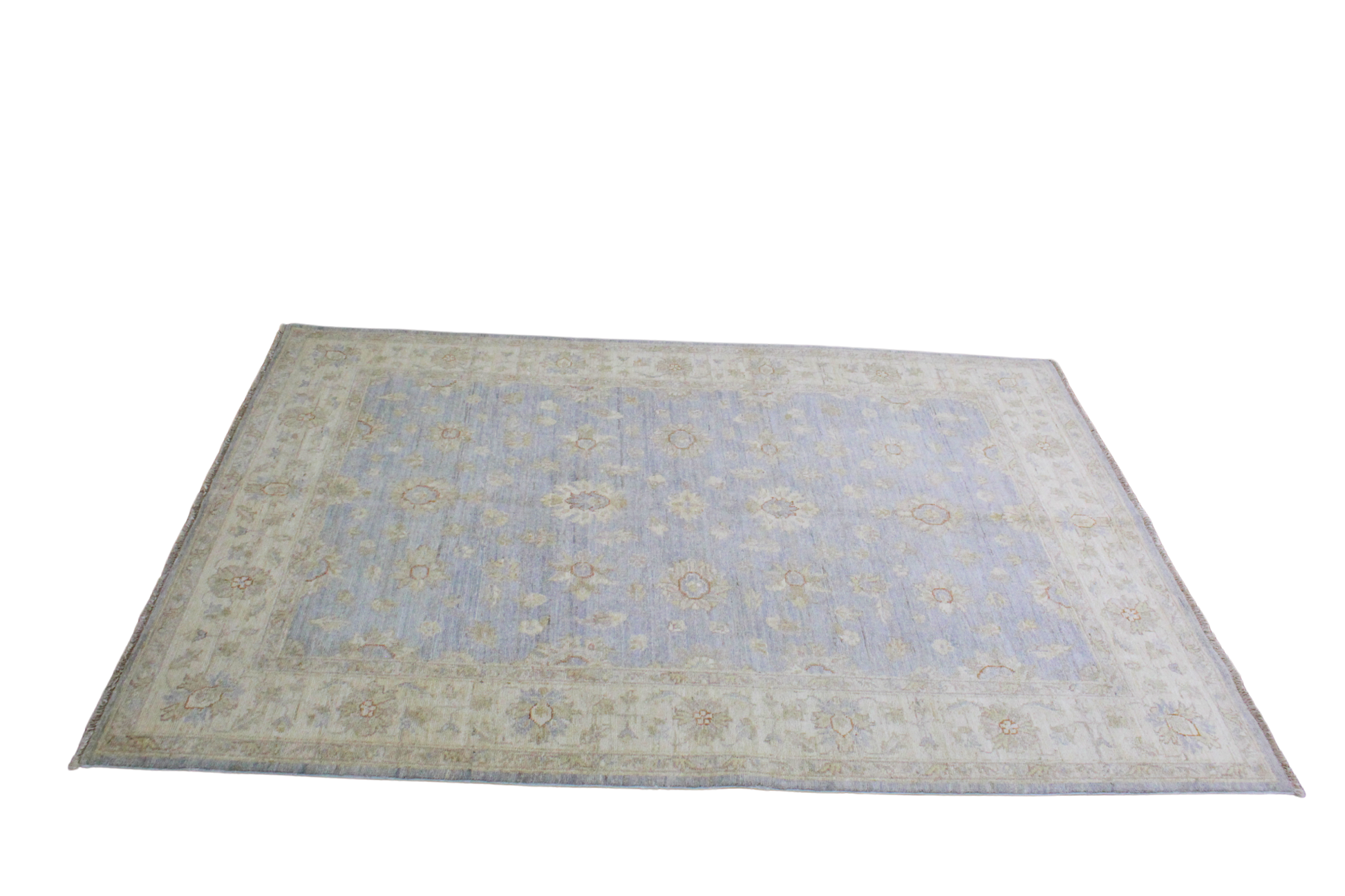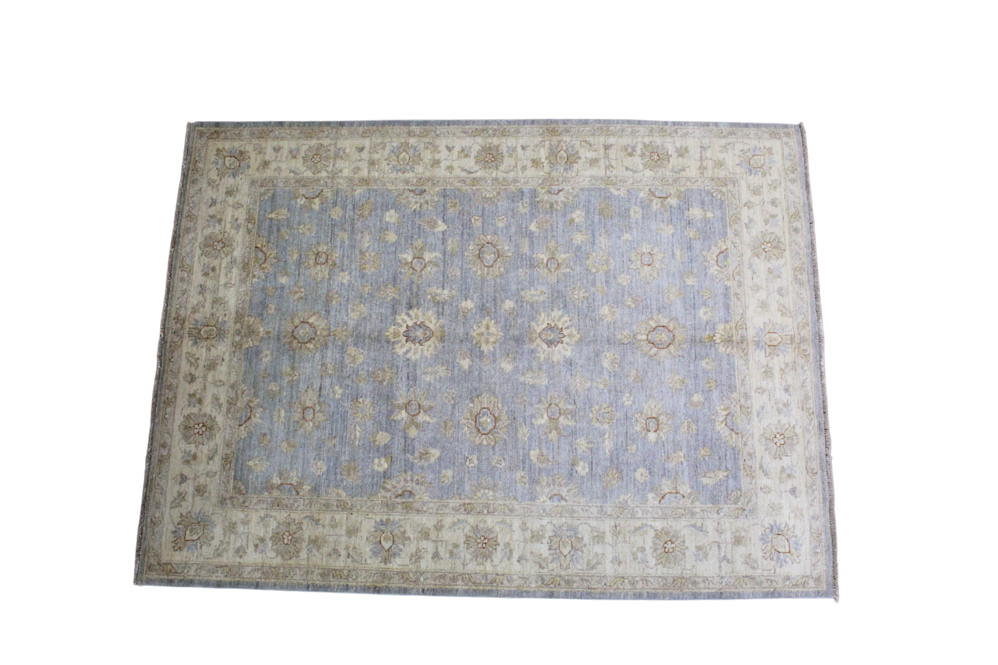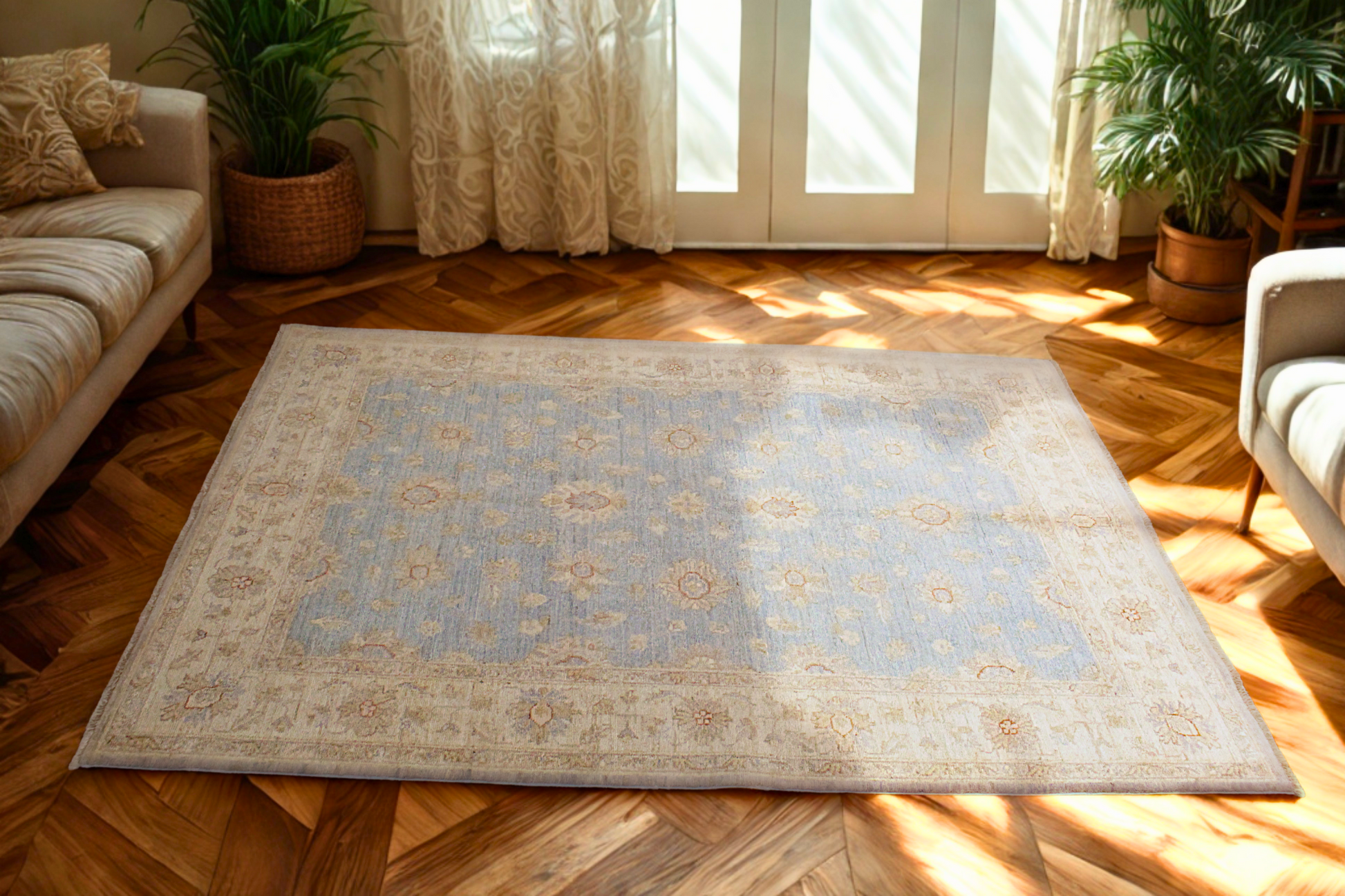 Rug 2615 is a 5 x 6.9 hand-knotted Oushak rug from Afghanistan, offering serene sophistication in a palette of soft blue and ivory. The field is gently decorated with an allover floral medallion design in subtle beige, cream, and light gray—forming a tranquil, symmetrical pattern. A wide ivory border with stylized blossoms and vine scrolls completes the piece, adding structure while maintaining its gentle, washed aesthetic.