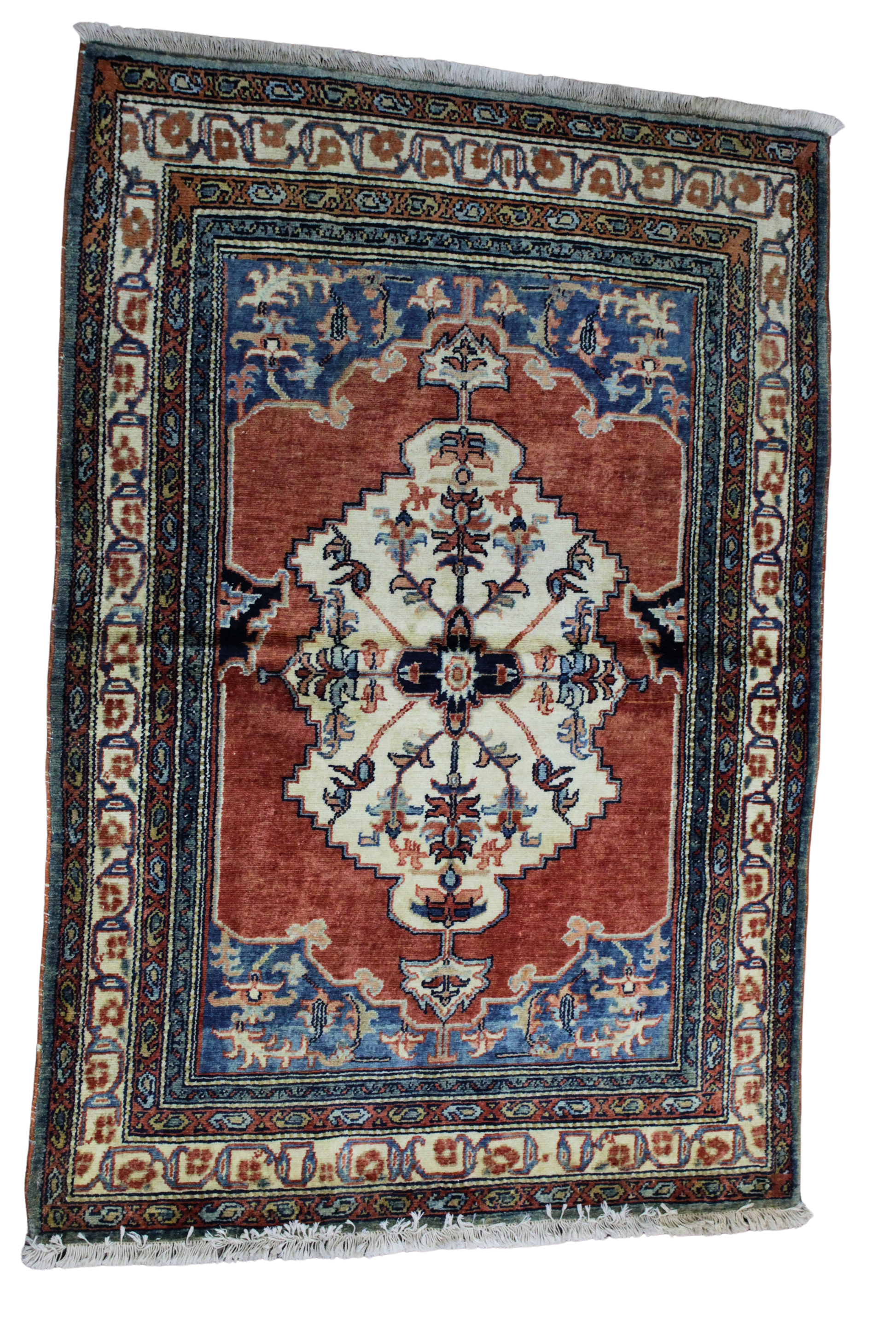 Bold and evocative, this antique-style Persian Mahal rug (stock number 2632) from persian makes a grand visual statement in compact form. Measuring 3.6 x 4.11 ft, it features a commanding medallion layout—an ivory central field filled with scrolling palmettes and floral tracery, surrounded by a deep rust-red ground and vibrant cobalt blue spandrels.
