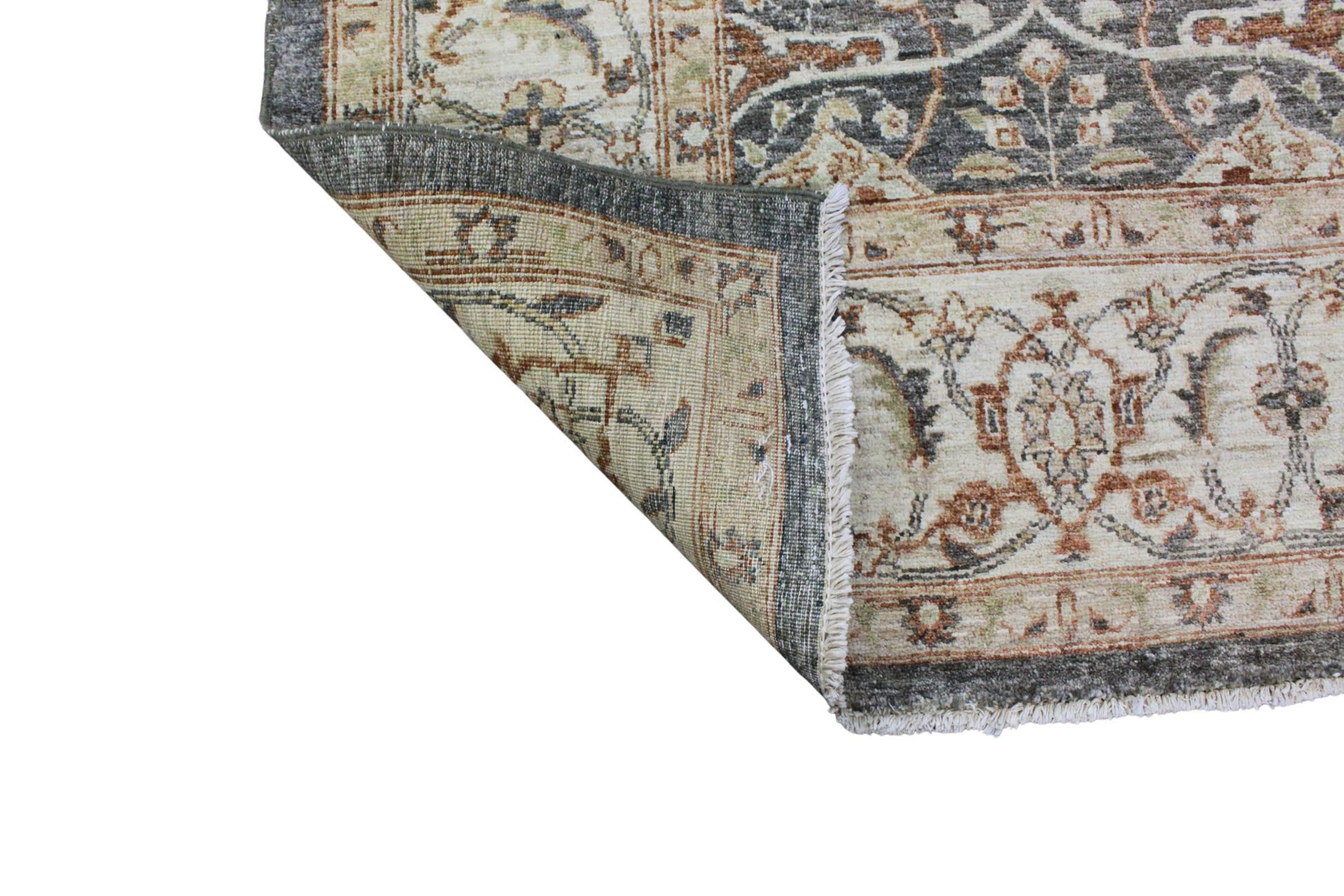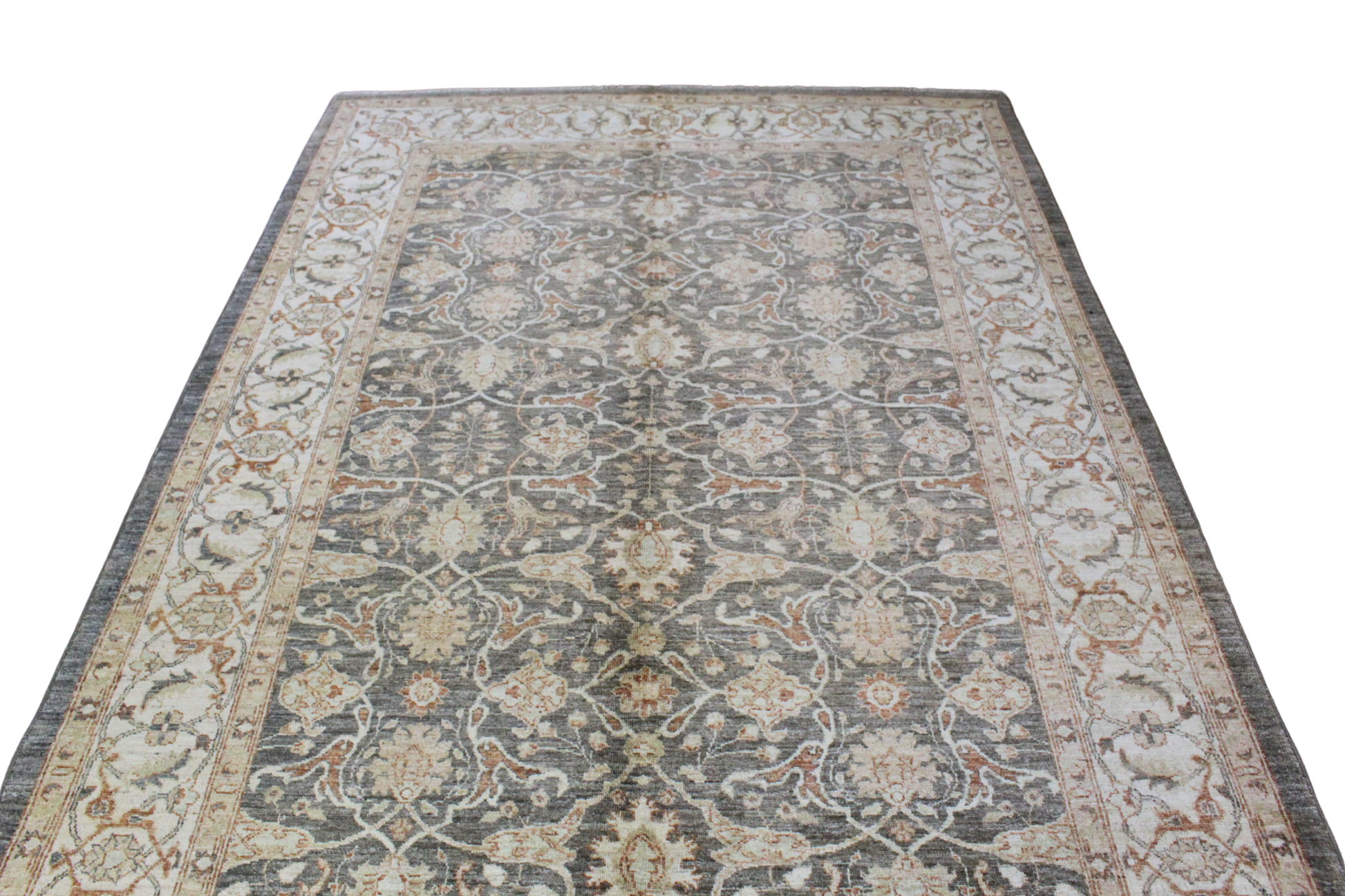 With a moody palette and graceful, meandering floral motifs, this 6.1 × 9.7 ft hand-knotted Oushak rug from Afghanistan captures the essence of antique sophistication. The background tone is a smoky grayish-brown that gives way to a layered garden of stylized palmettes, vines, and rosettes in warm ivory, dusty rose, and muted tan.