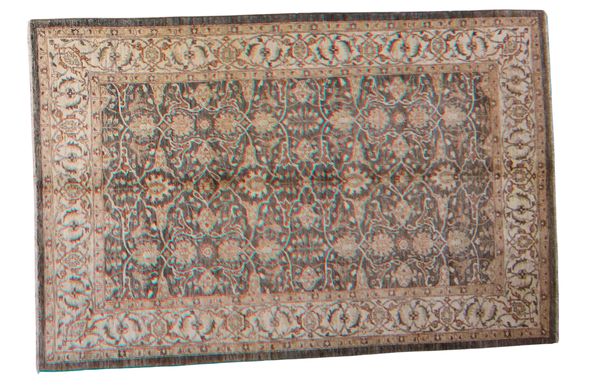 Design: Floral palmettes and vinery on a smoky field with wide ivory border