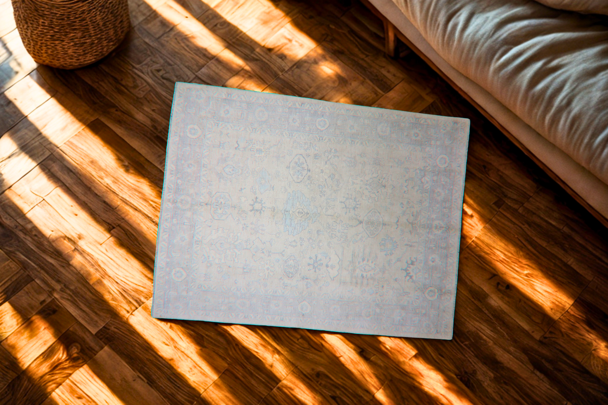 Like morning mist over ancient hills, this hand-knotted Oushak rug from Afghanistan (8.10 × 11.6 ft) exudes quiet luxury with its gently faded palette of chalky ivory, moon-washed blue, and whisper-gray tones. Its open, tribal-inspired design features stylized medallions, angular florals, and stepped motifs that feel both timeless and refreshingly modern.