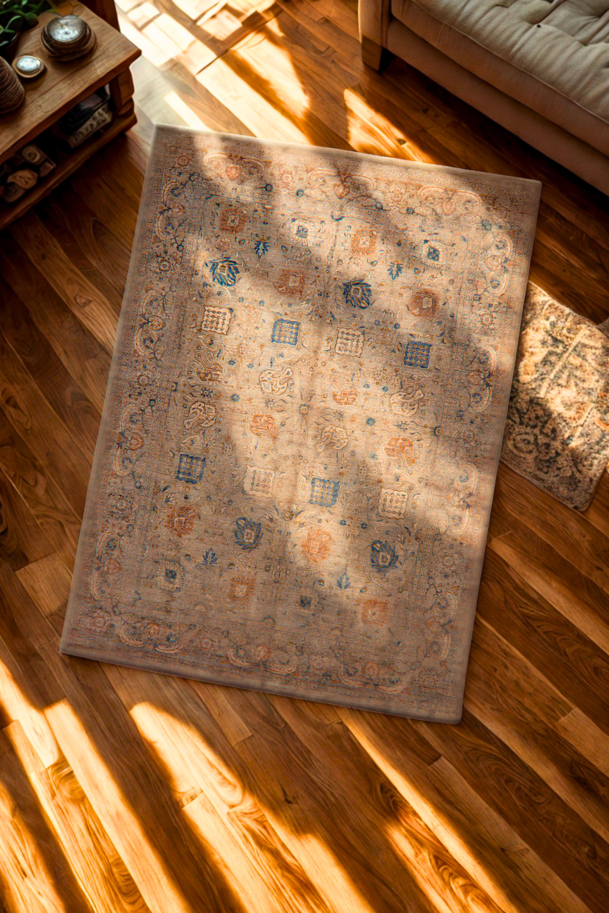 The intricate pattern is organized into a gentle grid of alternating floral blocks and stylized emblems, framed by an ornate curvilinear border that adds a sense of structure and balance. Its soft tone-on-tone aesthetic makes it ideal for upscale interiors seeking a graceful, understated focal point.