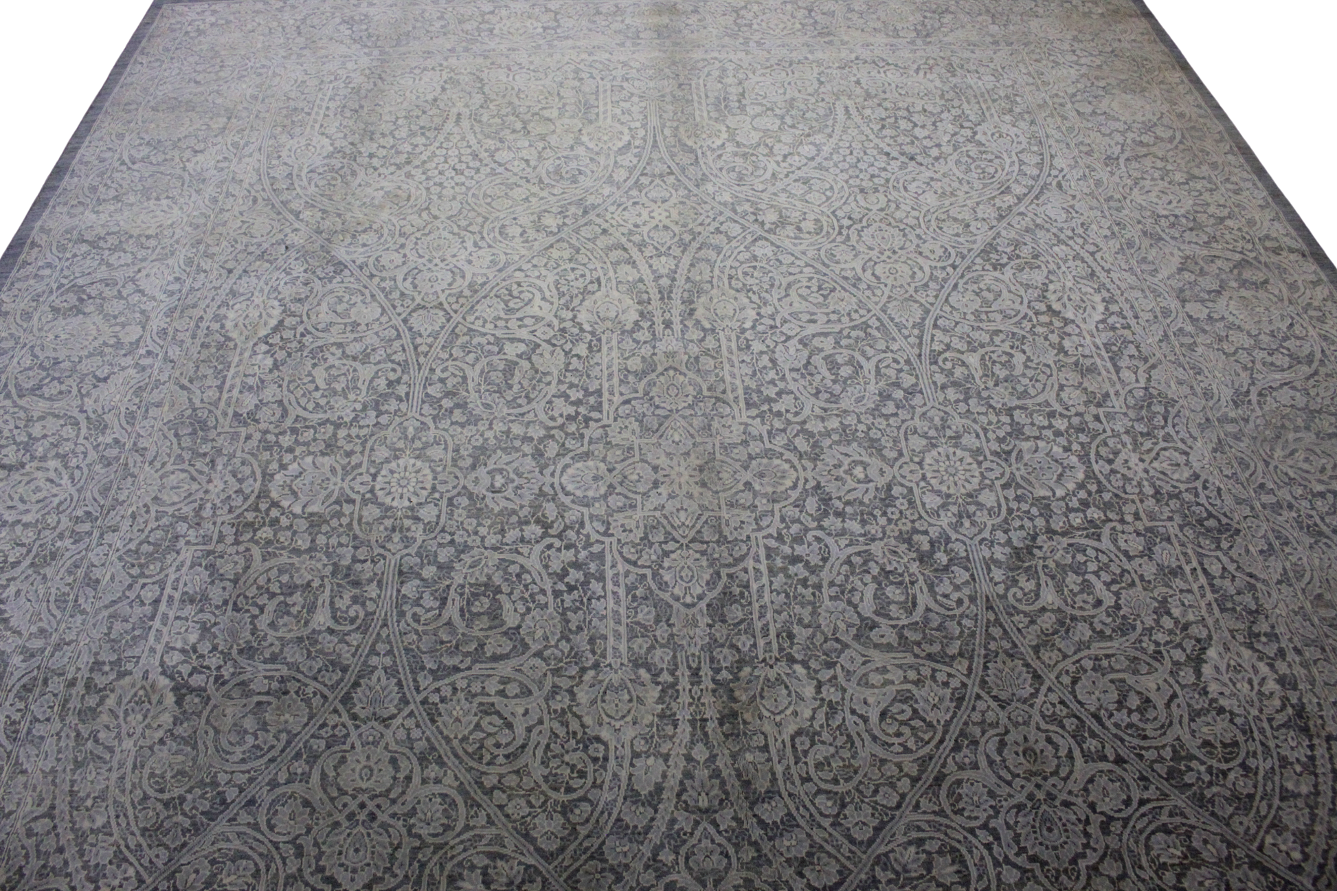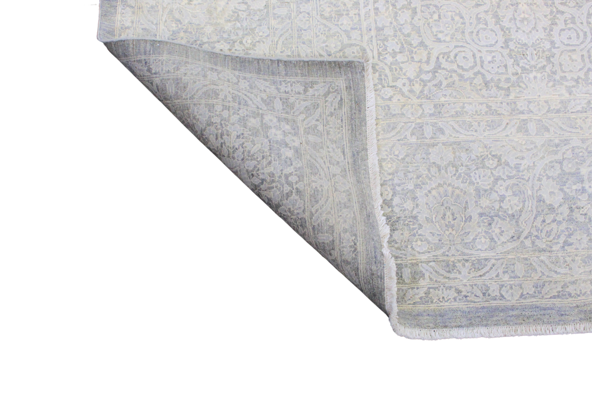 Refined and romantic, this Fine Tabriz Afghan rug (9.2 × 12.2 ft) is a true tapestry of grace. Its delicate allover pattern features a mesmerizing array of finely drawn vines, rosettes, and blooming palmettes, woven in soft silver-blue and washed ivory tones that blend into a serene visual rhythm. The light-on-light palette gives the rug a weathered elegance — like a garden veiled in morning mist.