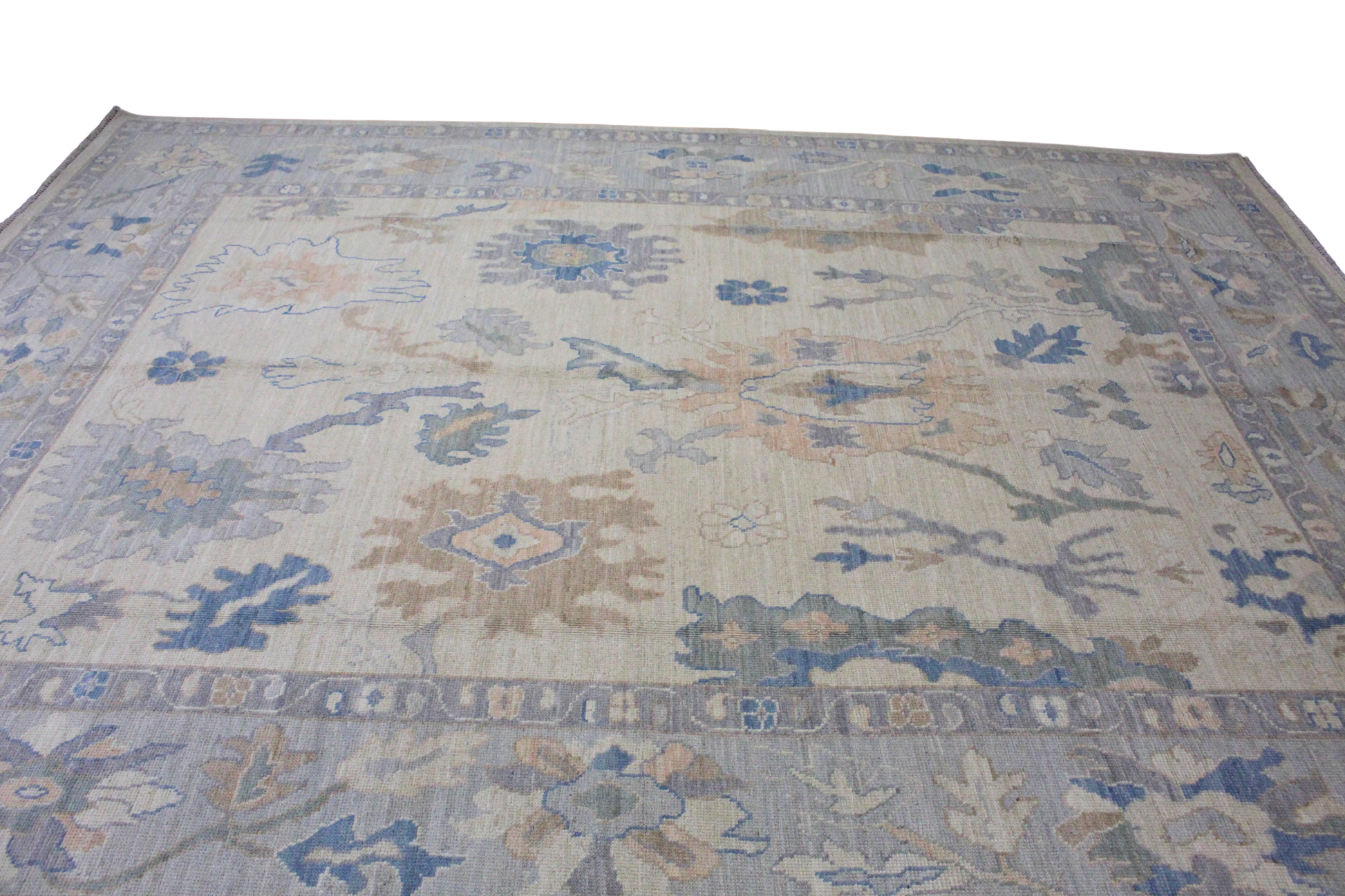 Subtle sophistication meets timeless design in this hand-knotted Oushak rug from Afghanistan, measuring 9.1 × 12.1 ft. Its soothing palette of misty blue, cool ivory, stone taupe, and faded teal evokes a tranquil, coastal atmosphere. The open field is adorned with loosely drawn floral medallions and angular vinework, framed by a wide, complementary border of abstracted blossoms and leaves.