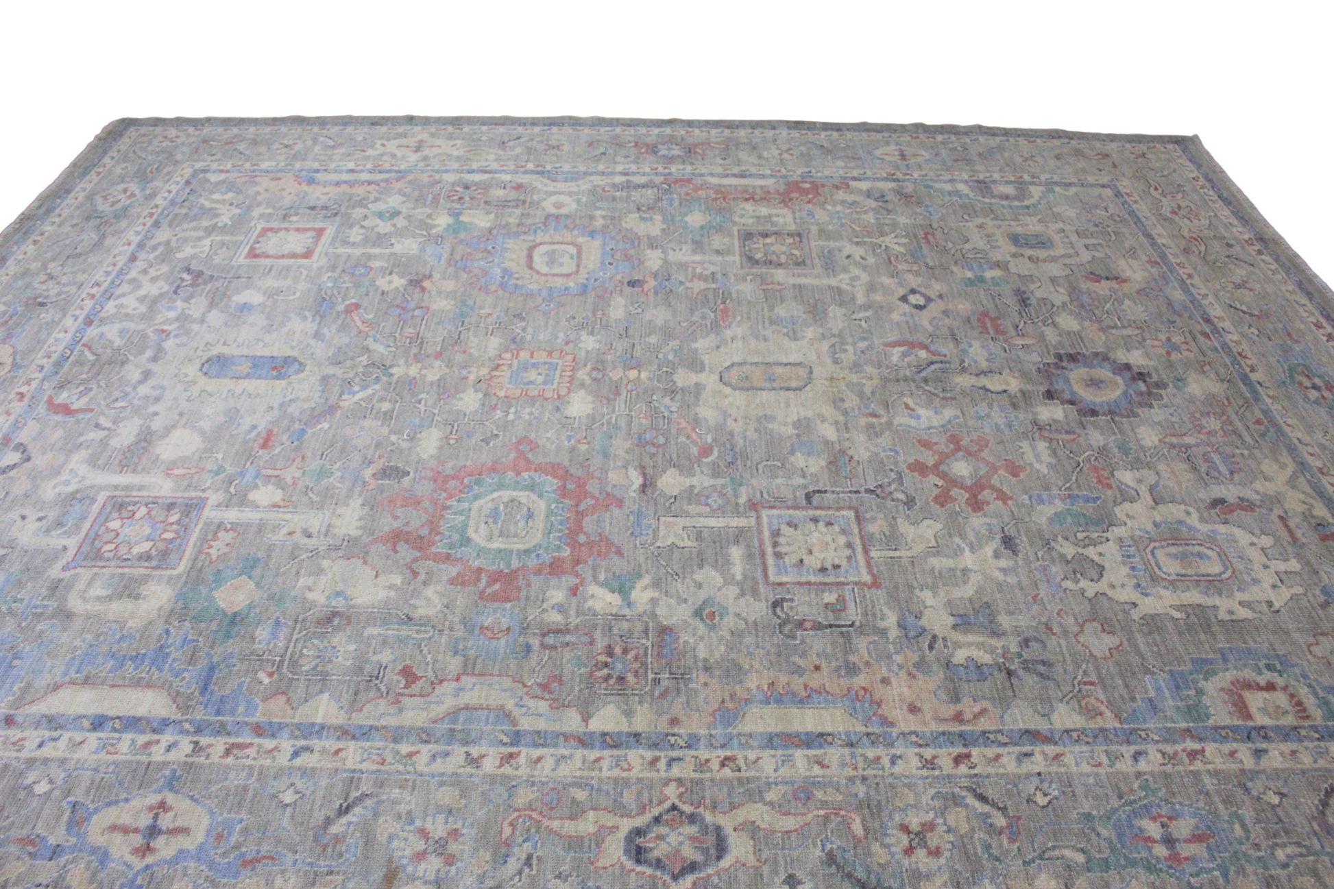 Rich in visual texture and cultural soul, this hand-knotted Afghan Oushak rug (9.3 × 11.8 ft) is a stunning blend of traditional motifs and modern restraint. The muted sage and blue-grey field is densely adorned with a mosaic of tribal elements — angular medallions, stylized rosettes, symbolic glyphs — all rendered in gently faded tones of coral red, deep indigo, parchment, pale turquoise, and soft gold.