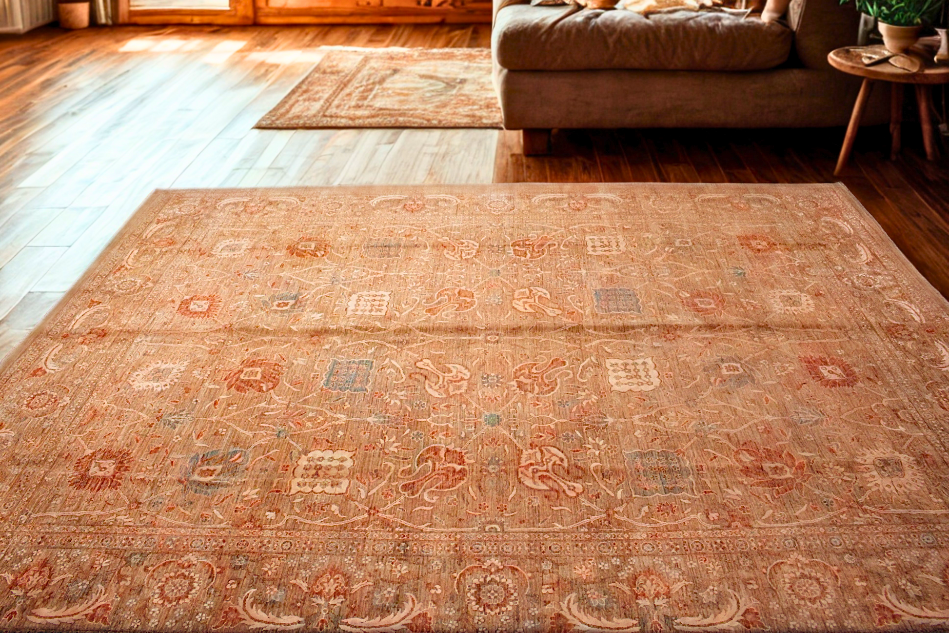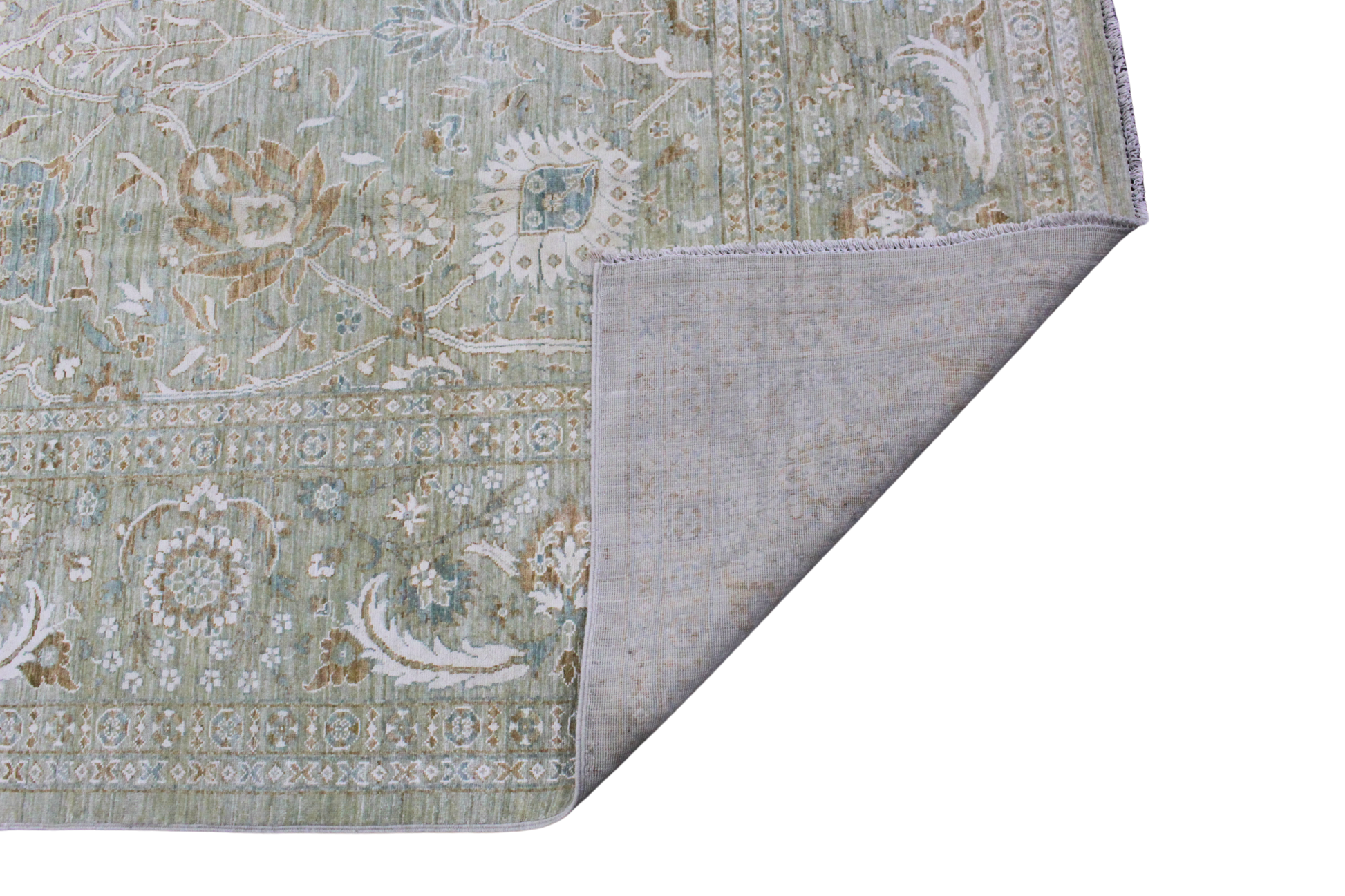 Elegant and finely detailed, this Ariana Afghan rug (8.9 × 11.5 ft) radiates refined tranquility with its soft sage green field and intricate botanical patterning. The all-over design features scrolling vines, palmettes, and floral medallions interwoven with exquisite symmetry — each detail rendered in a gentle palette of ivory, parchment, and faded caramel.