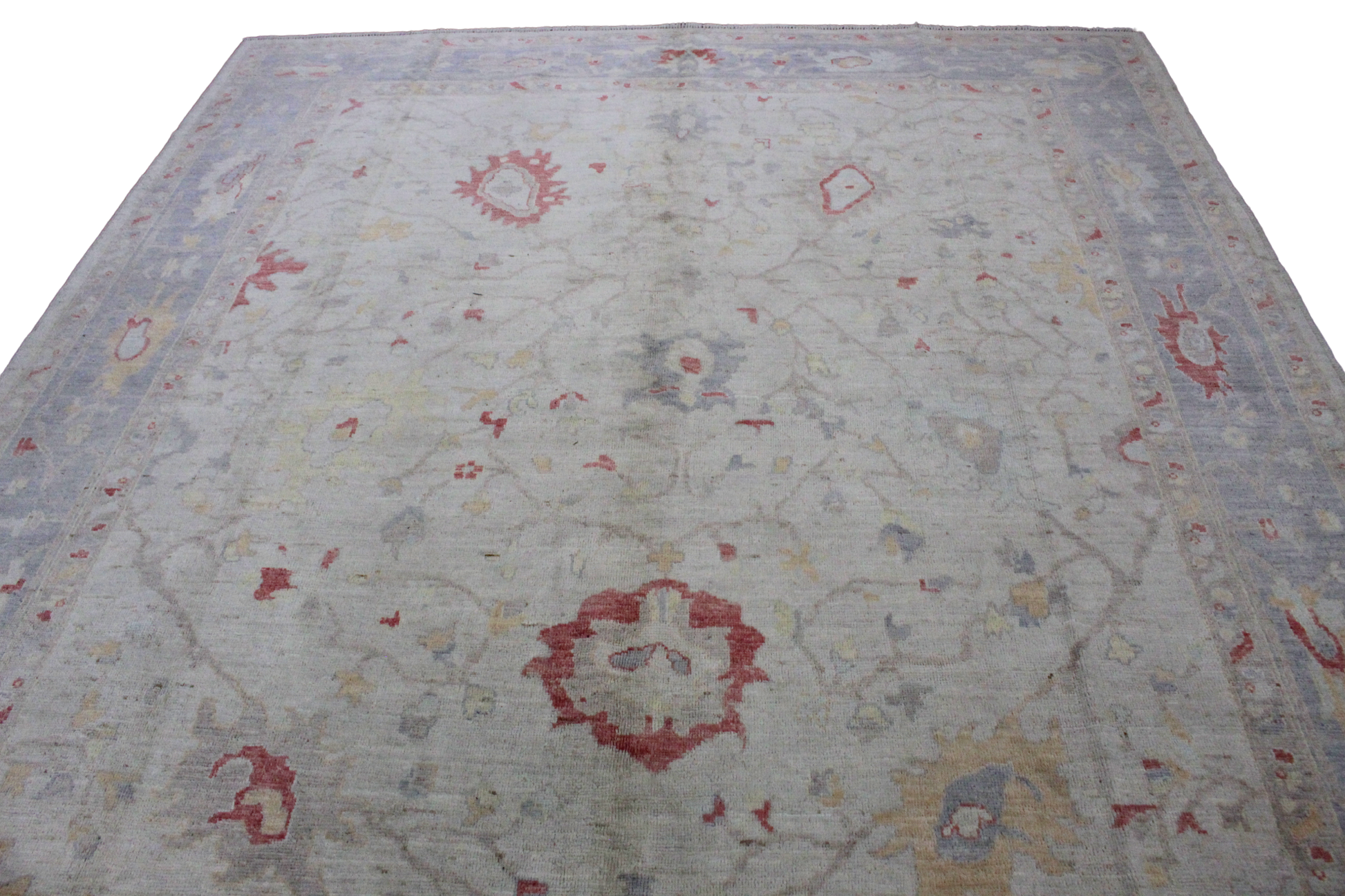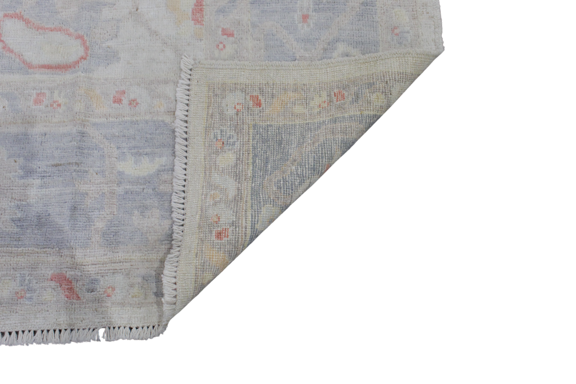 Infused with rustic charm and a gently aged patina, this hand-knotted Afghan Oushak rug (8.11 × 11.4 ft) brings a relaxed elegance to any interior. Its open, lightly drawn floral design floats across a washed ivory field, highlighted by soft coral reds, dusty golds, powder blue, and faint taupes. The wide border—rendered in faded sky blue—frames the composition with a weathered grace.