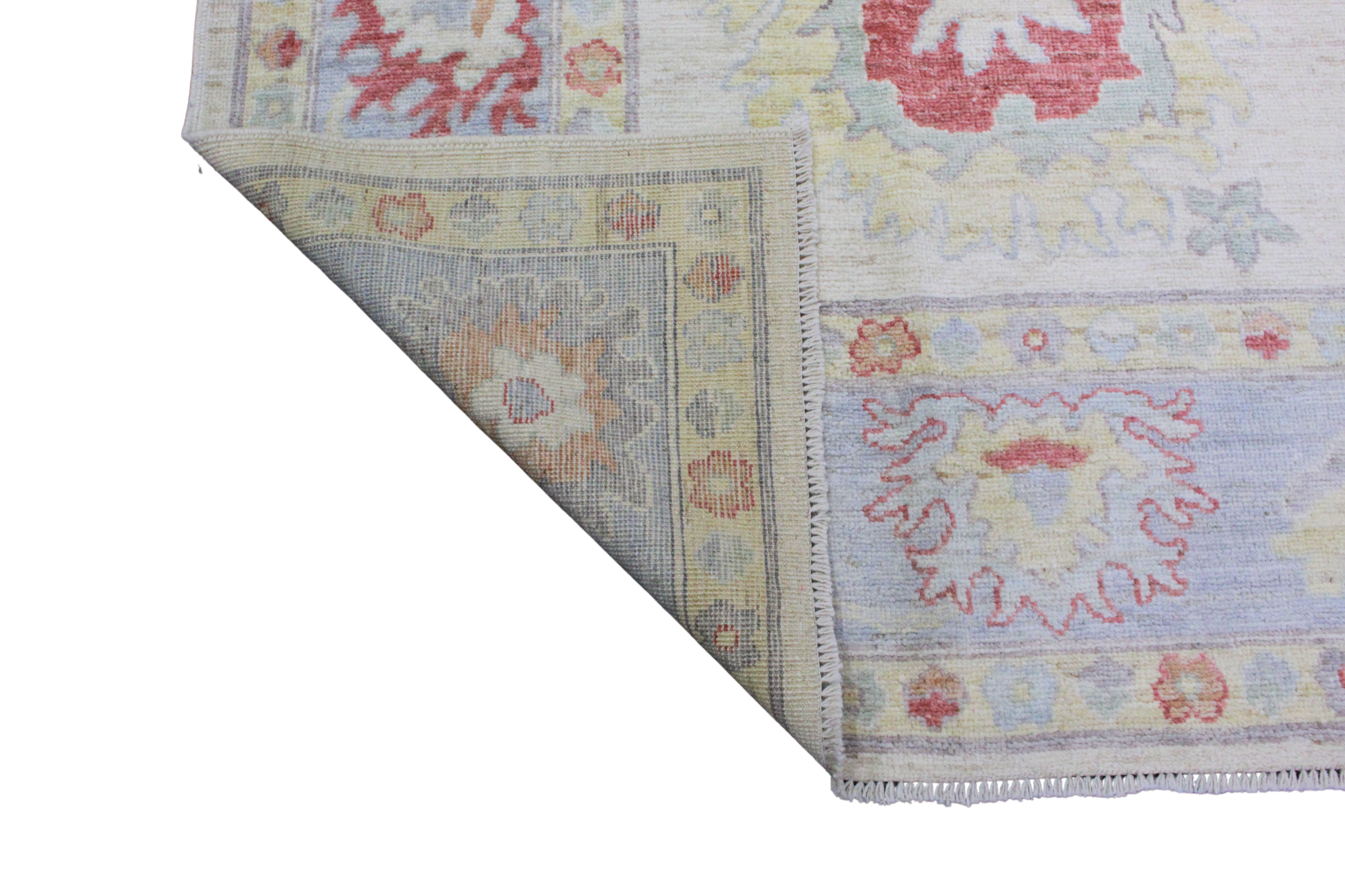 Bright and uplifting, this hand-knotted Afghan Oushak rug (8.10 × 11.10 ft) captures the playful elegance of classic Anatolian design in a joyful palette. Bold floral medallions and stylized botanical motifs dance across an ivory field, highlighted in soft pastel tones of butter yellow, coral, faded red, sky blue, and mint green. The wide powder-blue border completes the composition with a light, airy touch.