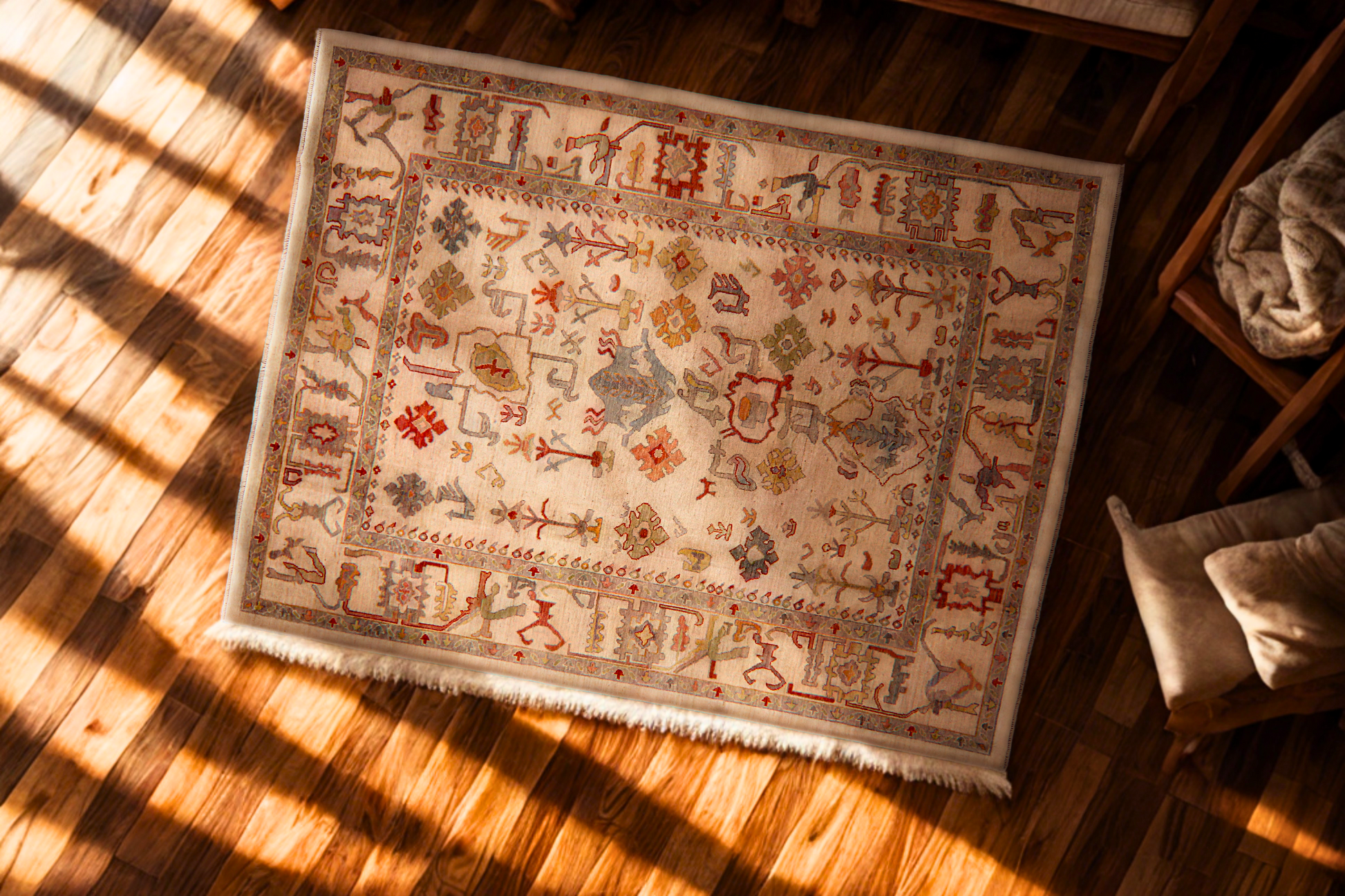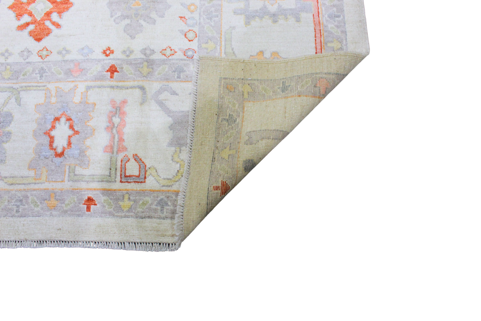 This charming 9 × 12 ft Oushak rug from Afghanistan strikes a delightful balance between whimsy and tradition. Featuring a tribal-inspired layout of angular floral and geometric forms, the rug is brought to life by a warm ivory field paired with muted sky blues, coral reds, soft greens, and dusty lavenders. The border mirrors the interior’s vibrancy with a series of highly stylized shapes and symbols, adding rhythmic framing to the freeform composition.